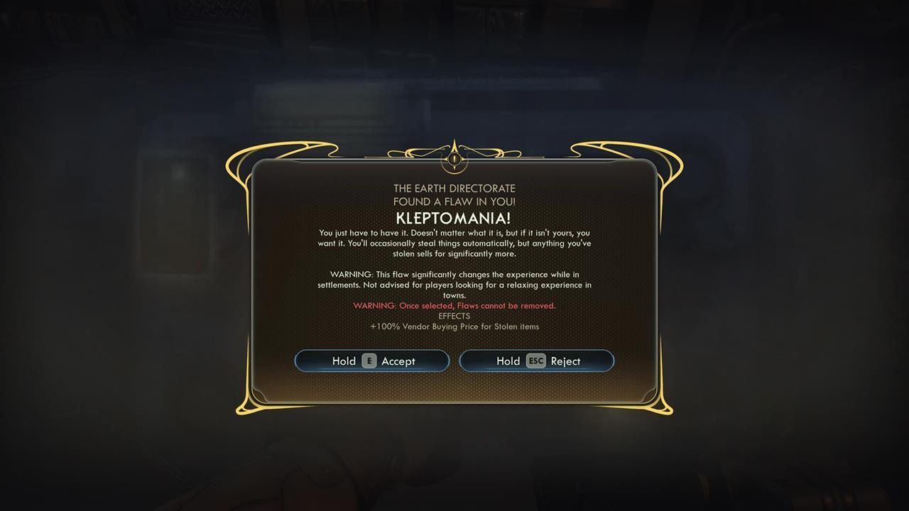 Выбор: отказаться. Этот недостаток также сопровождается предупреждением, что его следует избегать в первом прохождении. Мы опасаемся последствий для репутации фракций и появления наград за поимку, особенно если персонаж внезапно начнёт хватать вещи на глазах у NPC.