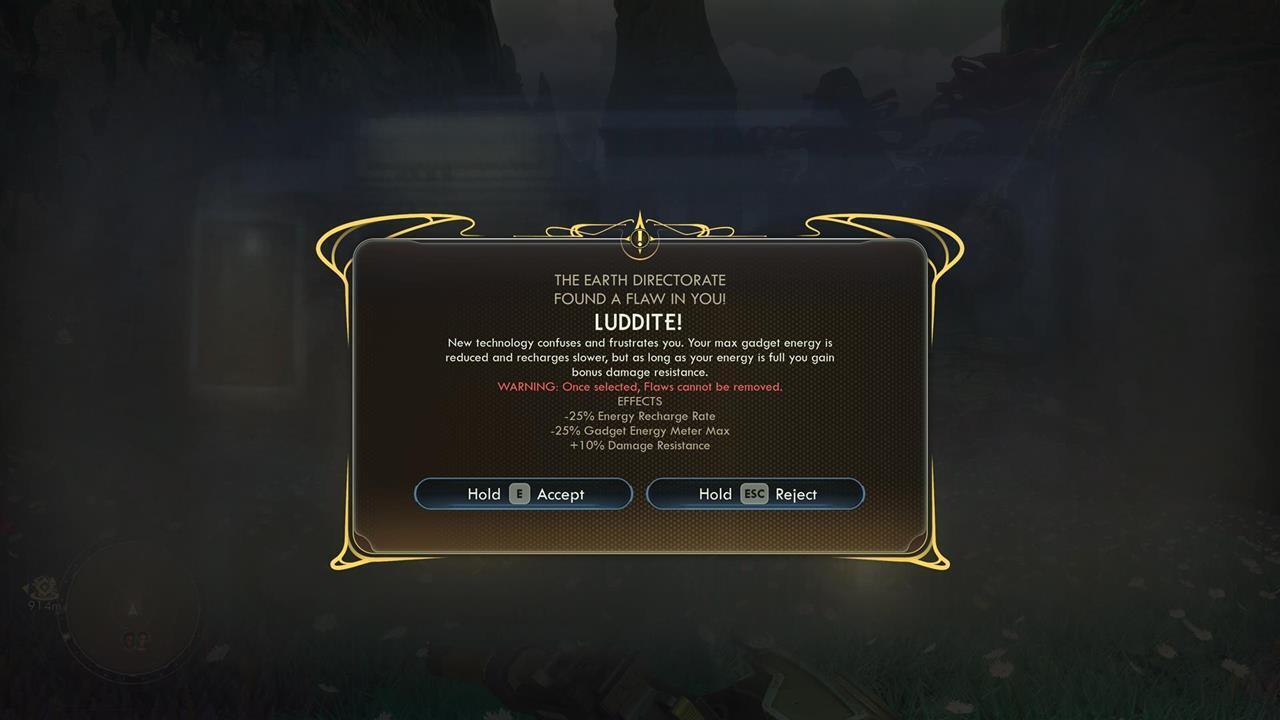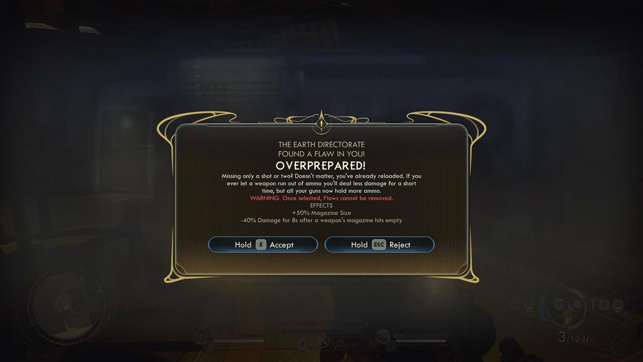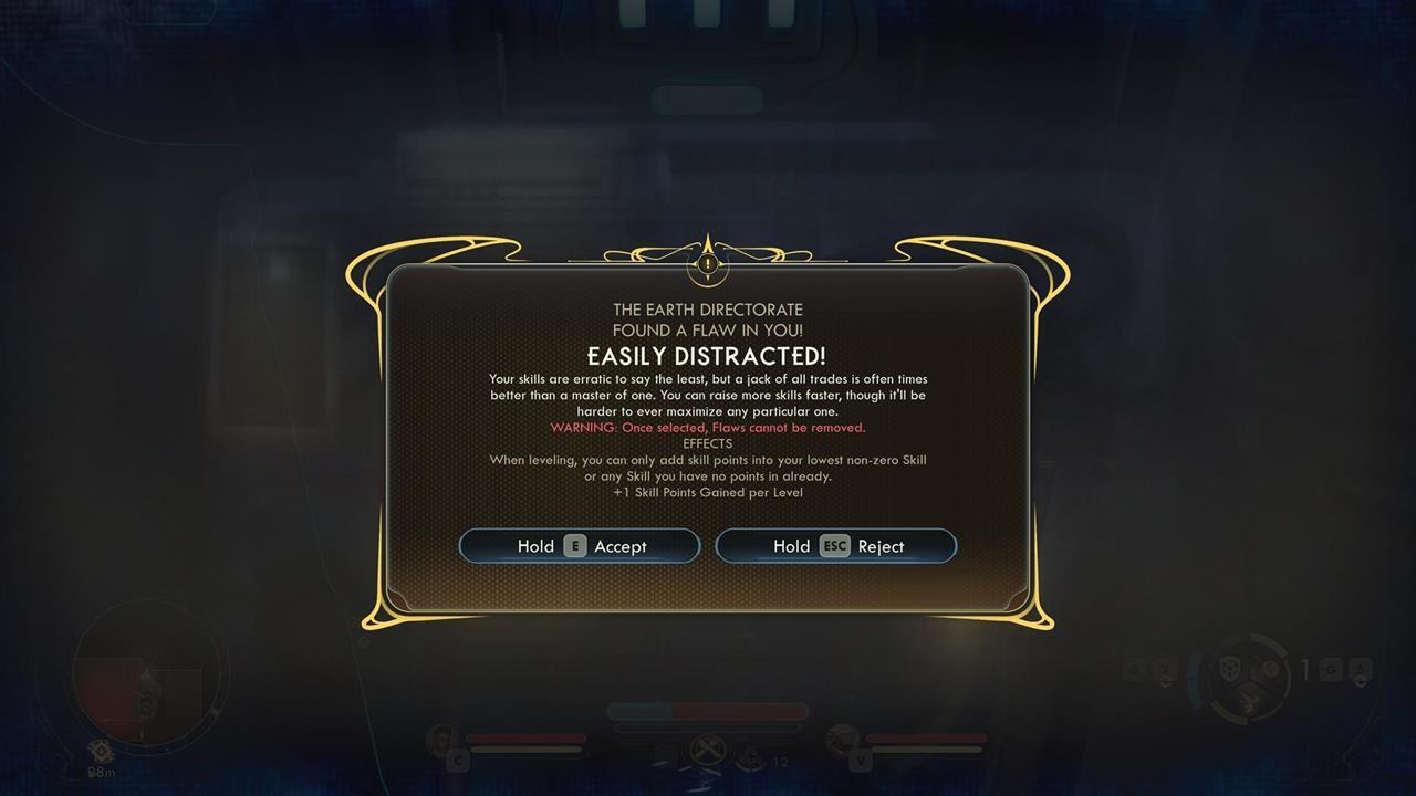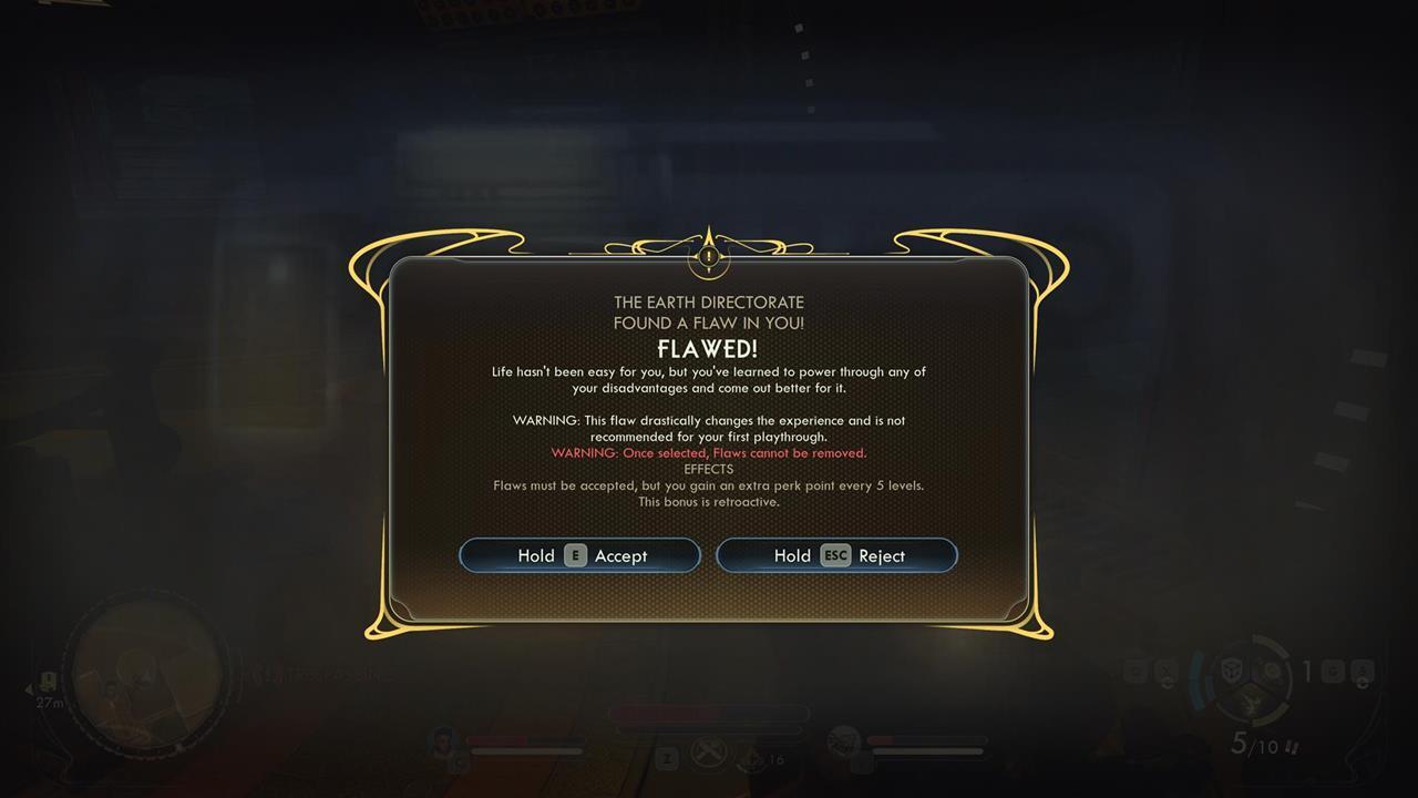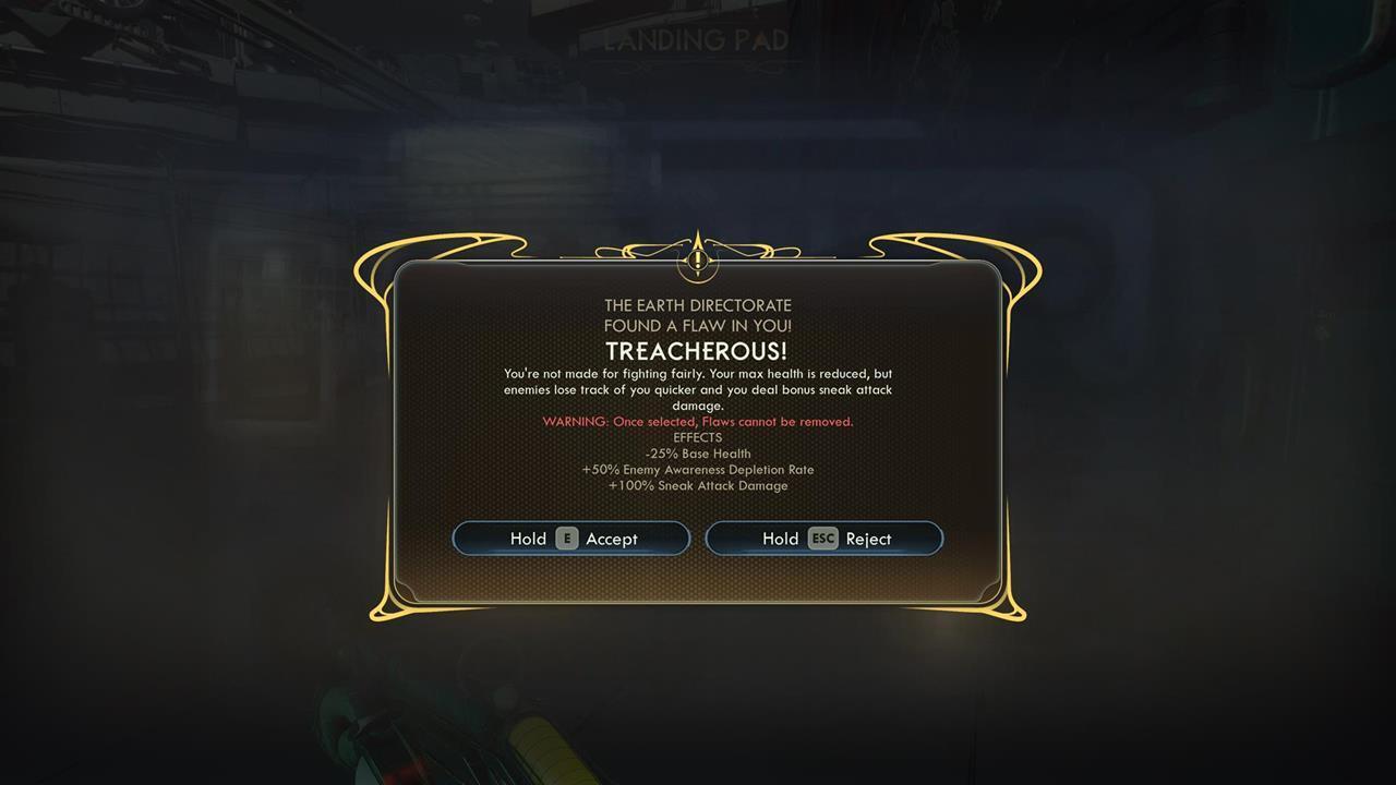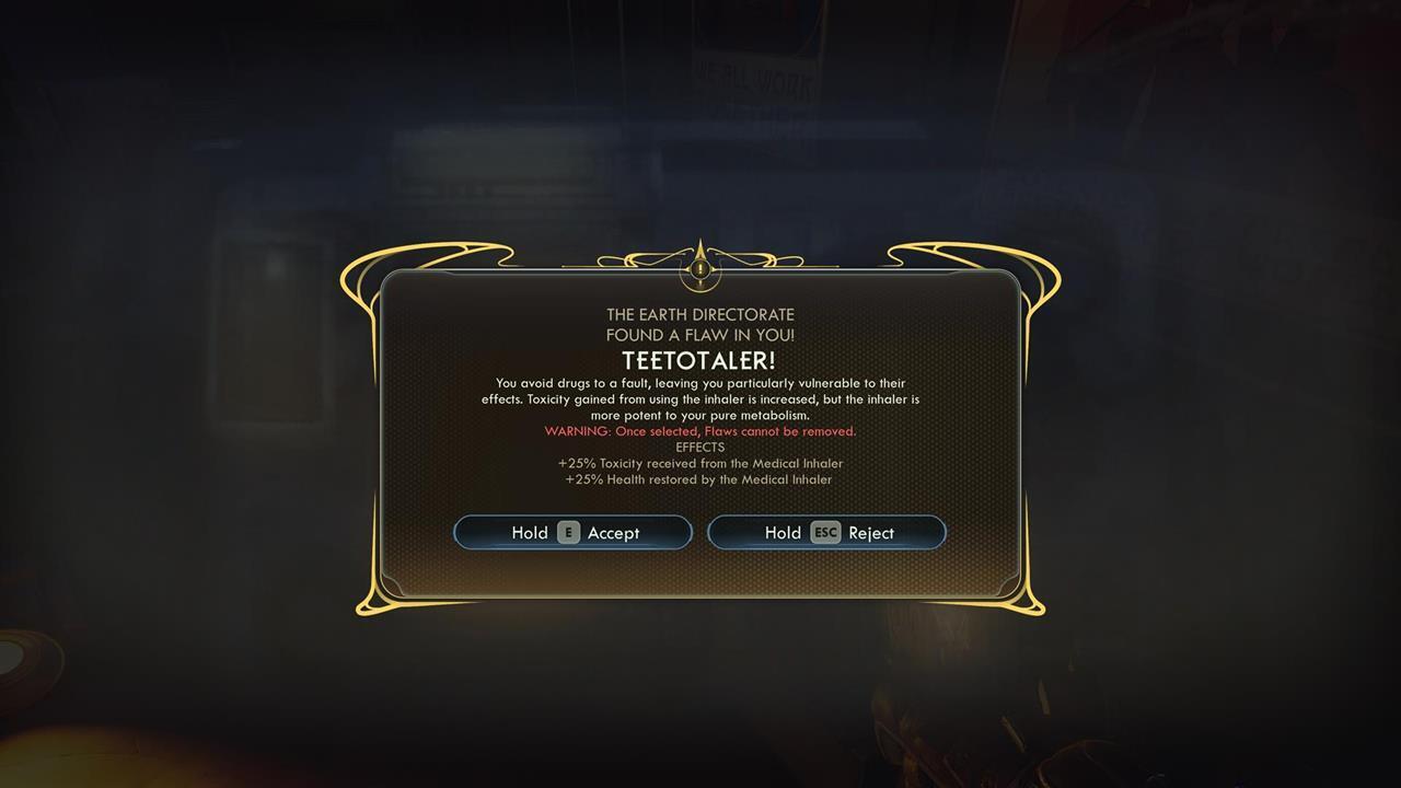 Выбор: отказаться. Всплывающее окно даже предупреждает, что этот вариант — плохая идея для первого прохождения. Но если вы уже прошли игру и хотите пробежку, где принимаете все недостатки подряд, то этот выбор обязателен.