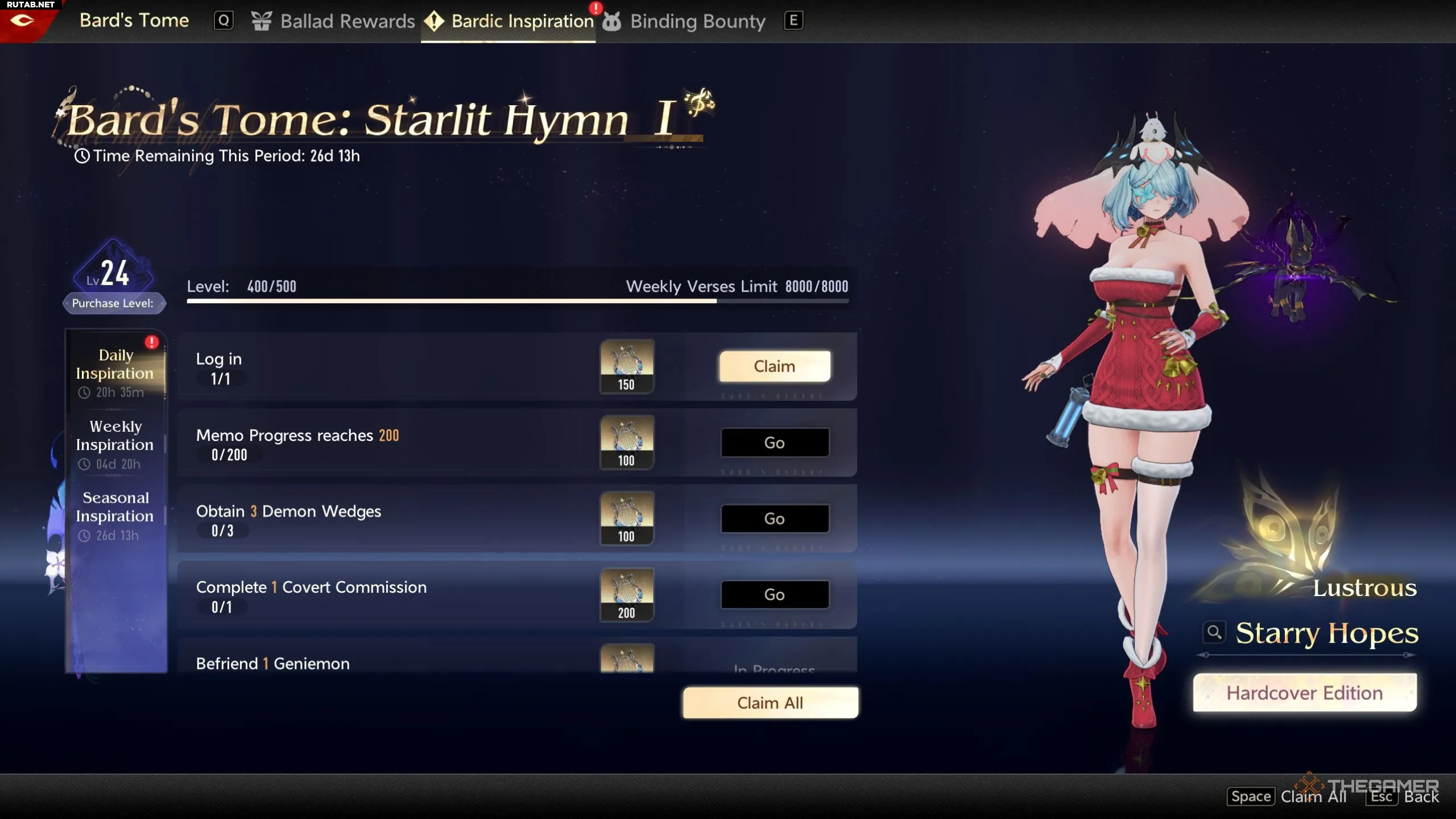 - Выполнение ежедневных, еженедельных и сезонных вдохновений в разделе «Вдохновение Барда». Ежедневные и еженедельные задания сбрасываются каждый день и неделю соответственно, а сезонные действуют на протяжении всего времени работы пропуска.