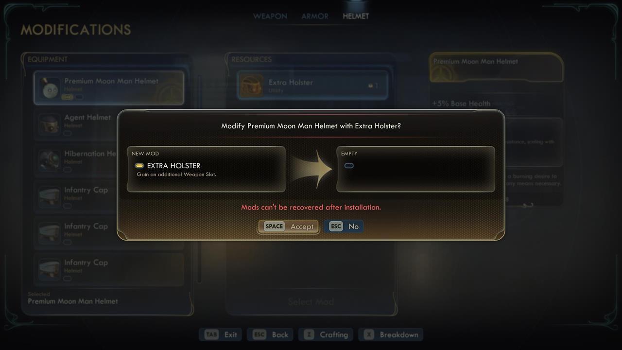 Для установки модов необходимо использовать верстак и выбрать меню «Модификации». Важные особенности: