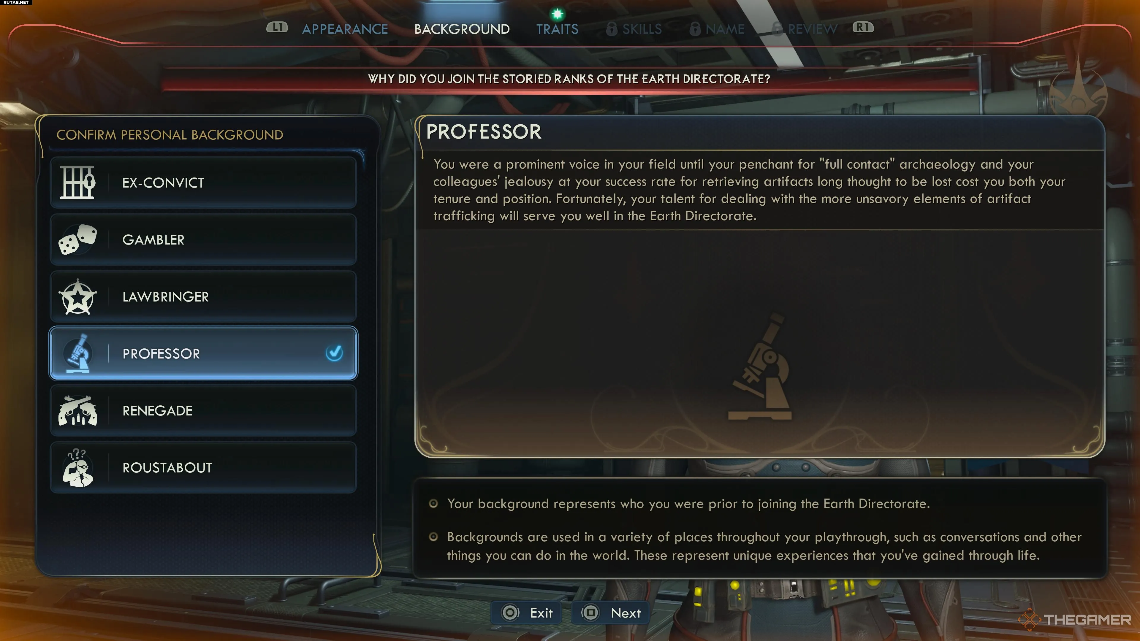 В начале игры вы должны выбрать предысторию для своего персонажа. Ваш герой не появился из ниоткуда — у него была полноценная жизнь до вступления в Земную Директорию. Именно это и позволяют отразить предыстории.