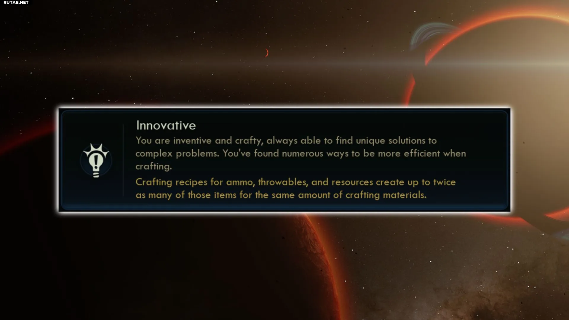 С чертой «Новаторский» вы будете создавать вдвое больше метательных снарядов, ресурсов и патронов при крафте. Выбирайте эту черту, если играете за бойца, чтобы ваши магазины всегда были полны.