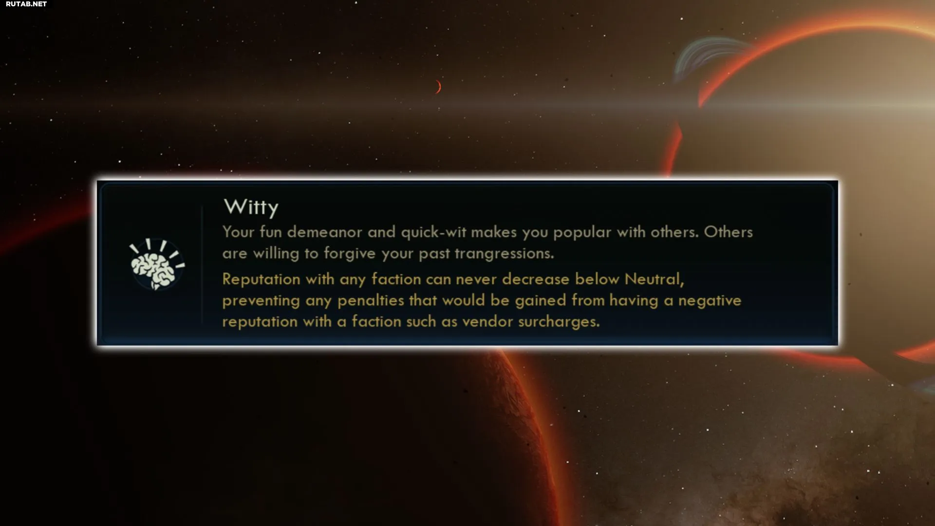 Однако если вы не совершаете преступлений и не саботируете три основные фракции, эта черта практически не влияет на игровой процесс. Единственное преимущество черты «Остроумный», полезное для любого билда — множество уникальных диалоговых опций для ролевой игры.