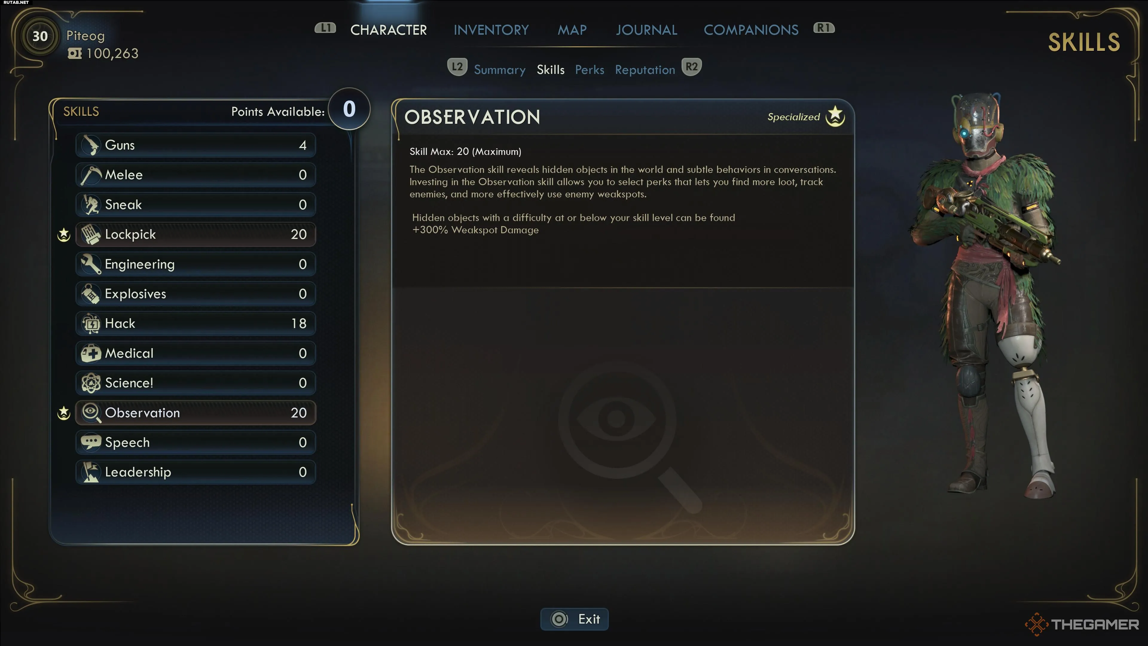 | Наблюдение | Позволяет находить секретные объекты и замечать тонкости в поведении людей. Каждый уровень даёт +15% к урону по уязвимым местам и позволяет находить скрытые предметы вашего уровня или ниже. | Позволяет находить секретные проходы для коротких путей (shortcuts) или доступа к недоступным зонам. Иногда появляется в диалогах. |