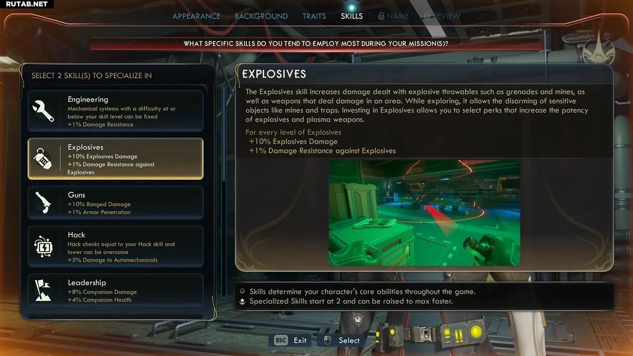 На следующем этапе вы можете выбрать два навыка для специализации (по умолчанию). Среди них: Взлом (открытие запертых контейнеров и дверей), Хакинг (взлом паролей на терминалах), Лидерство (увеличение урона и здоровья спутников), Огнестрельное оружие (повышение урона от огнестрельного оружия) и другие.