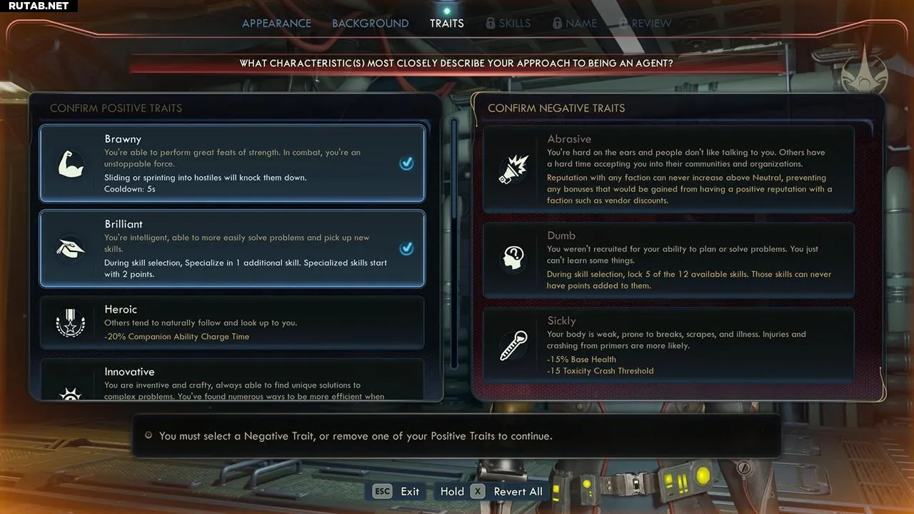 - Черты — дают бонусы и новые варианты взаимодействия. Можно выбрать либо одну положительную черту, либо две положительные черты вместе с одной отрицательной. Рекомендуем второй вариант, особенно если эффект отрицательной черты можно компенсировать.