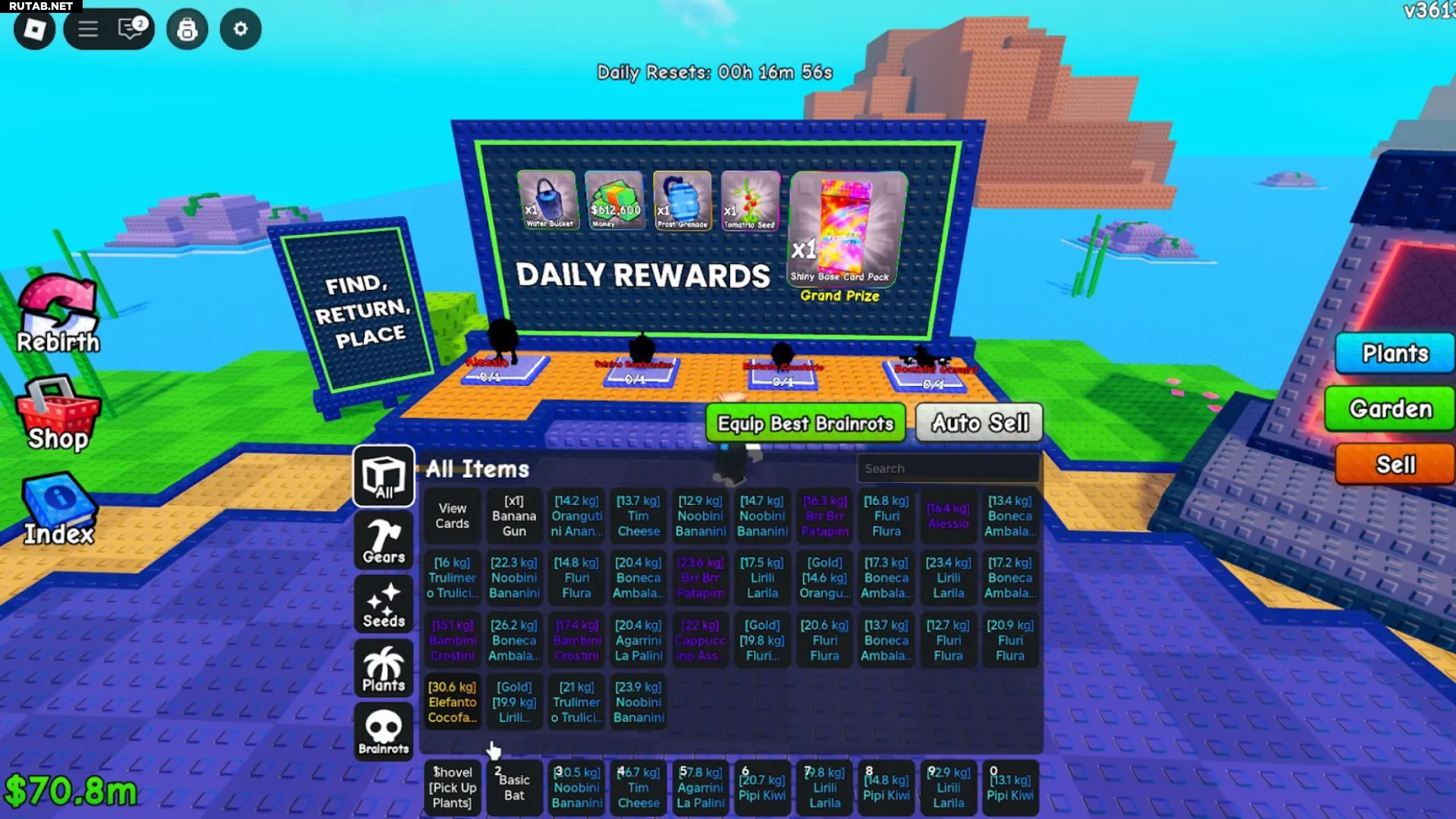 - Bloom Bank — сохраняет 10% дохода и утраивает заработок после победы над 500 Brainrots.