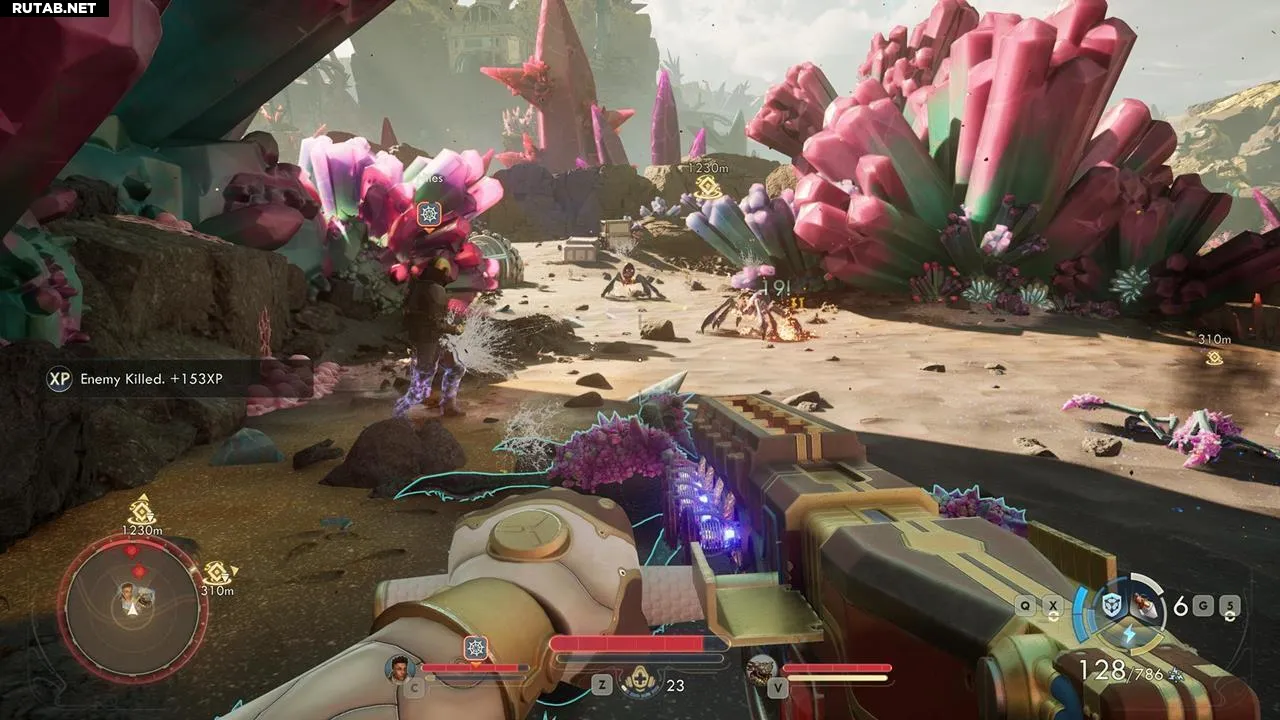 - Имплантат краббла — её первый выстрел оставляет лужу плазмы, которая наносит урон противникам в области.