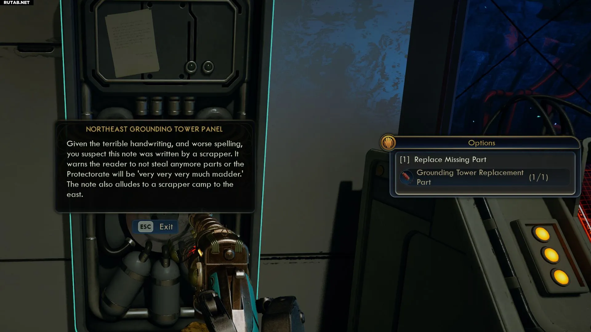 - Особенности локации: На Заземляющей станции в этом месте отсутствует деталь. Чтобы её найти, отправляйтесь на восток, в лагерь Скрапперов. Устраните Скрапперов, возьмите Запасную деталь со стола и установите её в порт на станции, чтобы активировать терминал.