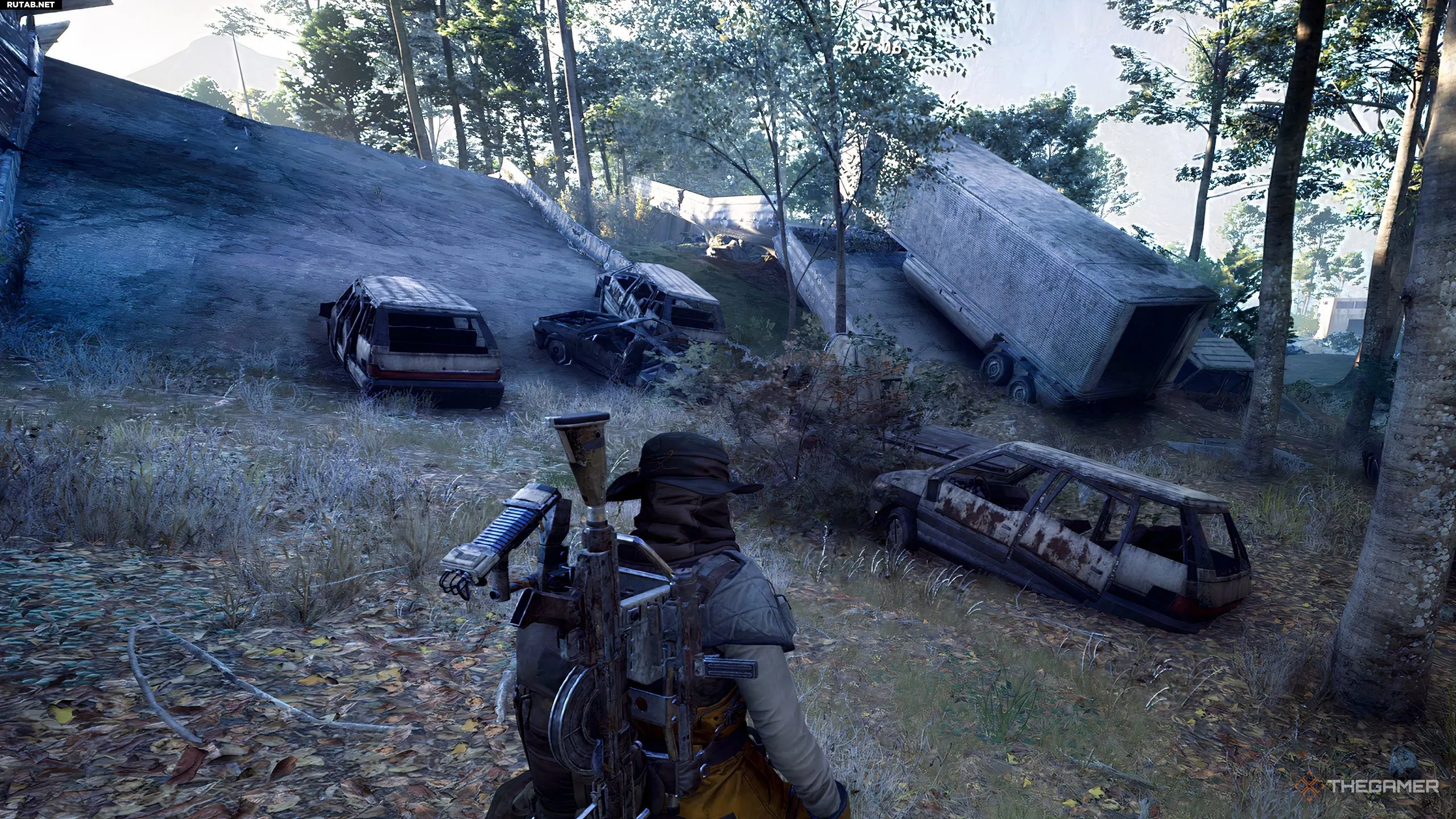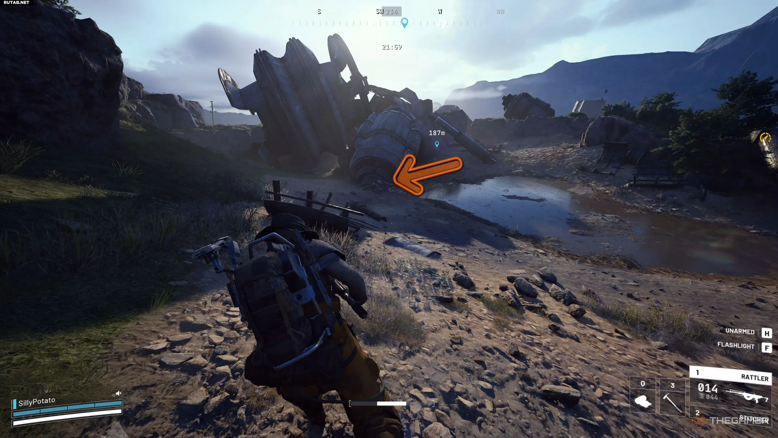 Добравшись до шоссе, найдите участок, где оно разрушено и одна его часть опустилась почти до земли. Это место расположено чуть ниже надписи «Шоссе» на карте. На земле, у разлома, вы увидите жёлтый значок для съёмки. Взаимодействуйте с ним, чтобы завершить первую часть задания.