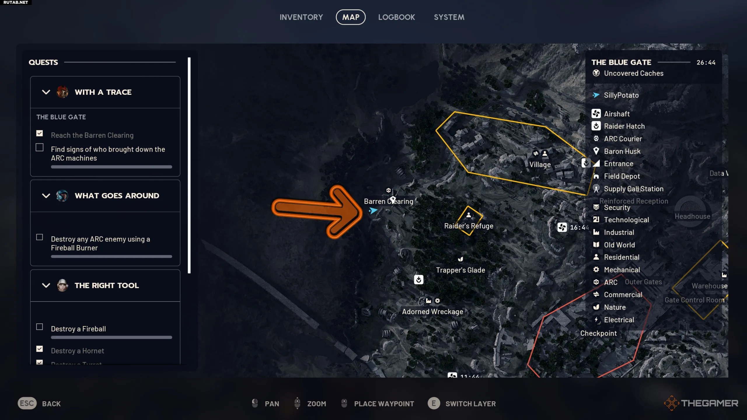Для первой части задания «По следу» вам нужно направиться в район Barren Clearing на карте Синих Ворот, который находится на западной стороне к юго-западу от огромной территории Деревни. Вам нужно приблизить карту, чтобы увидеть эту область. Когда вы доберетесь туда, вы найдете гигантскую разрушенную машину Арк в центре.