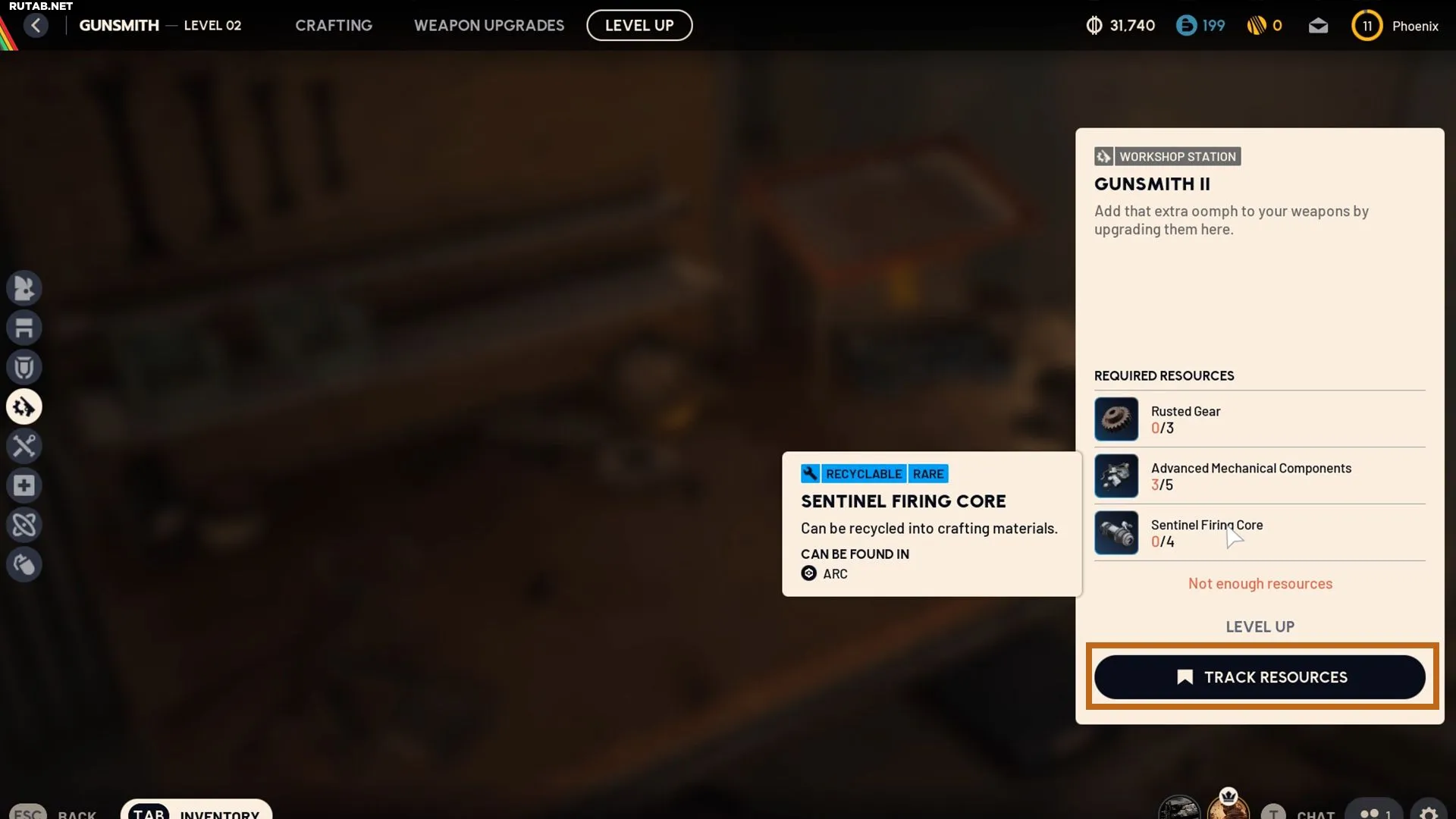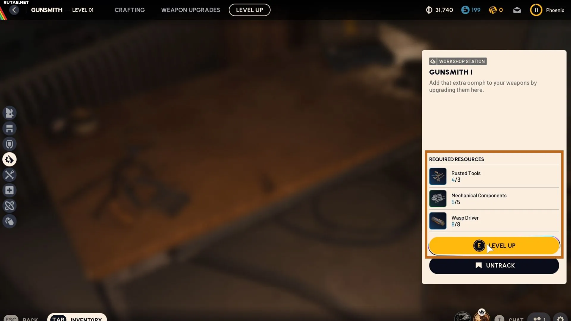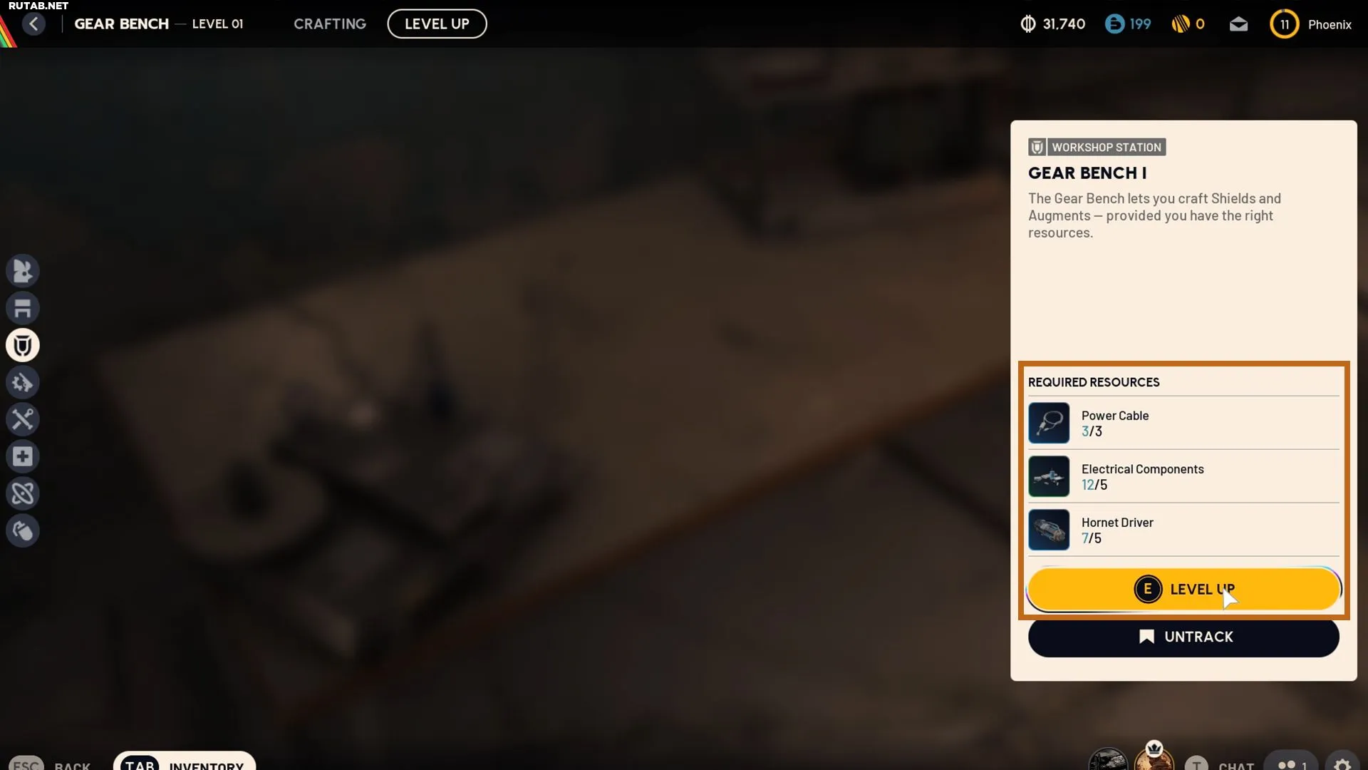 Чтобы улучшить верстак, перейдите во вкладку «Улучшение» в меню станций. Там указаны необходимые ресурсы. Вы можете отслеживать их — рядом с нужными предметами появится значок глаза, который поможет заметить их во время рейда.