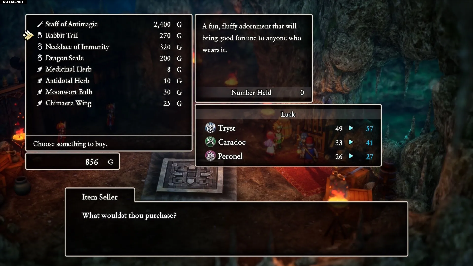 Кроличий Хвост — это аксессуар, повышающий удачу персонажа. Высокий показатель удачи в Dragon Quest 2 Remake увеличивает шанс критических ударов и выпадения предметов с врагов. Информацию о дропе монстров можно посмотреть в соответствующем разделе. Если не хотите полагаться на случайность, Кроличий Хвост можно купить у торговца в святилище к западу от Мунбрука — это ранняя локация.