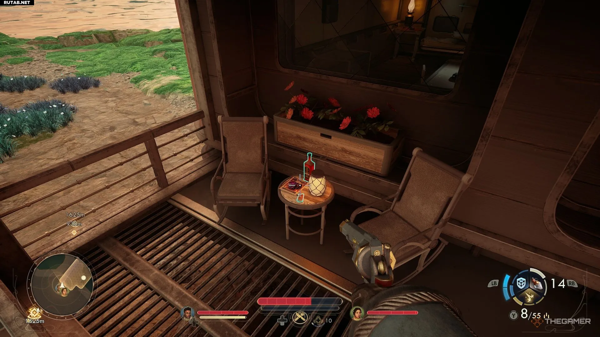 Заберитесь на небольшую террасу сбоку от здания, перепрыгнув через перила. Журнал лежит на маленьком столике.