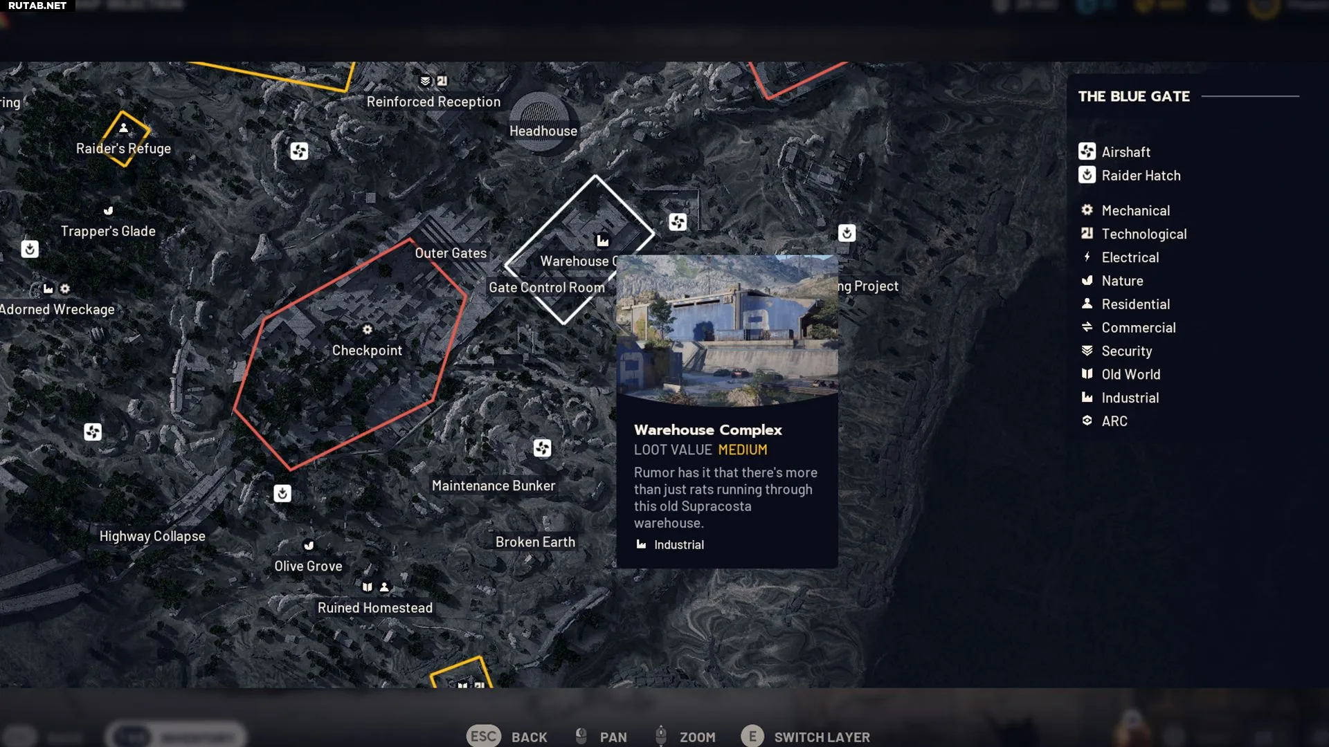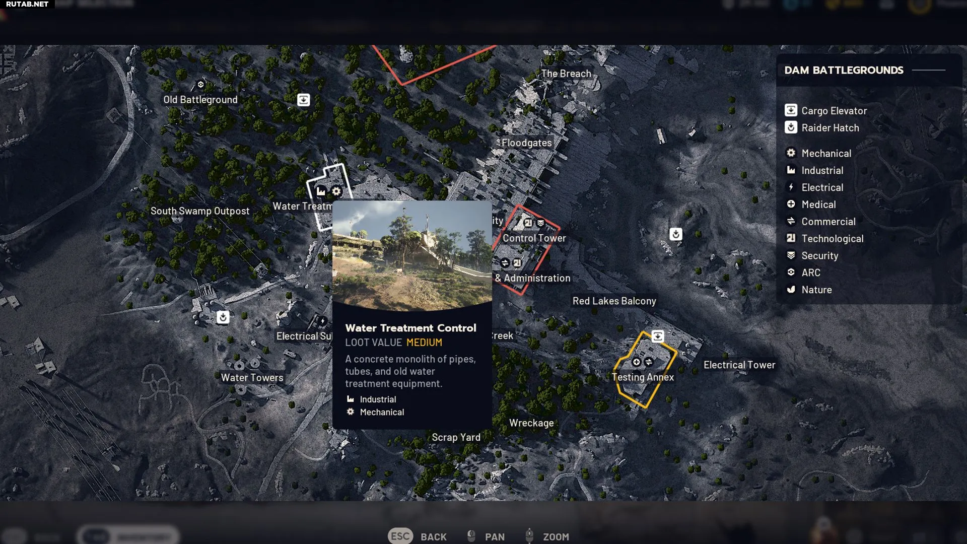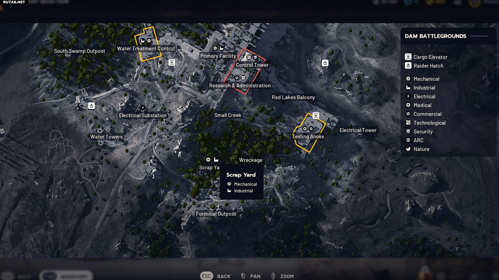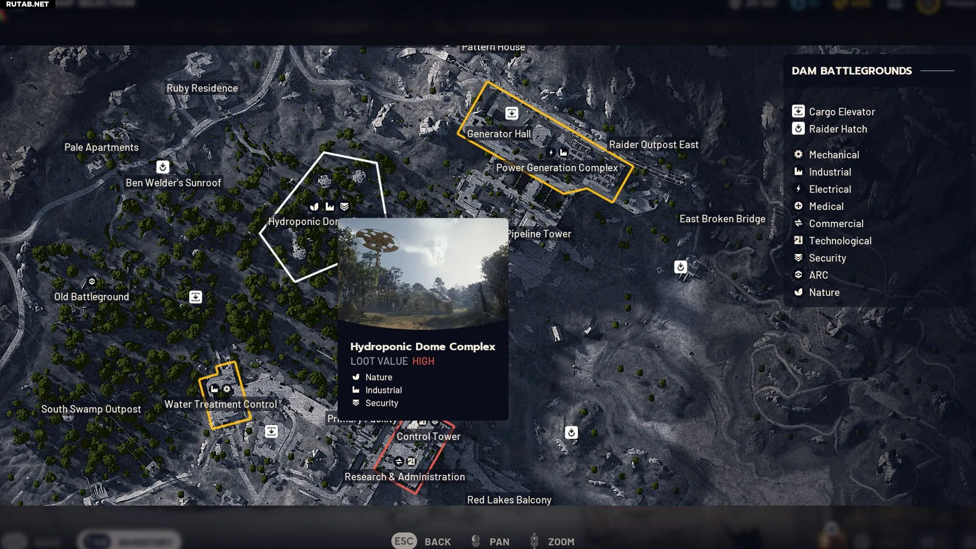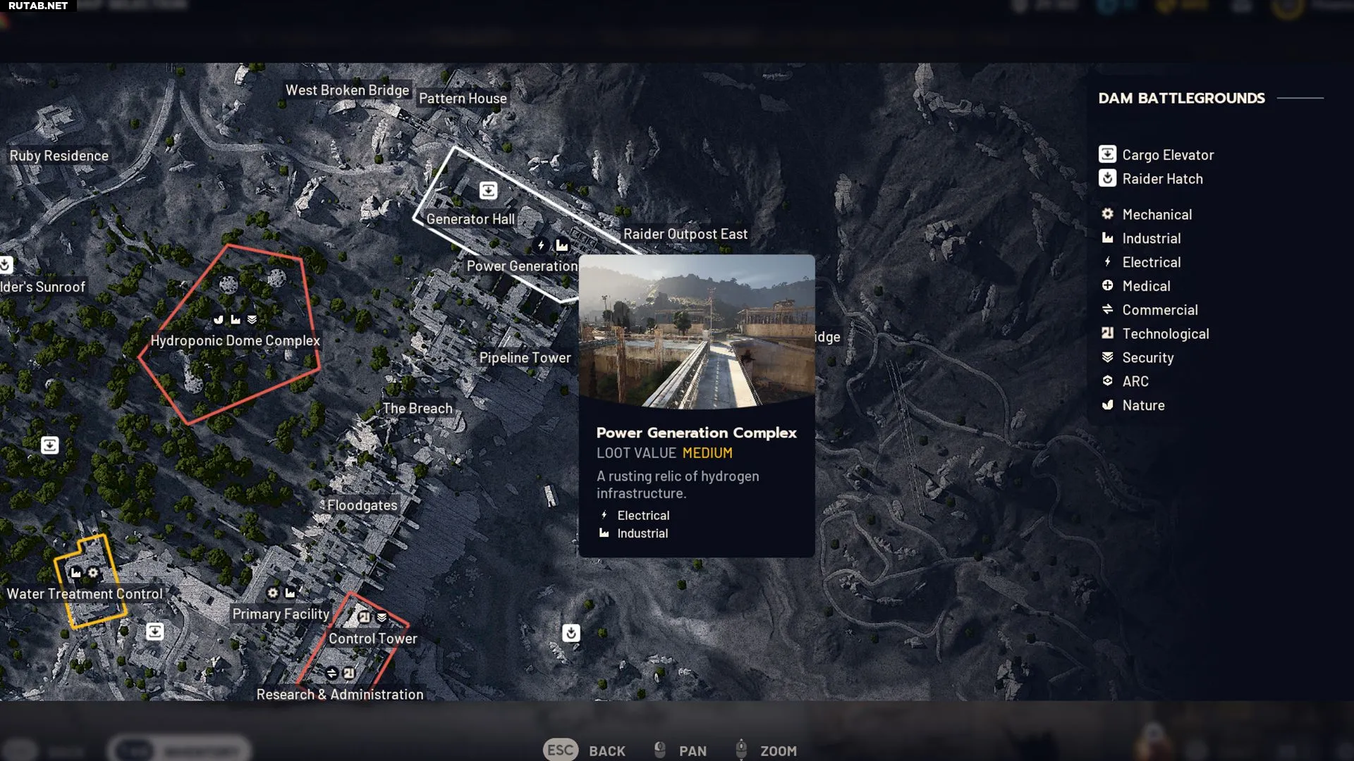 - Поле боя у дамбы — игроки всегда начинают рейд рядом с промышленной зоной. На севере расположены Комплекс энергогенерации и Гидропонный купол, на юге — Свалка и Контроль водоподготовки.