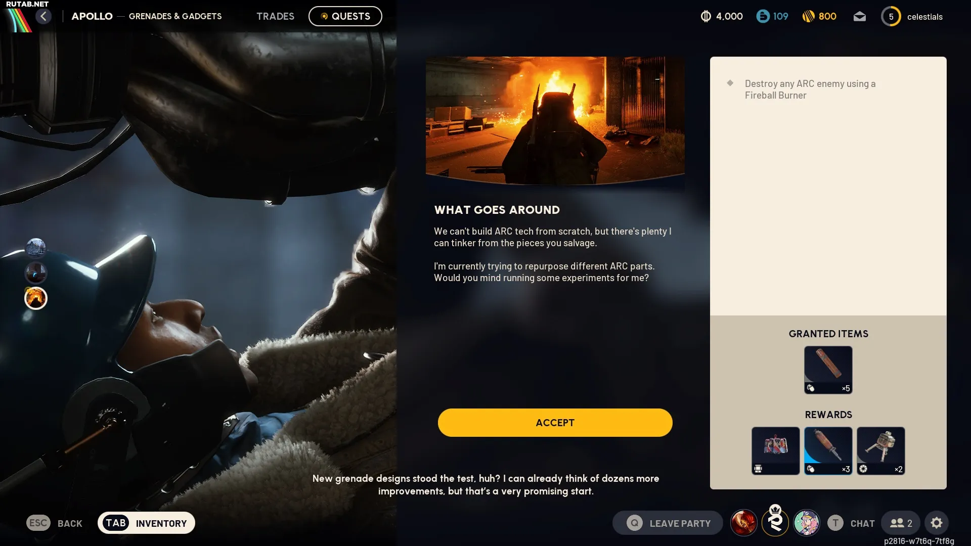 Достаточно выполнить задание один раз. После успеха получите награду у Apollo: три Огненные гранаты, две Шумовки и уникальный косметический аксессуар для рюкзака.