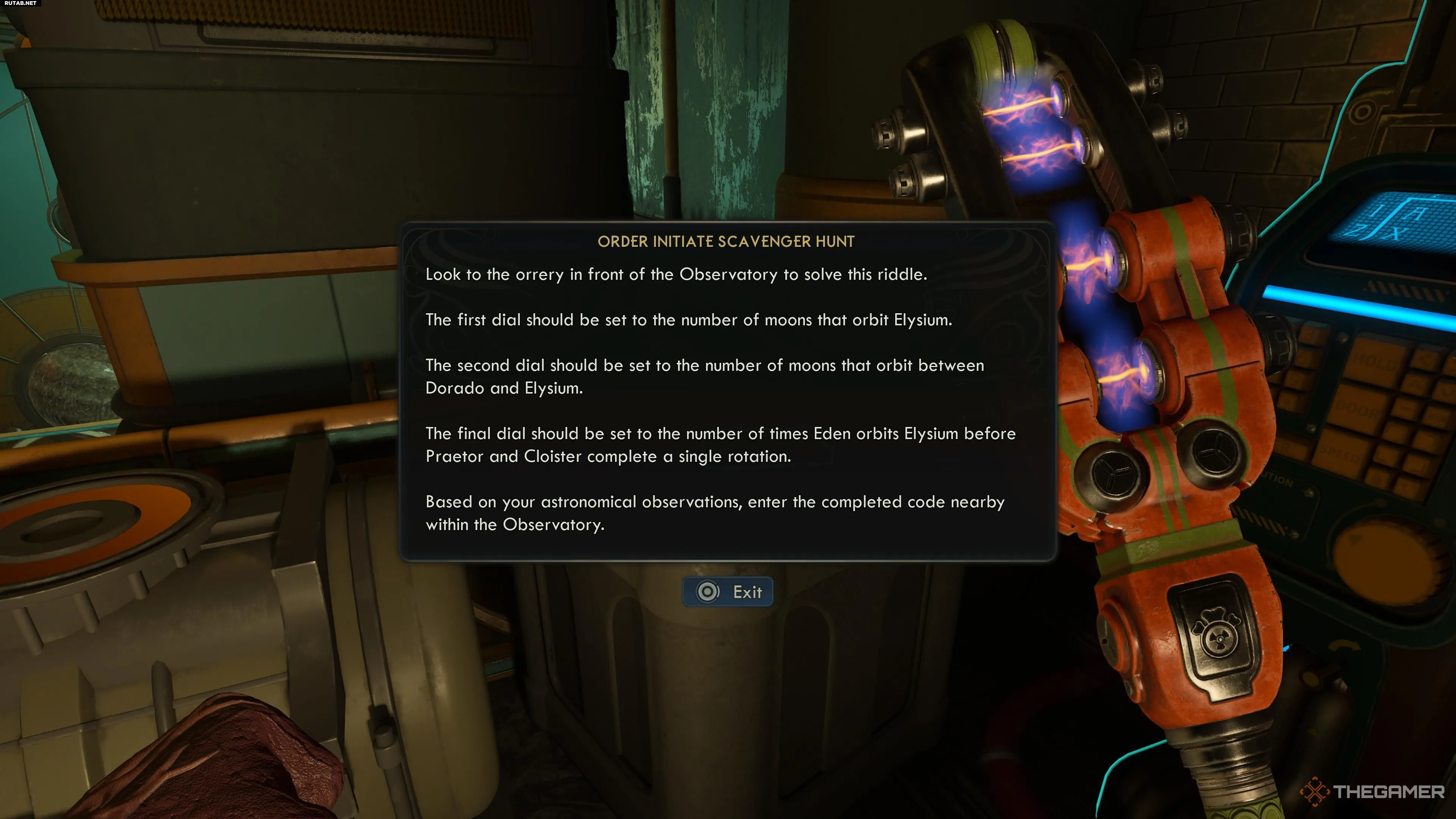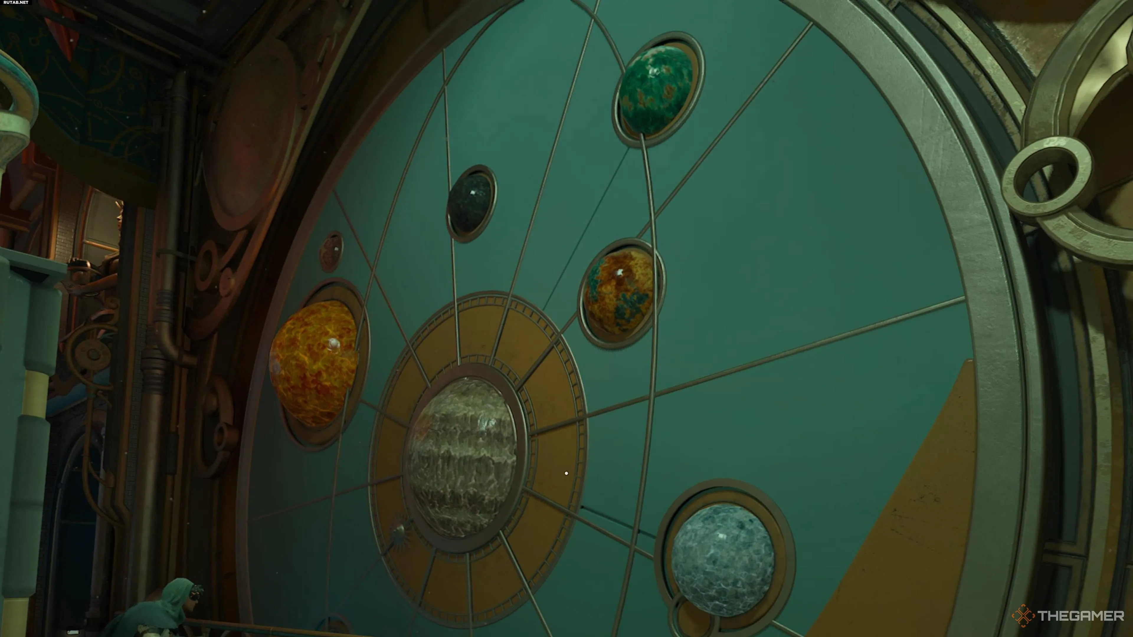 Оррери — это модель, которая имитирует движение объектов в звёздной системе. В этой комнате есть небольшой оррери, но он не совсем функционален. Зато снаружи, в большом дворе, находится полноразмерный оррери, демонстрирующий движение различных планет и лун Аркадии. Используйте именно его для расшифровки подсказок.