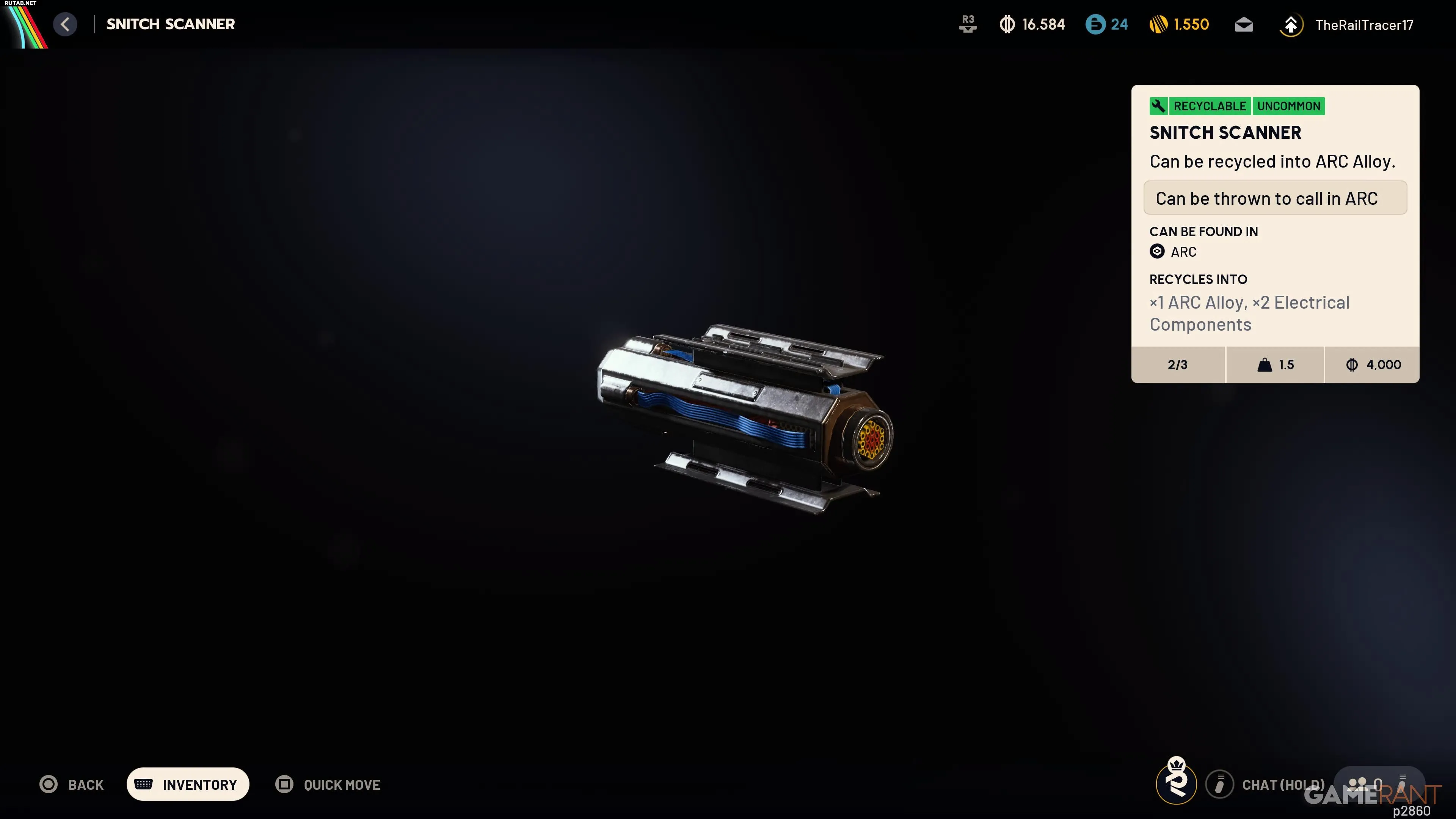 «Сканеры стукачей» можно переработать в «Сплавы ARC» и «Электрические компоненты». Однако их практическое применение делает их уникальными. Эти предметы можно использовать, чтобы вызвать врага ARC с неба в область, куда вы их бросите. Если у вас есть несколько таких сканеров, вы можете бросить их все по очереди во вражескую команду рейдеров и наблюдать, как враги ARC атакуют и быстро расправляются с ними.