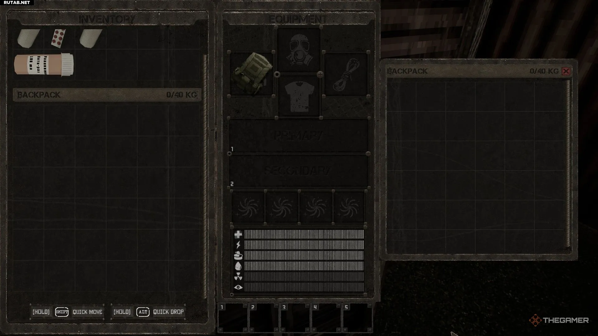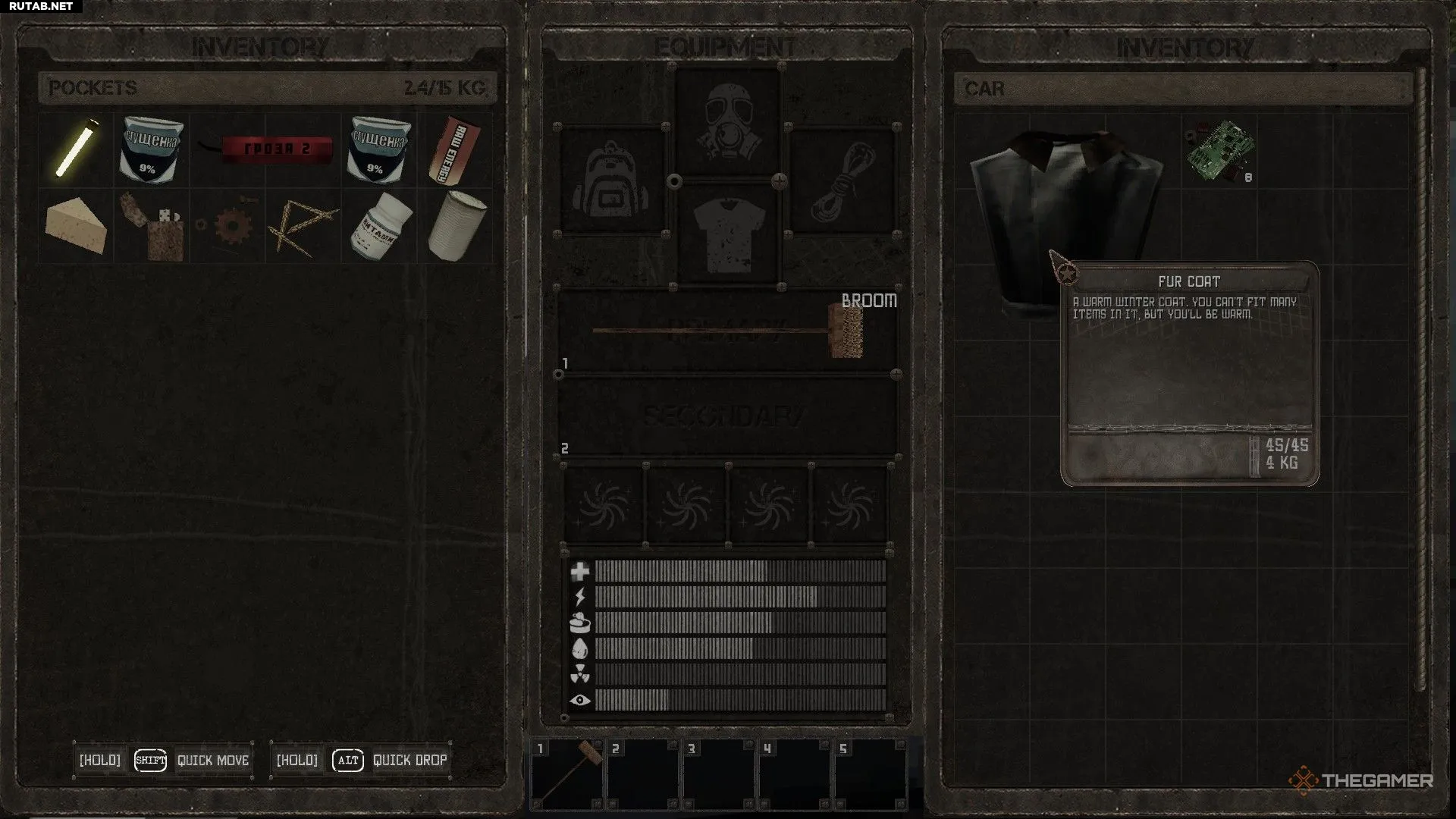 Вместимость инвентаря в Misery зависит от экипировки. Каждый предмет снаряжения имеет два параметра: вес и количество клеток. Например, ваш начальный инвентарь — это карманы, которые вмещают до 15 кг и девять клеток. Это означает, что вы можете нести предметы, которые занимают все эти клетки и/или не весят больше 15 кг в сумме.