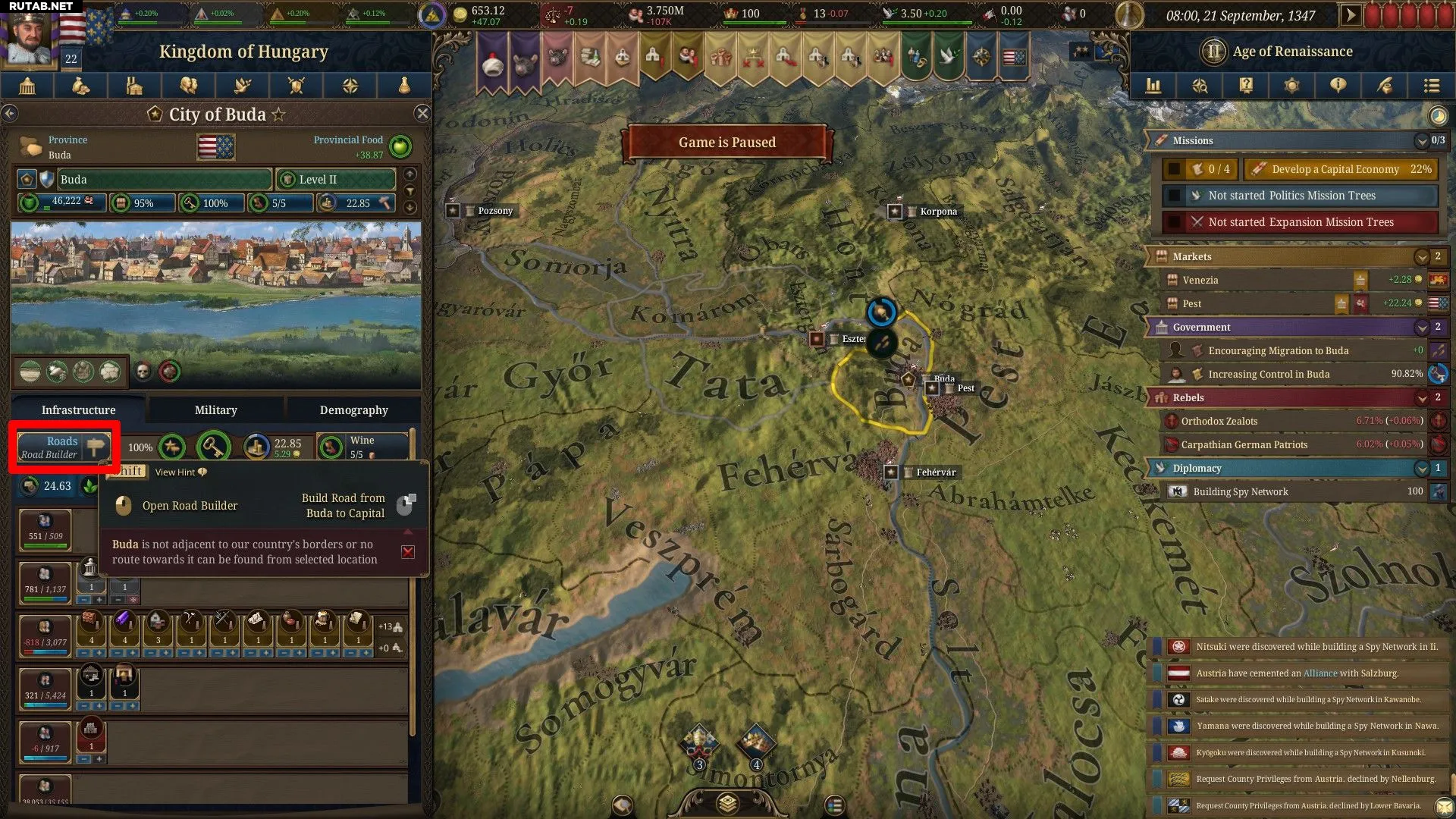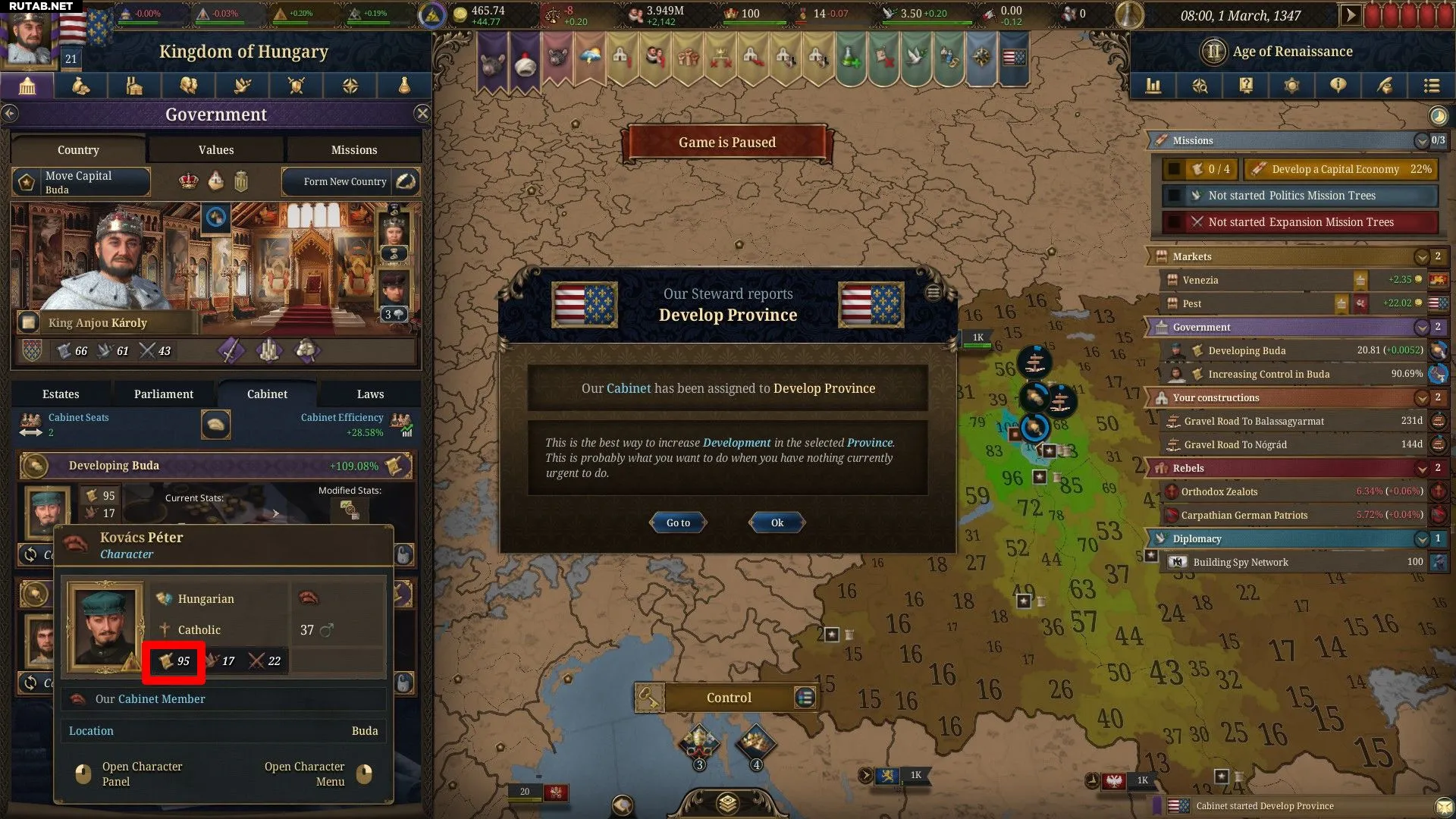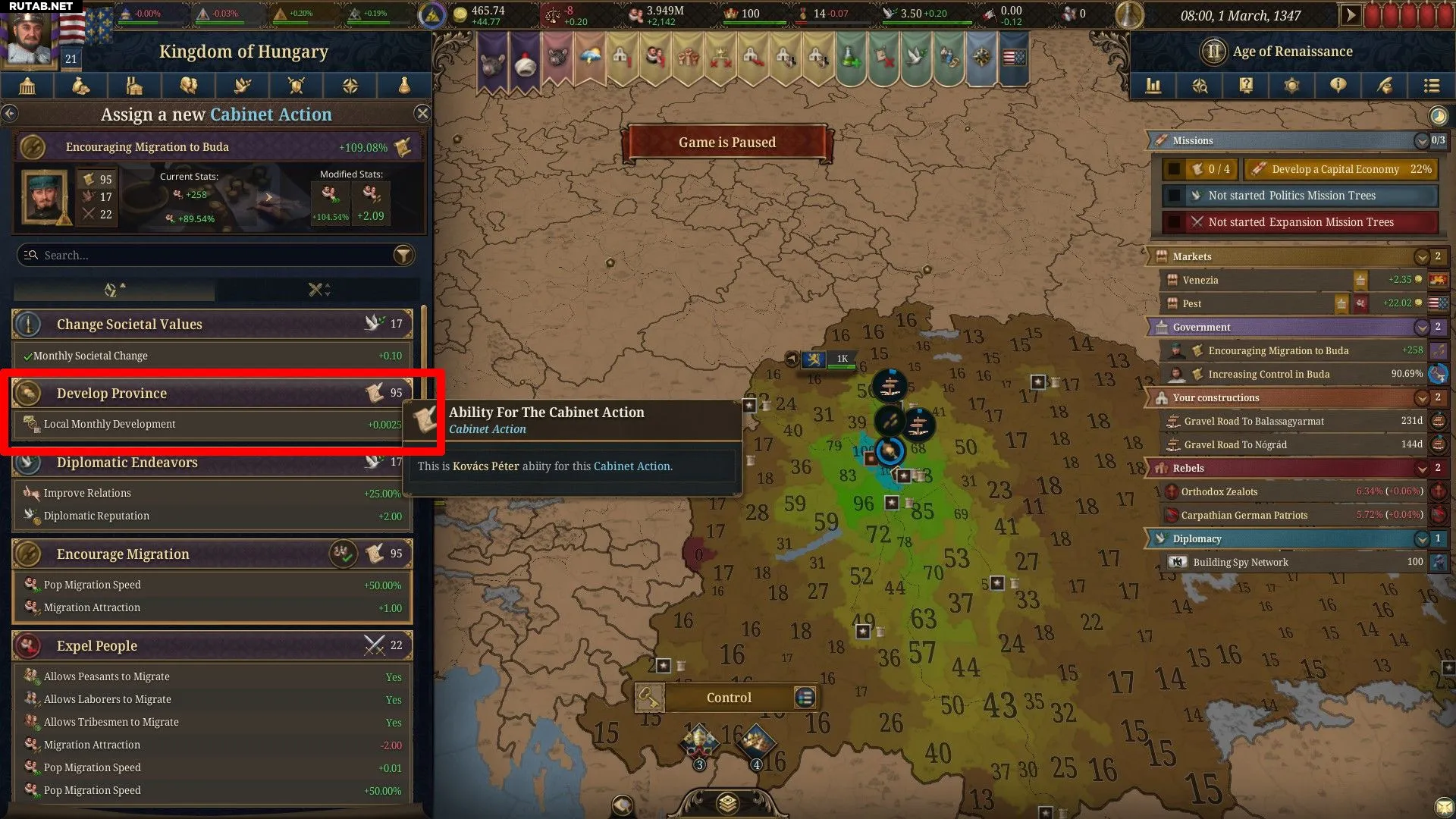 Развитиелокации влияет на стоимость близости при перемещении через неё. Этот показатель отражает степень освоенности территории. Игроки могут использовать действие кабинета, чтобы немедленно начать повышать развитие провинции. В частности, полезно действие кабинета Развитие провинции, которое запускается следующим образом: