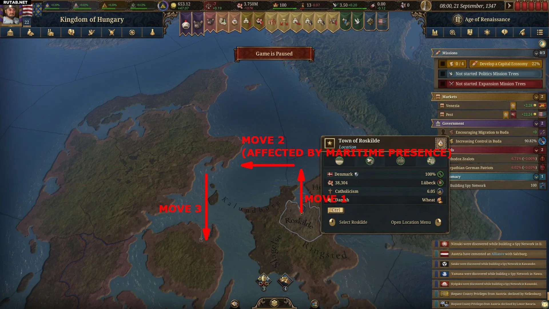 Продолжая предыдущий пример: перемещение из Эресунна (морская зона) в Сторстрём (морская зона) зависит от морского присутствия в этих локациях. Размещение кораблей в Датском море (провинции, к которой они относятся) увеличит это присутствие и снизит стоимость близости данного перемещения.