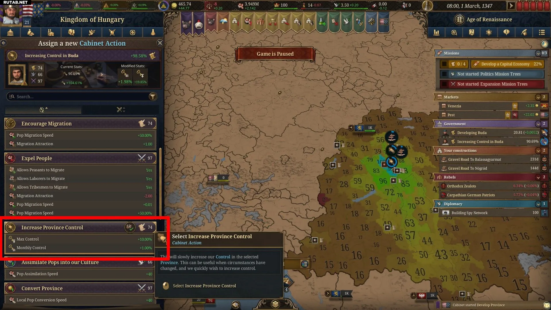 Игроки могут напрямую увеличивать контроль над своими локациями с помощью действия кабинета «Увеличение контроля над провинцией». Это действие запускается так же, как и упомянутое выше «Развитие провинции», и является отличным способом установить контроль над несколькими локациями одновременно.