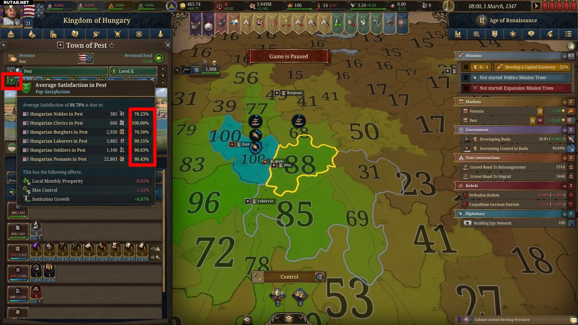 Средняя удовлетворённость населения в локации также влияет на контроль. Игрокам следует поддерживать довольство своих подданных, например, обеспечивая высокую удовлетворённость сословий и удовлетворяя их потребности. Чтобы увидеть среднюю удовлетворённость локации и факторы, которые на неё влияют, выполните следующие действия: