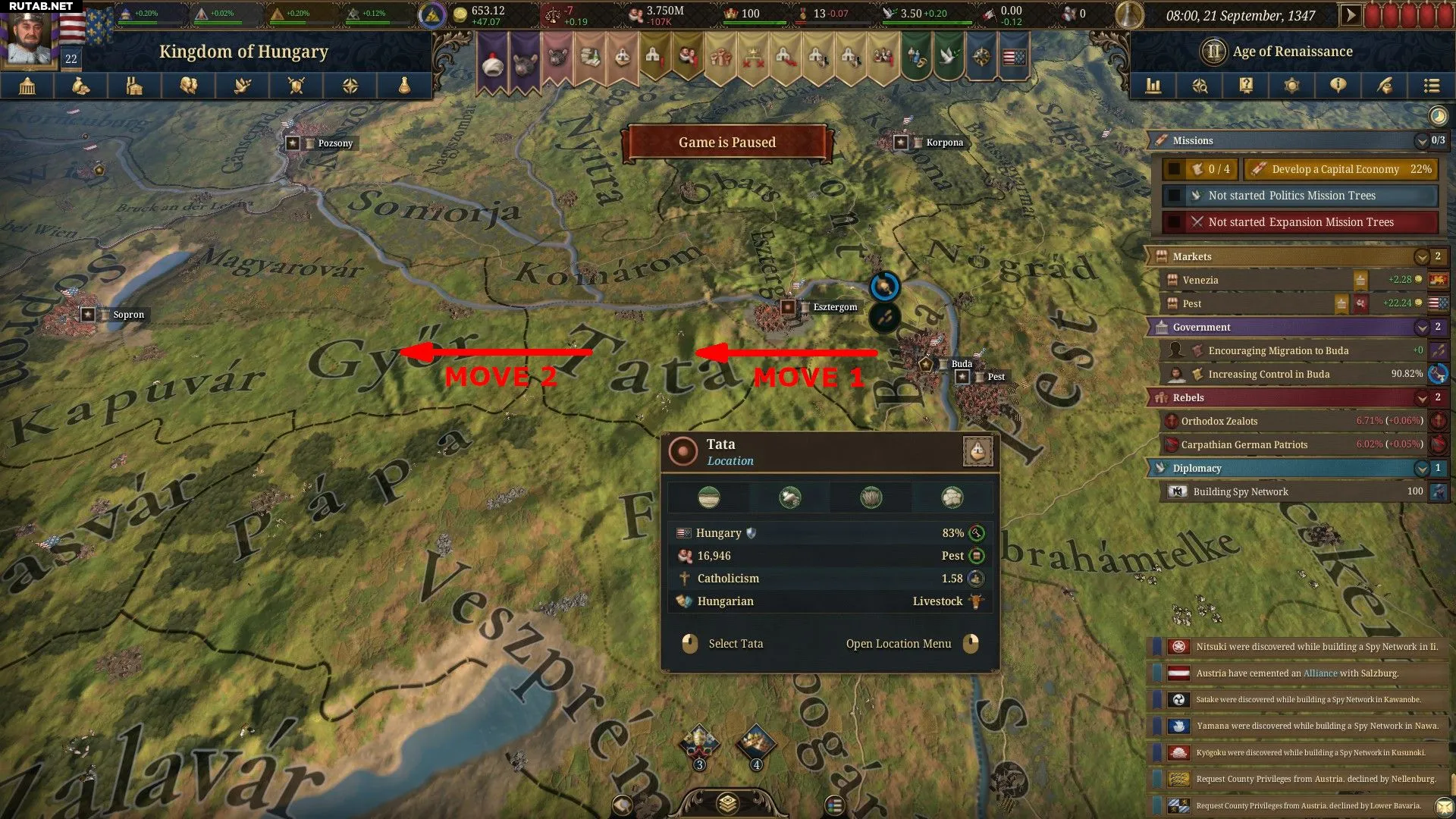 Дьёррасположен к западу от Буды (столицы Венгрии), и между ними находится одна клетка — Тата. Это означает, что путешествие между Будой и Дьёром состоит из двух перемещений: из Буды в Тату, а затем из Таты в Дьёр.
