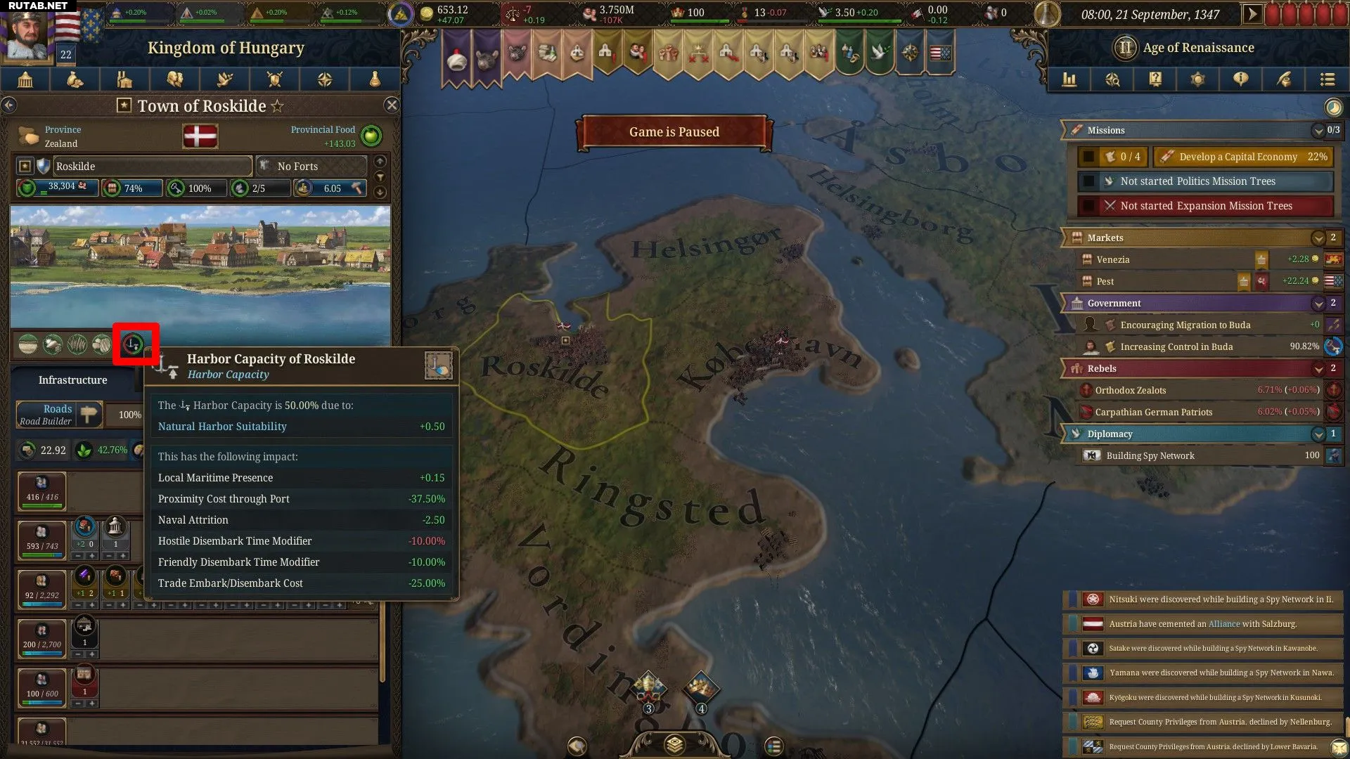 Для перемещений, которые происходят через морские зоны, игроки могут снизить стоимость близости, увеличив вместимость порта и морское присутствие. Начнём с вместимости порта: эта характеристика есть у каждой прибрежной локации, и она влияет на стоимость близости при перемещении из локации в соседнюю морскую зону. Для понимания этой механики рассмотрим пример из Дании: