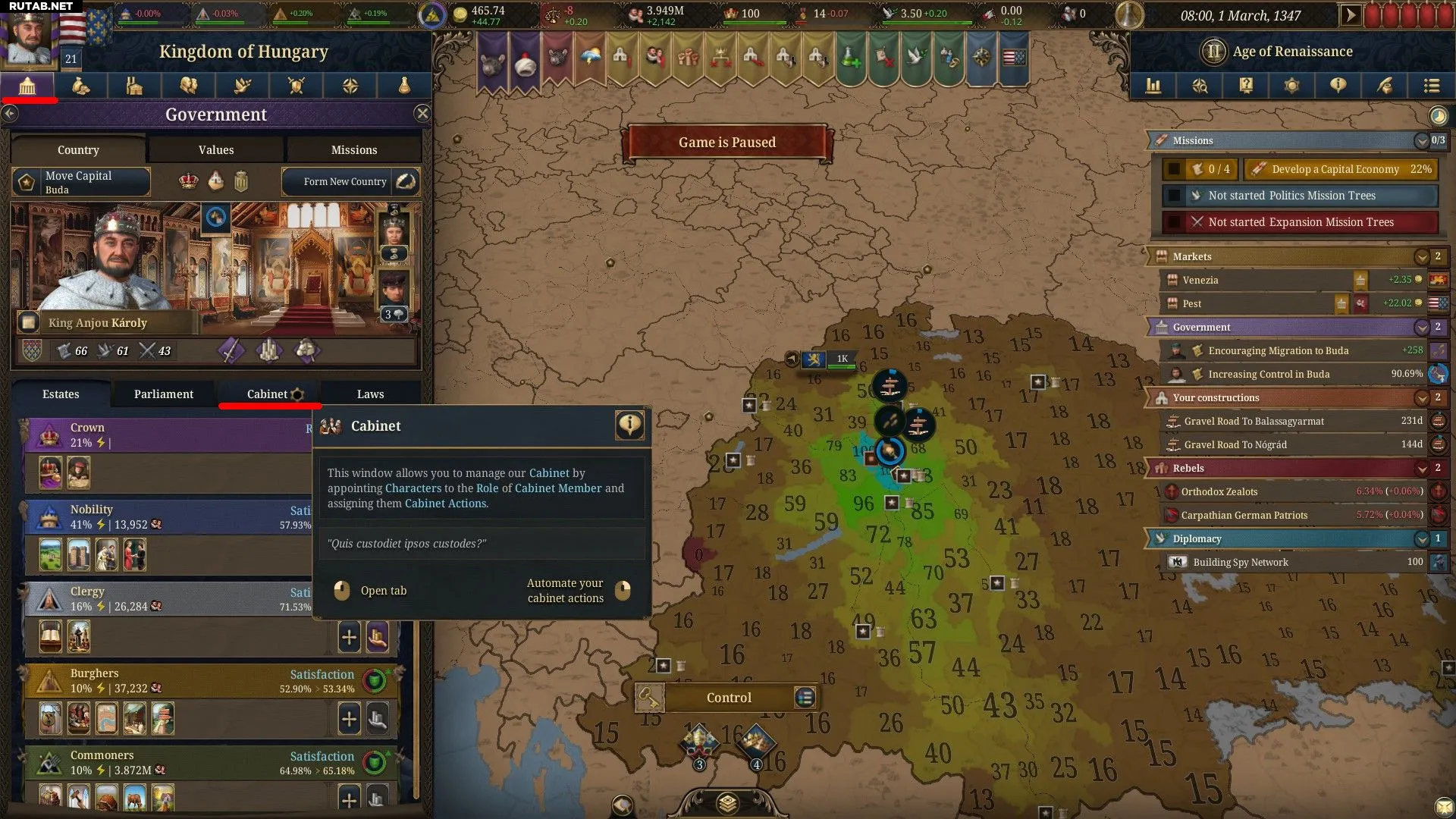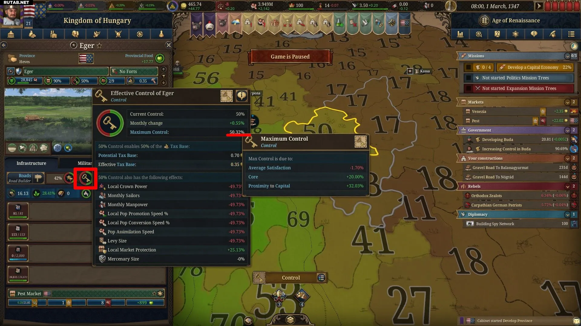 Игроки всегда могут увидеть факторы, влияющие на контроль над провинцией: для этого нужно кликнуть на локацию, навести курсор на значок ключа, а затем на процентное значение рядом с показателем «Максимальный контроль». Также важно знать, что контроль распространяется от столицы, что хорошо видно при активации фильтра карты контроля.