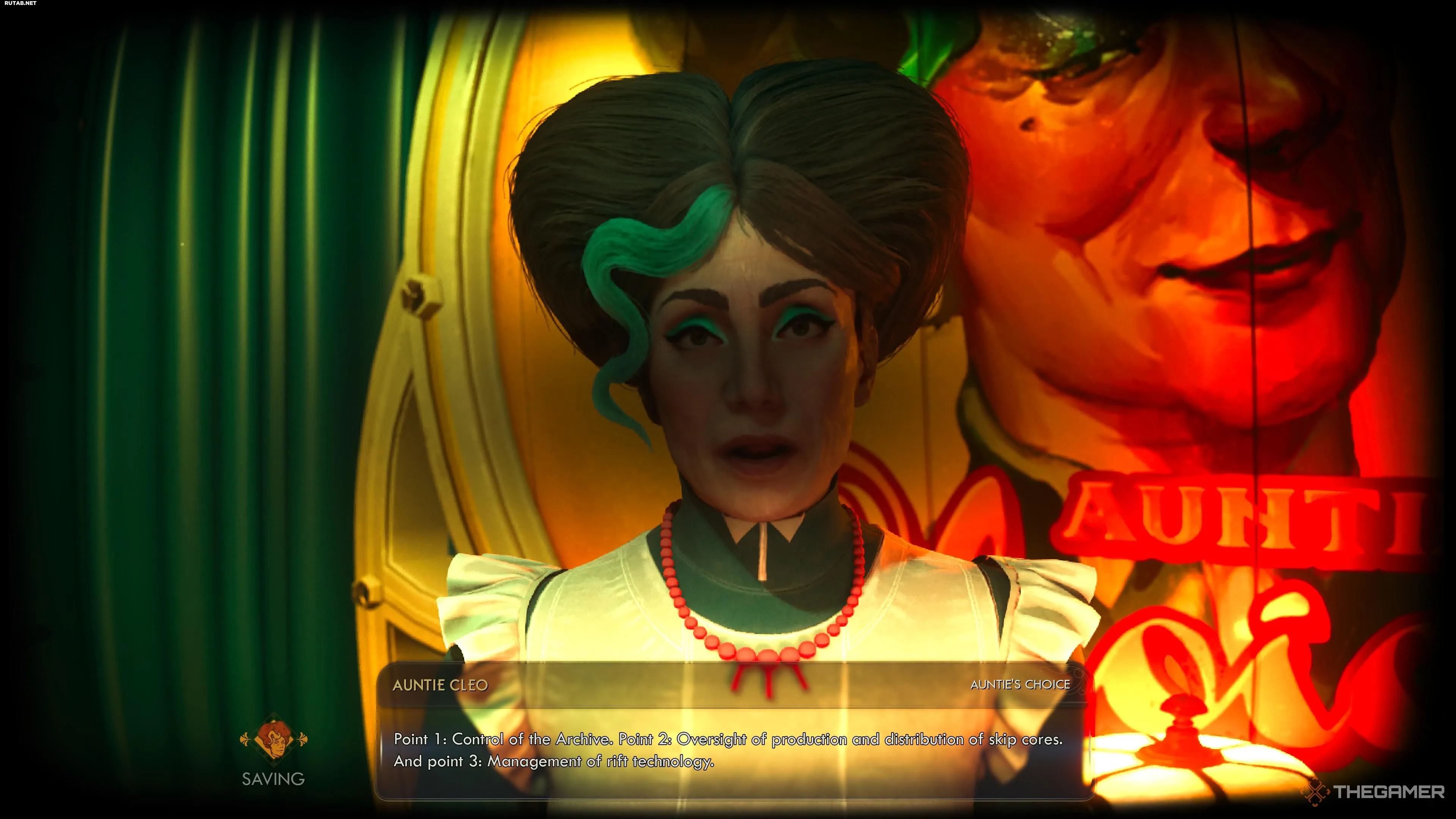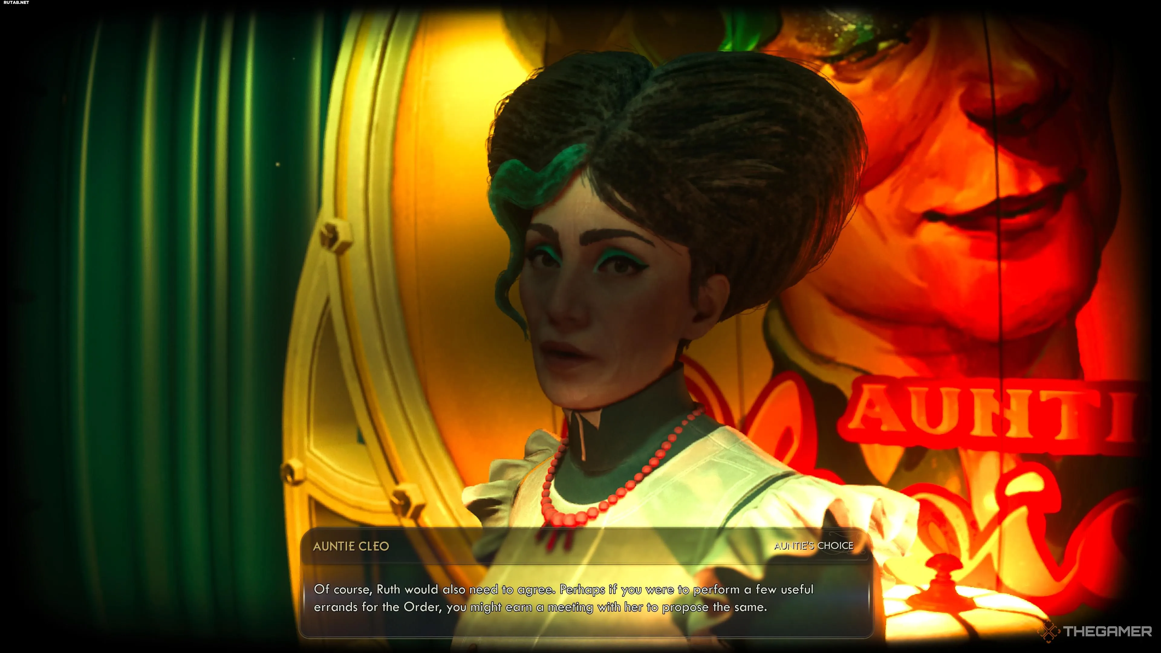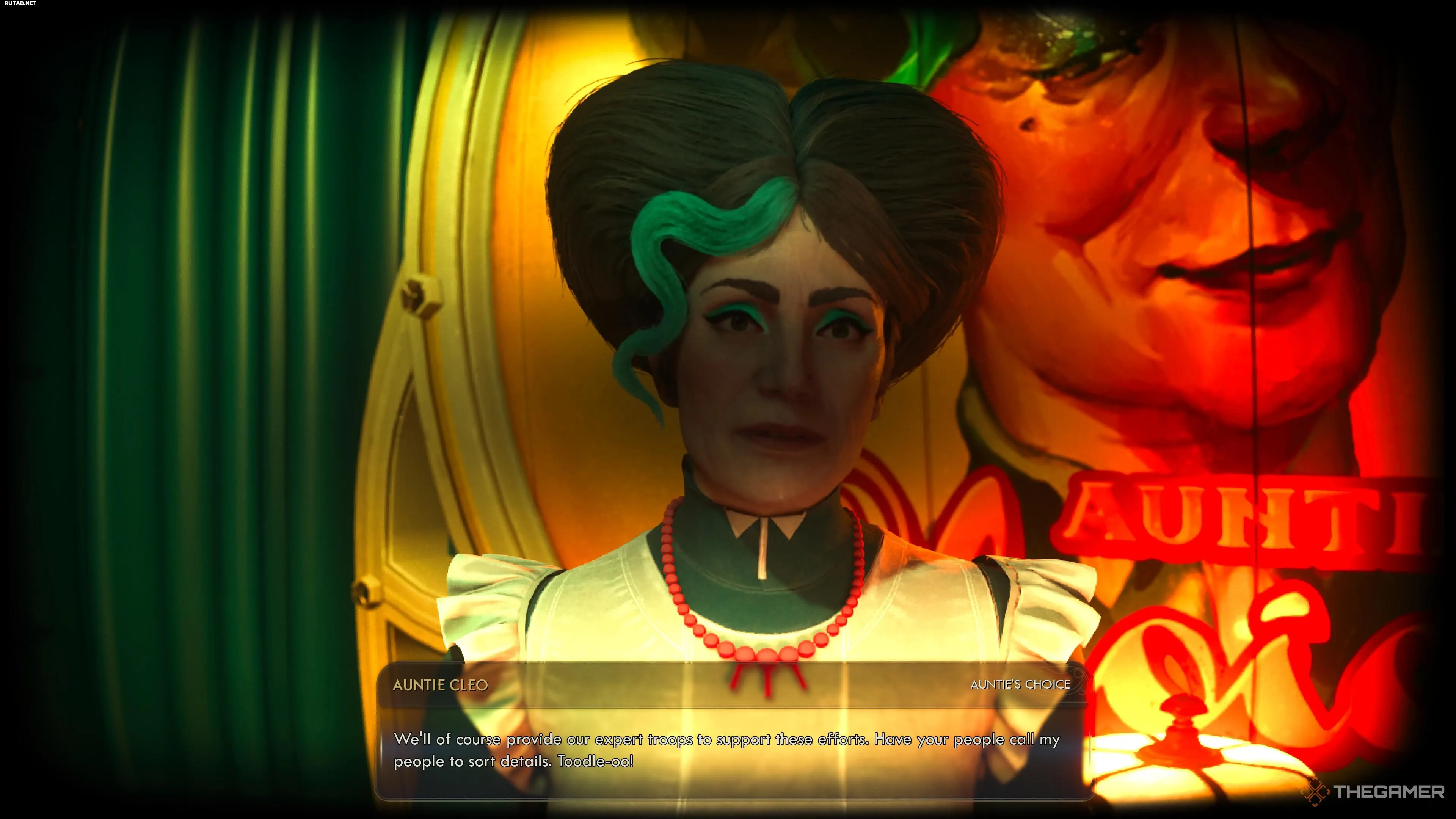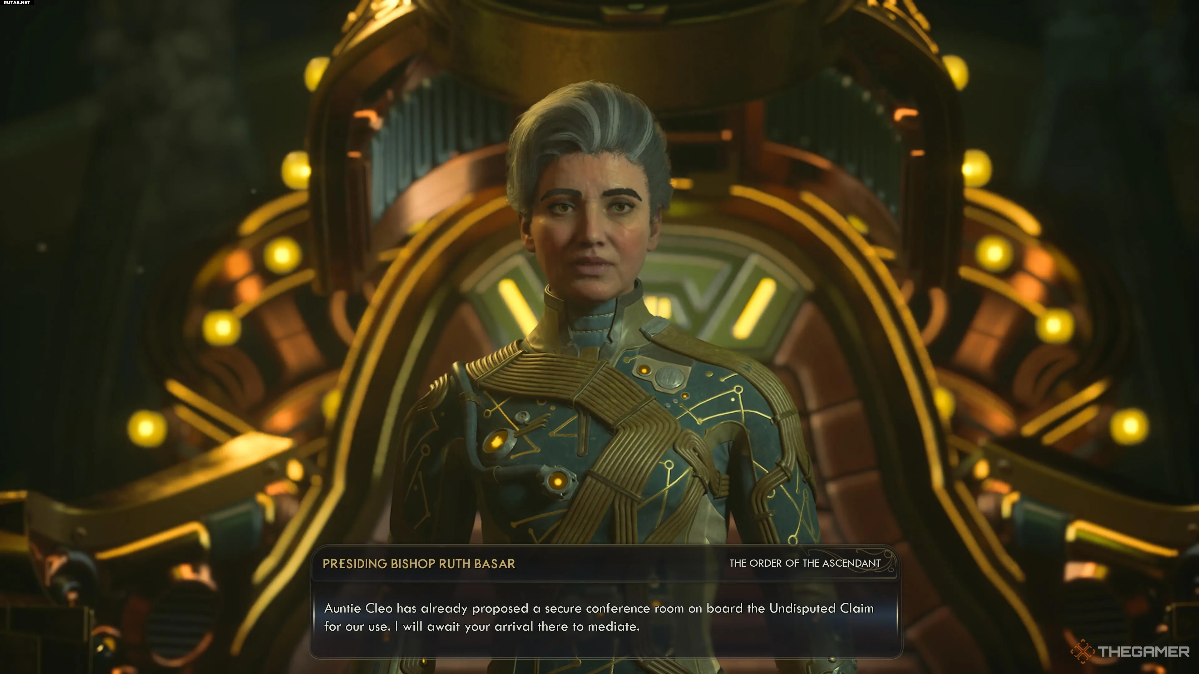 Убедить эту пару согласиться на переговоры — уже само по себе непростая задача. Тётушка Клео сразу же благосклонно относится к идее дальнейших переговоров с Рут и заявляет, что как только вы всё уладите на своей стороне, она будет рада принять встречу на своём корабле «Беспрекословный Иск». Конечно, в цифровом формате, но всё же это милый жест вежливости.