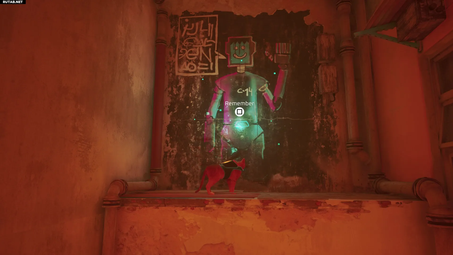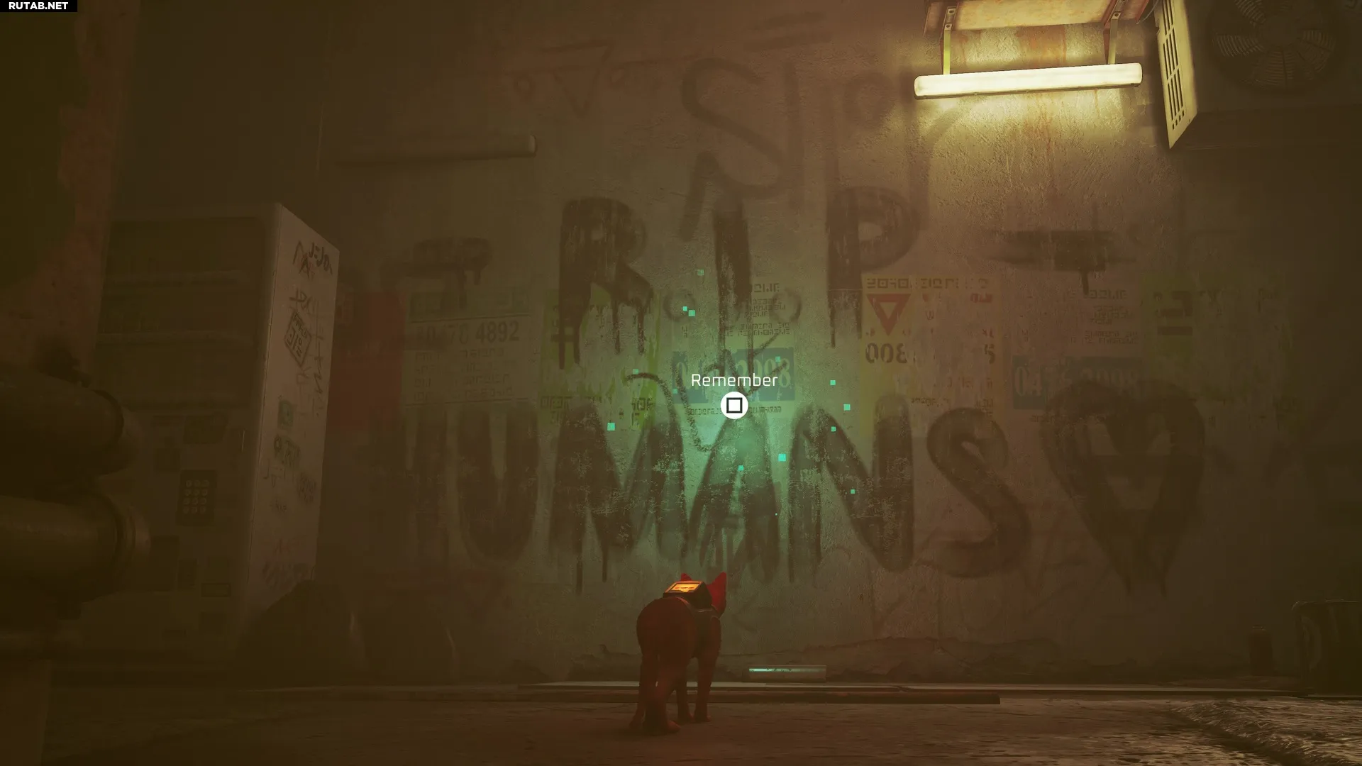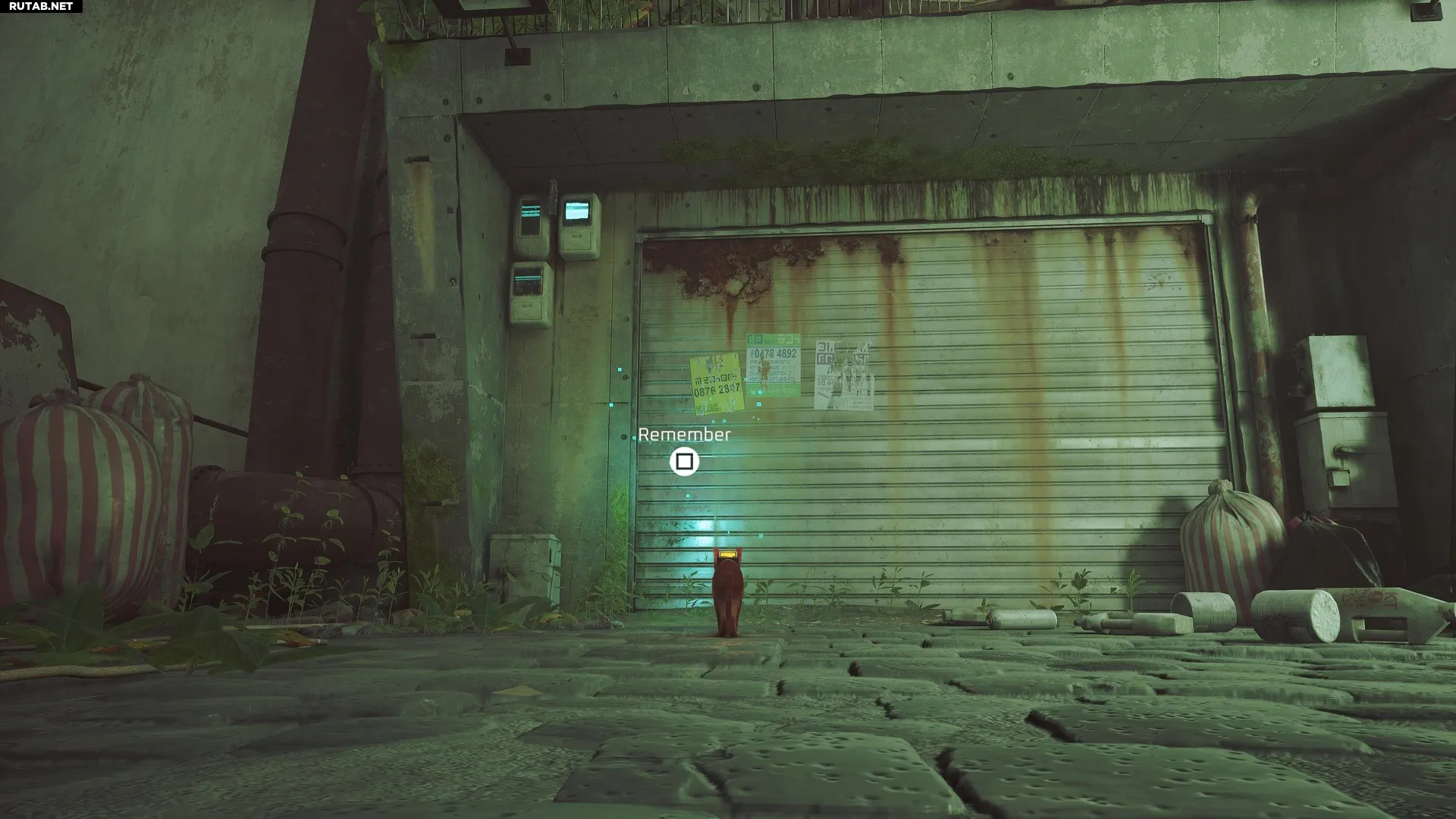 Трущобы (6/27): В заднем переулке рядом с местом входа в локацию, где робот закрыл ворота, поднимитесь по лестнице и осмотрите граффити на стене рядом с торговым автоматом, который понадобится для Заблудшего воспоминания 3.