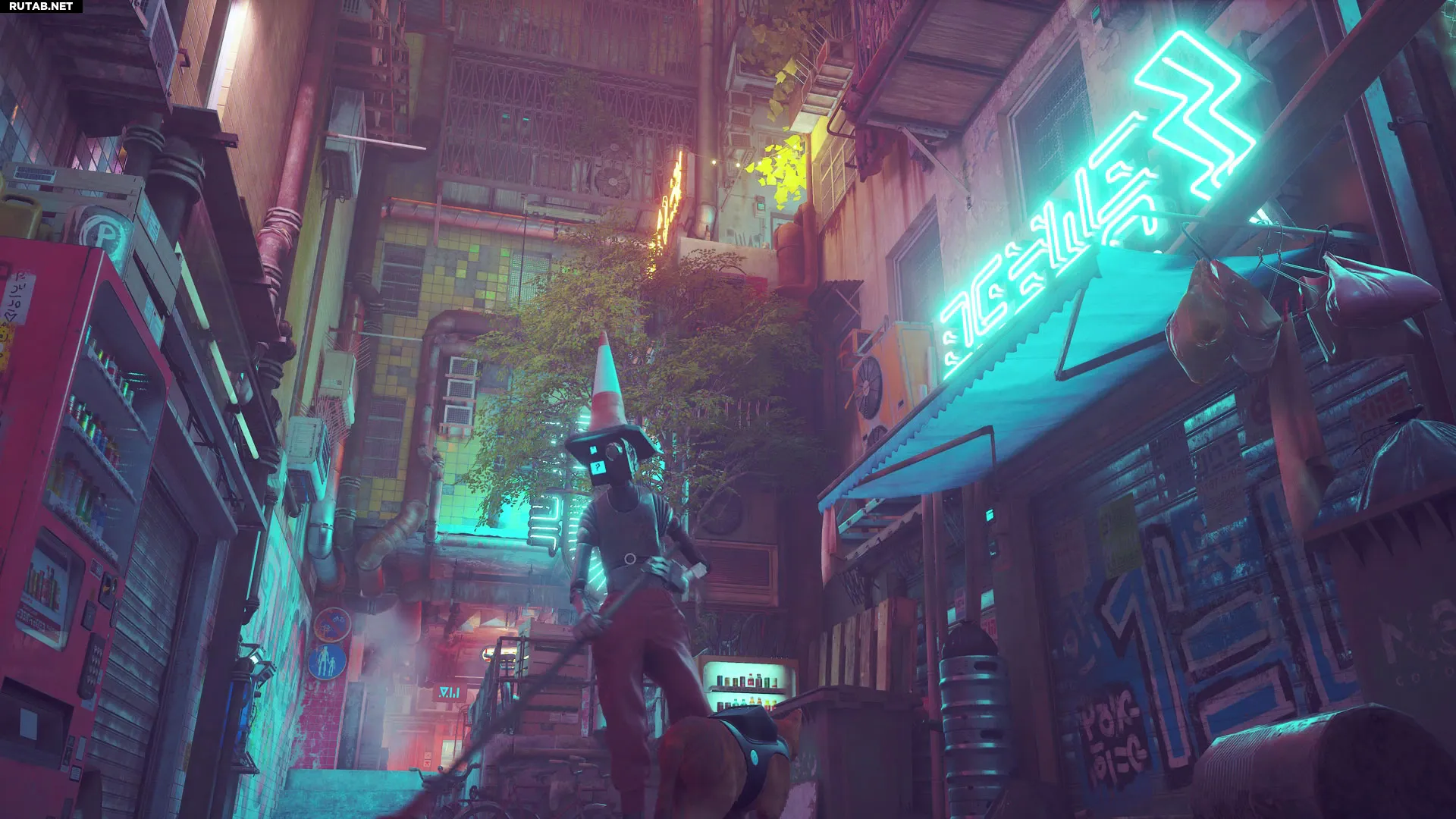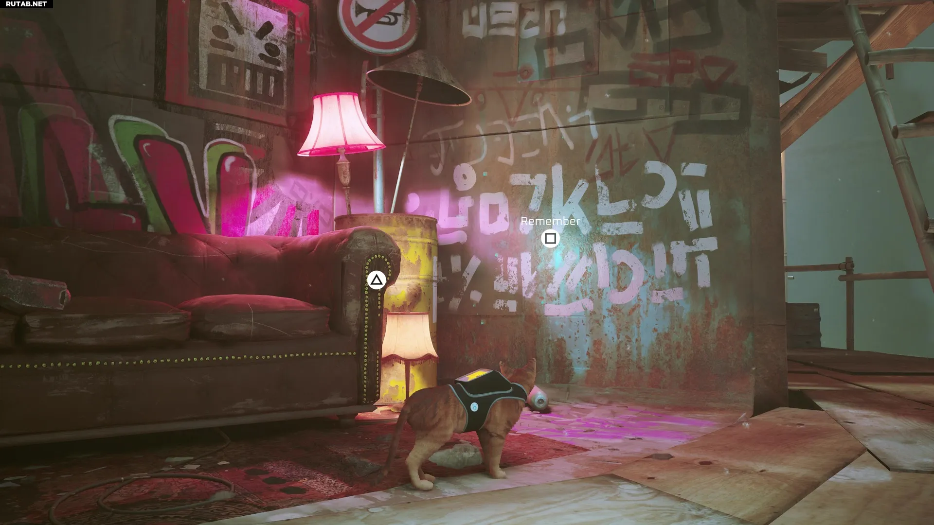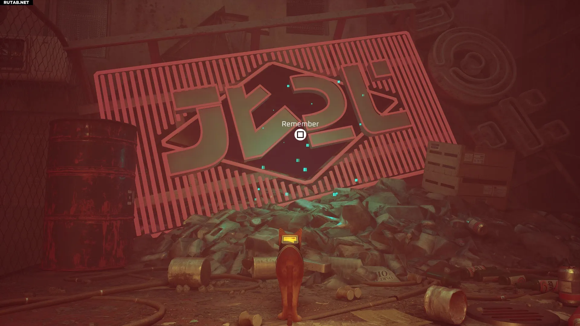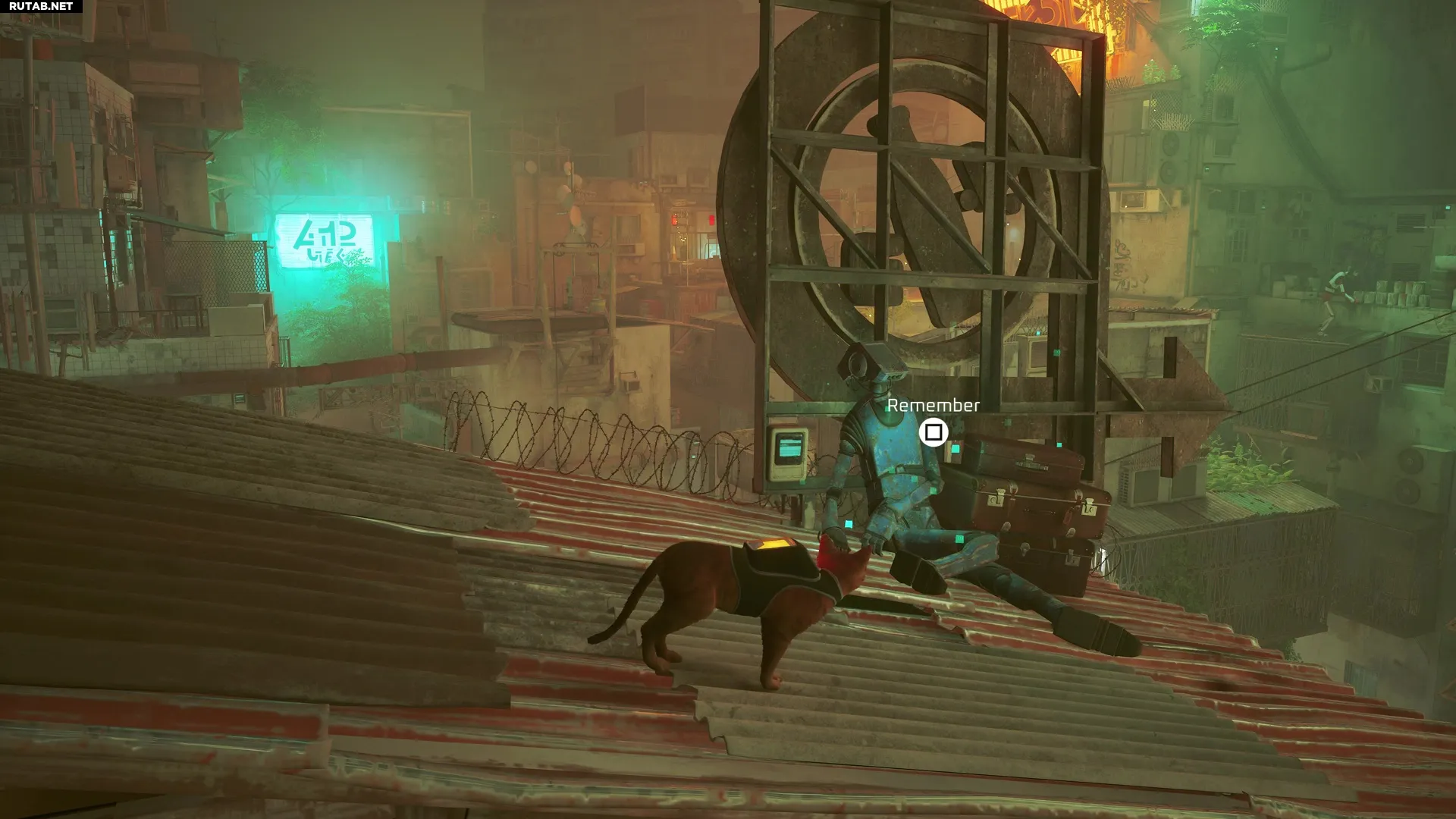 Трущобы (6/27): В заднем переулке рядом с местом входа в локацию, где робот закрыл ворота, поднимитесь по лестнице и осмотрите граффити на стене рядом с торговым автоматом, который понадобится для Заблудшего воспоминания 3.