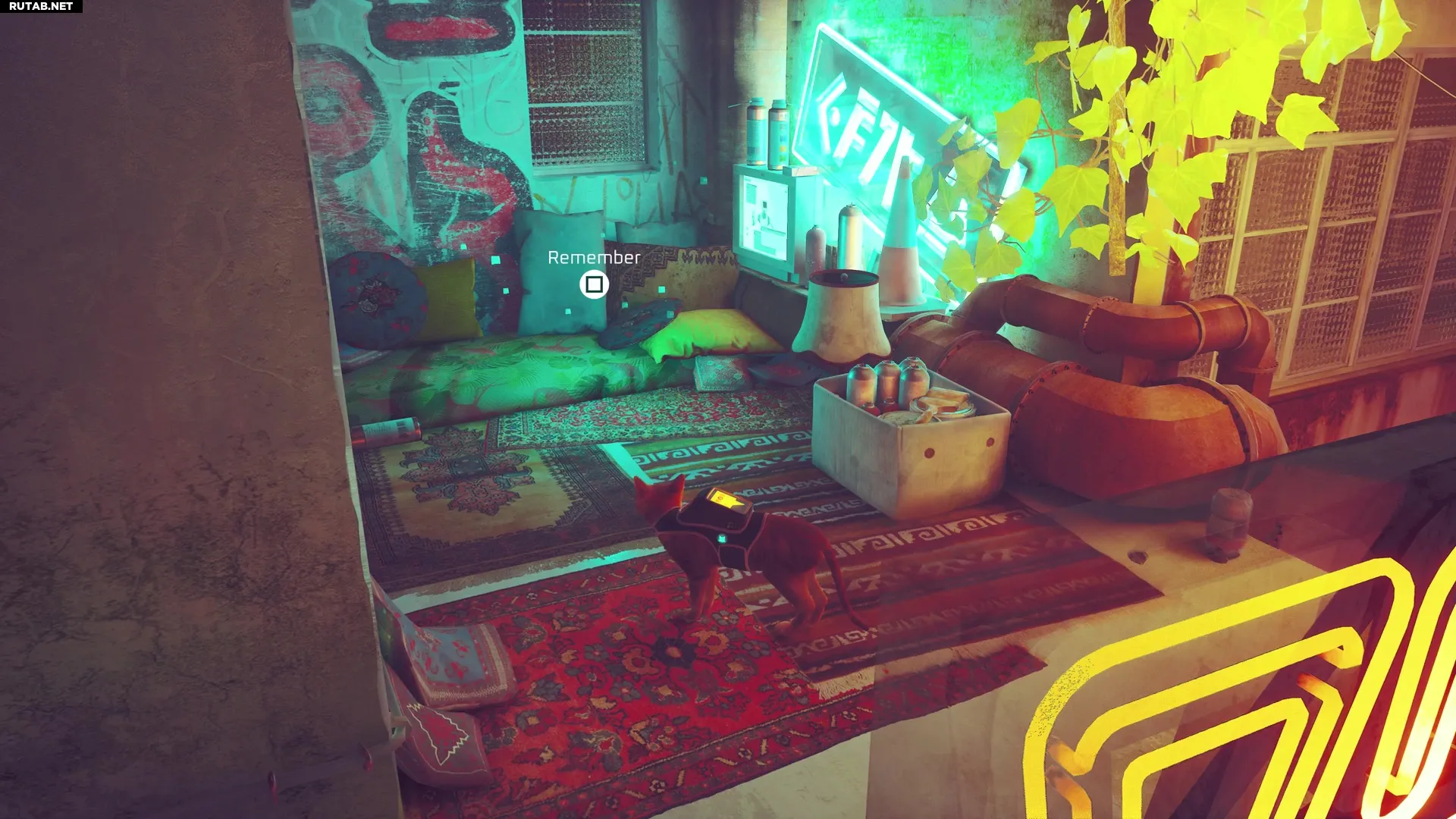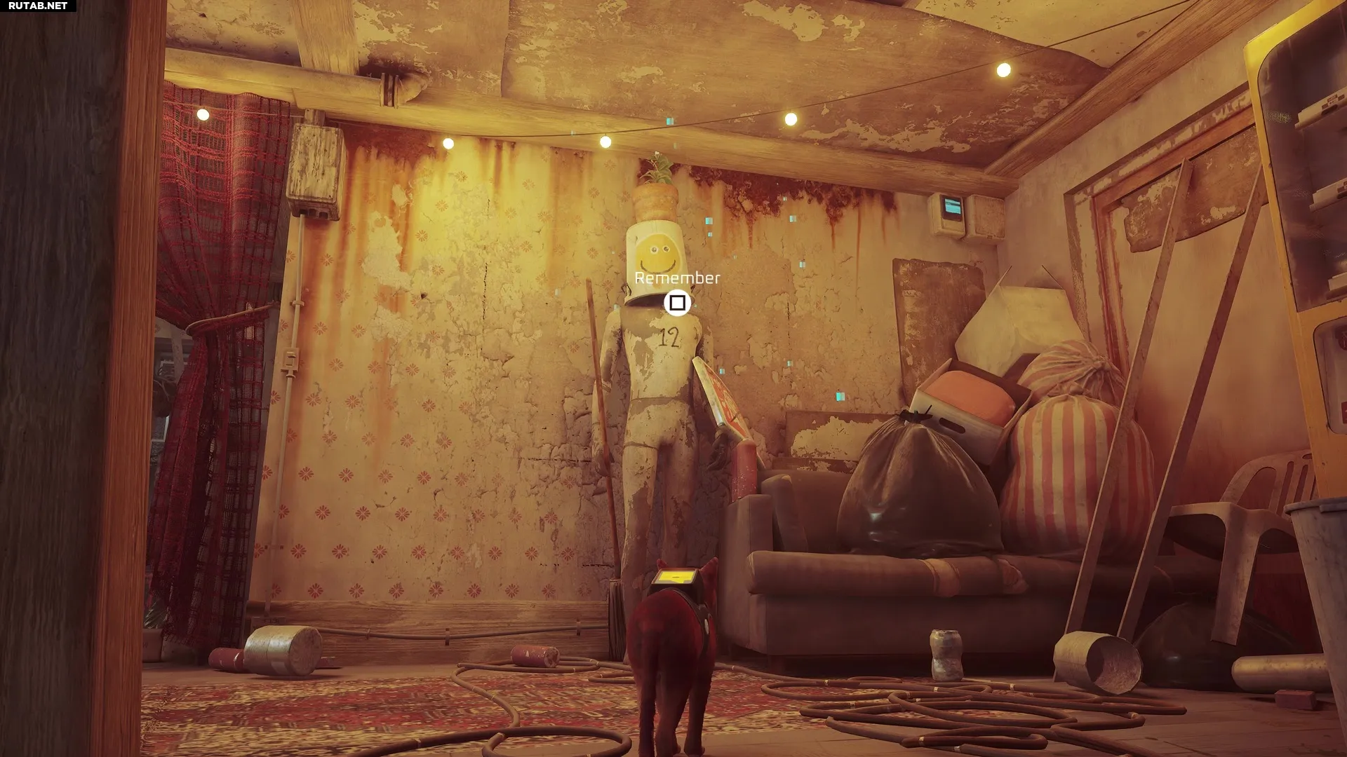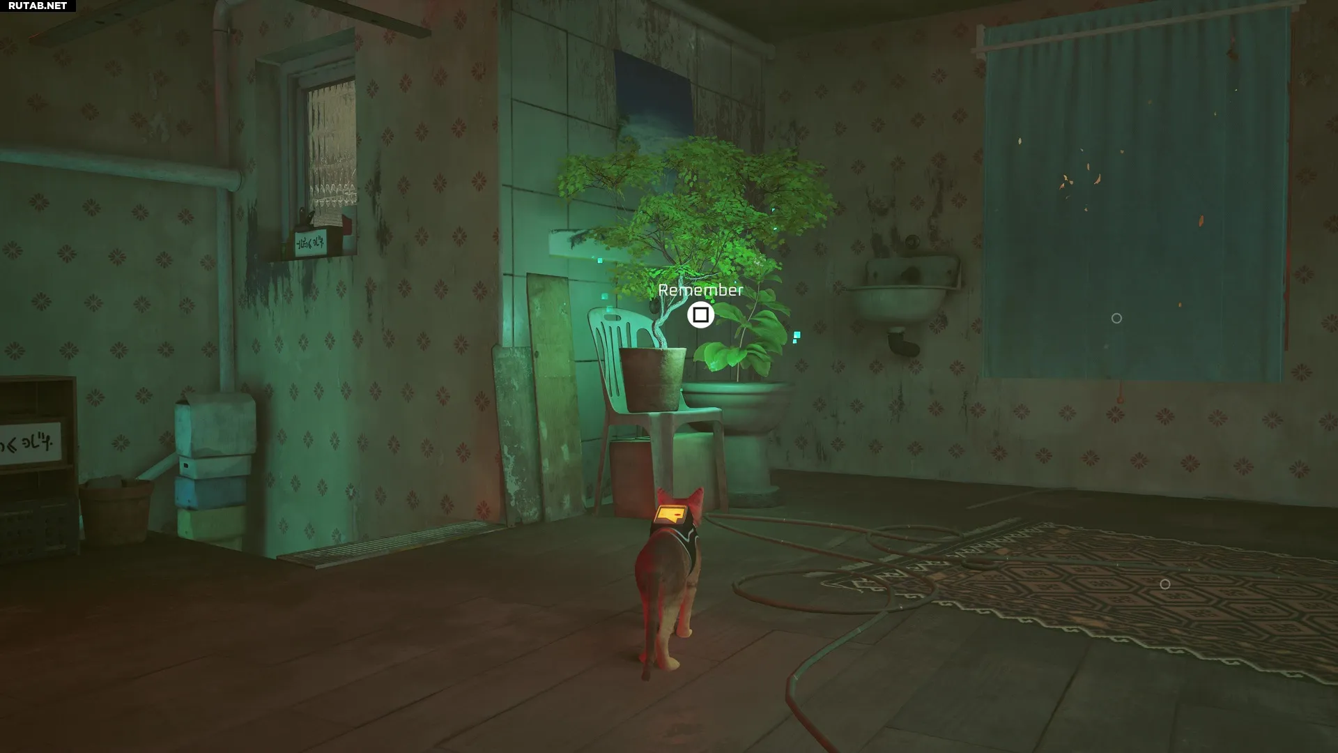 Трущобы (8/27): Попадите внутрь «Программирования Эллиота» (помечено знаками с двоичным кодом), поцарапав входную дверь. Поднимитесь наверх и осмотрите растения, растущие из горшка и унитаза. Пока вы здесь, можете поговорить с Эллиотом — это один из этапов на пути к получению кода от сейфа в Stray.