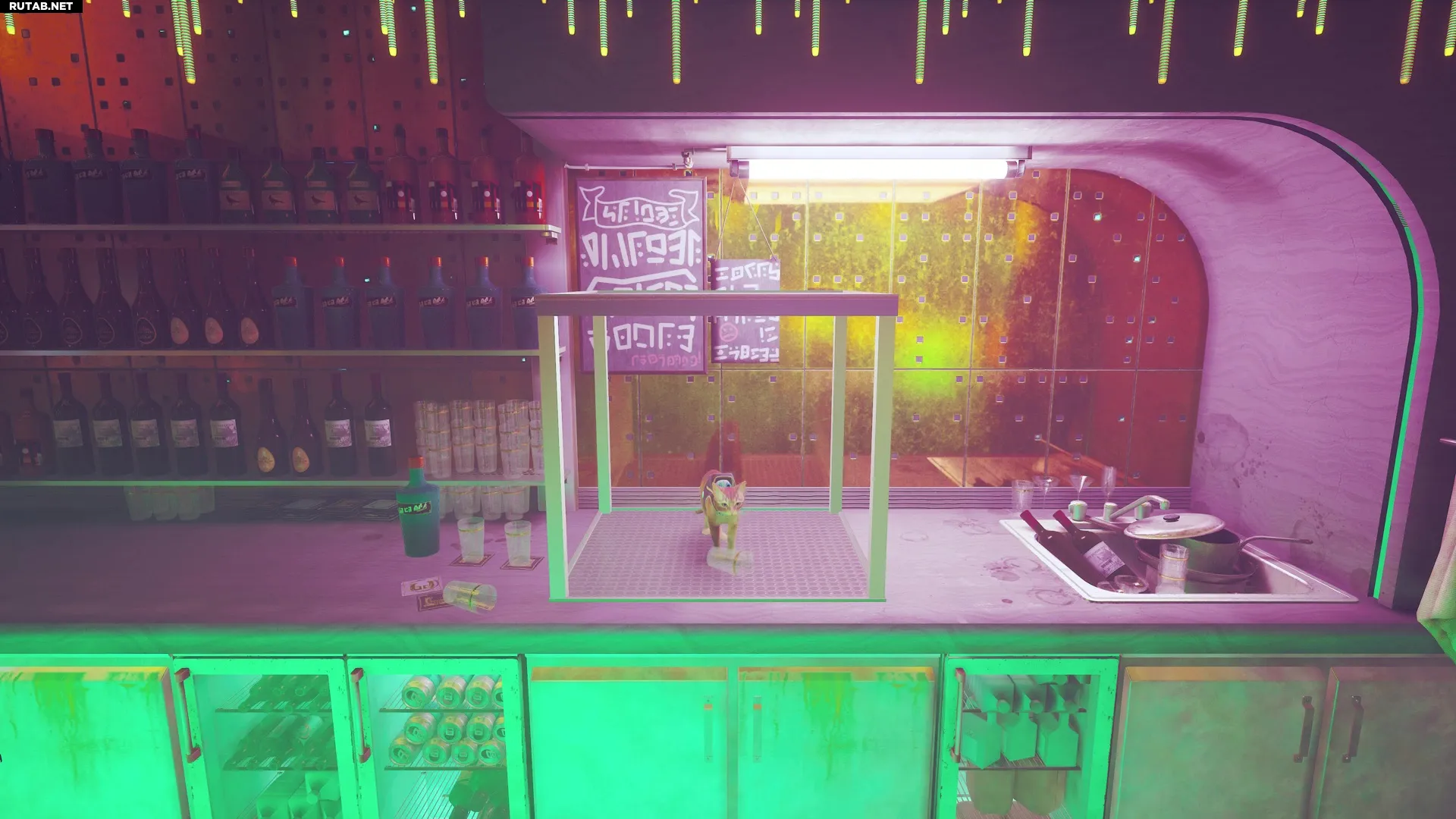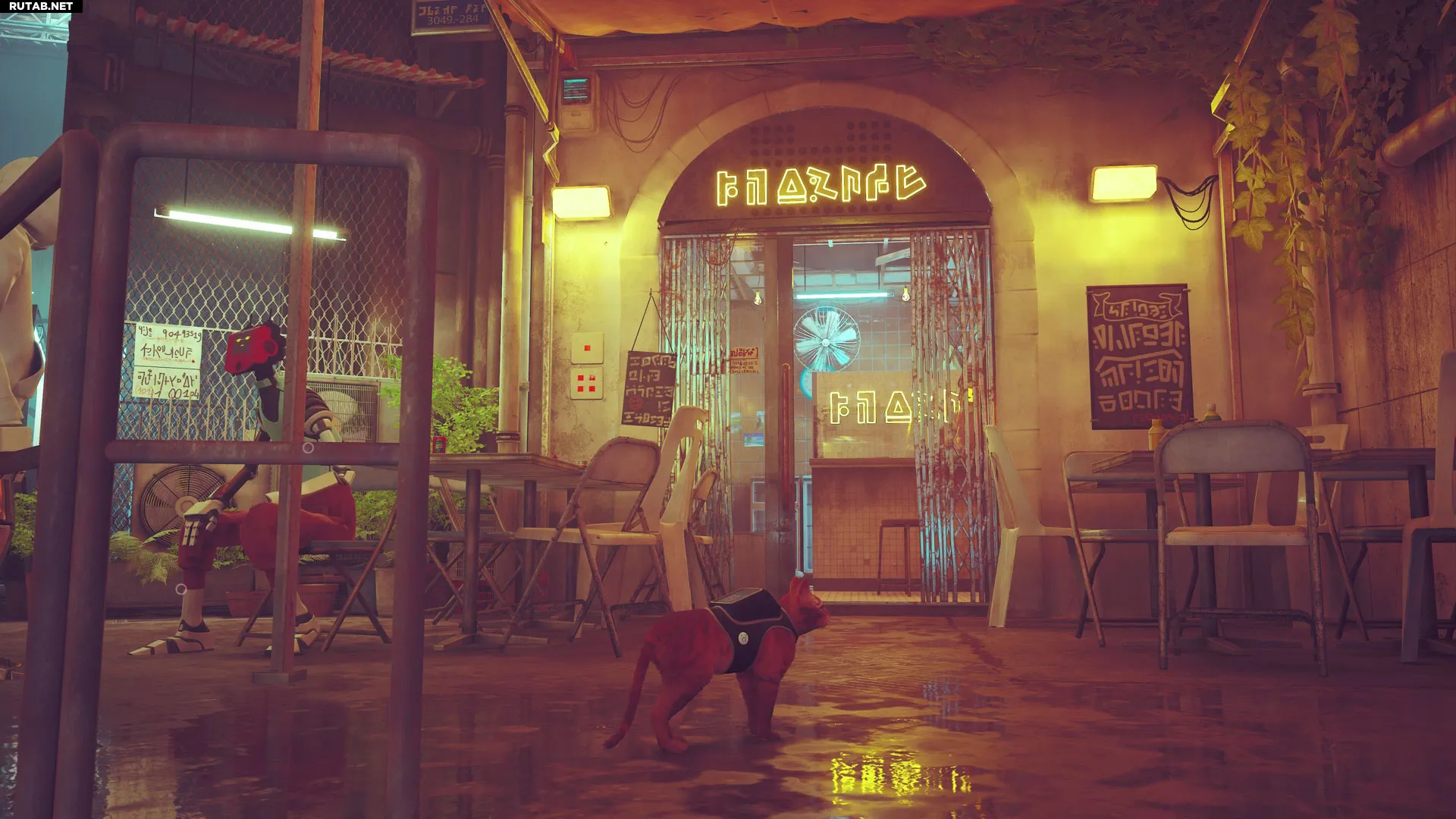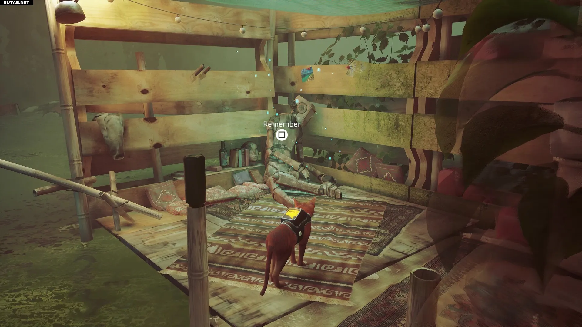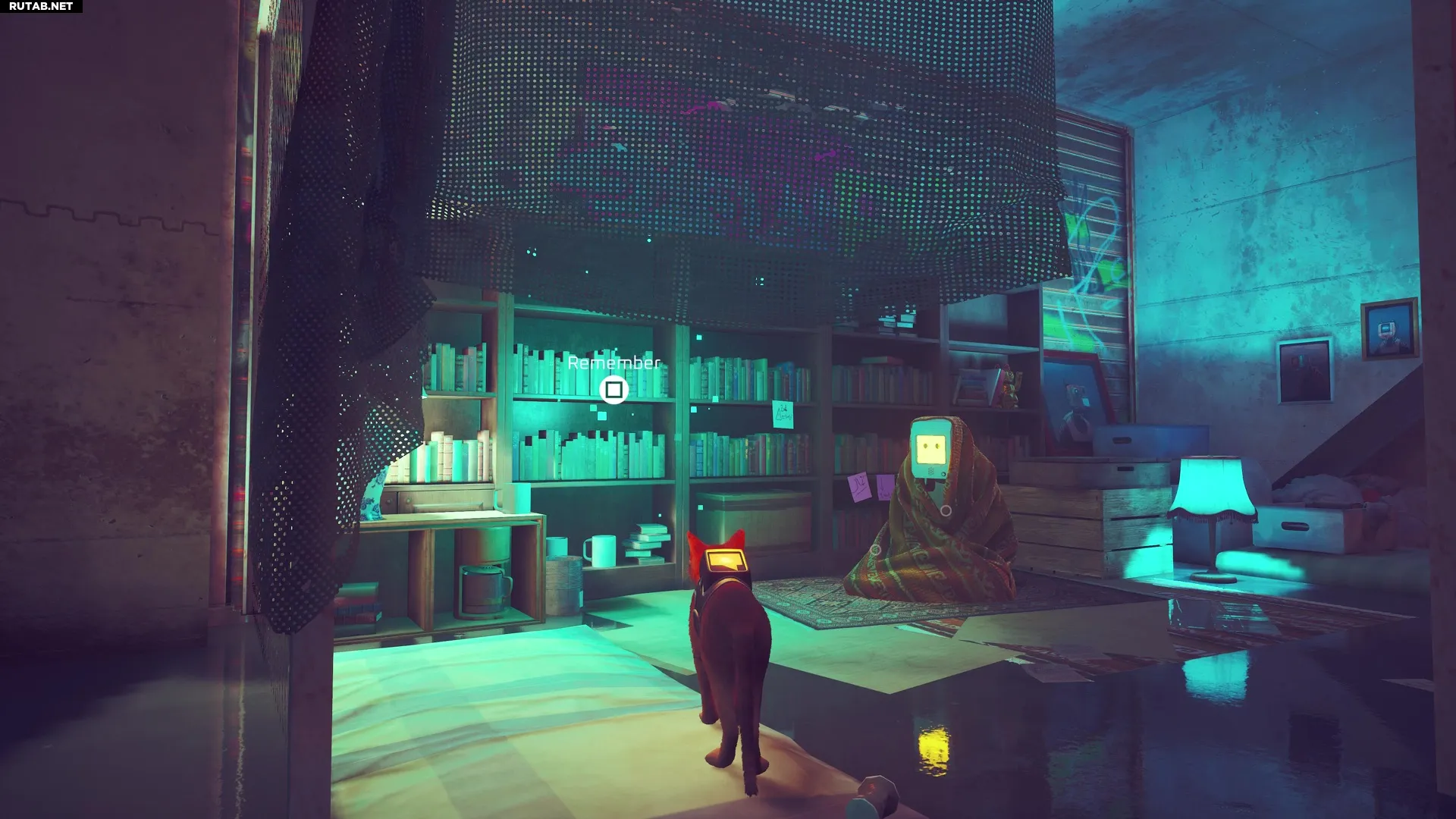 Трущобы (8/27): Попадите внутрь «Программирования Эллиота» (помечено знаками с двоичным кодом), поцарапав входную дверь. Поднимитесь наверх и осмотрите растения, растущие из горшка и унитаза. Пока вы здесь, можете поговорить с Эллиотом — это один из этапов на пути к получению кода от сейфа в Stray.