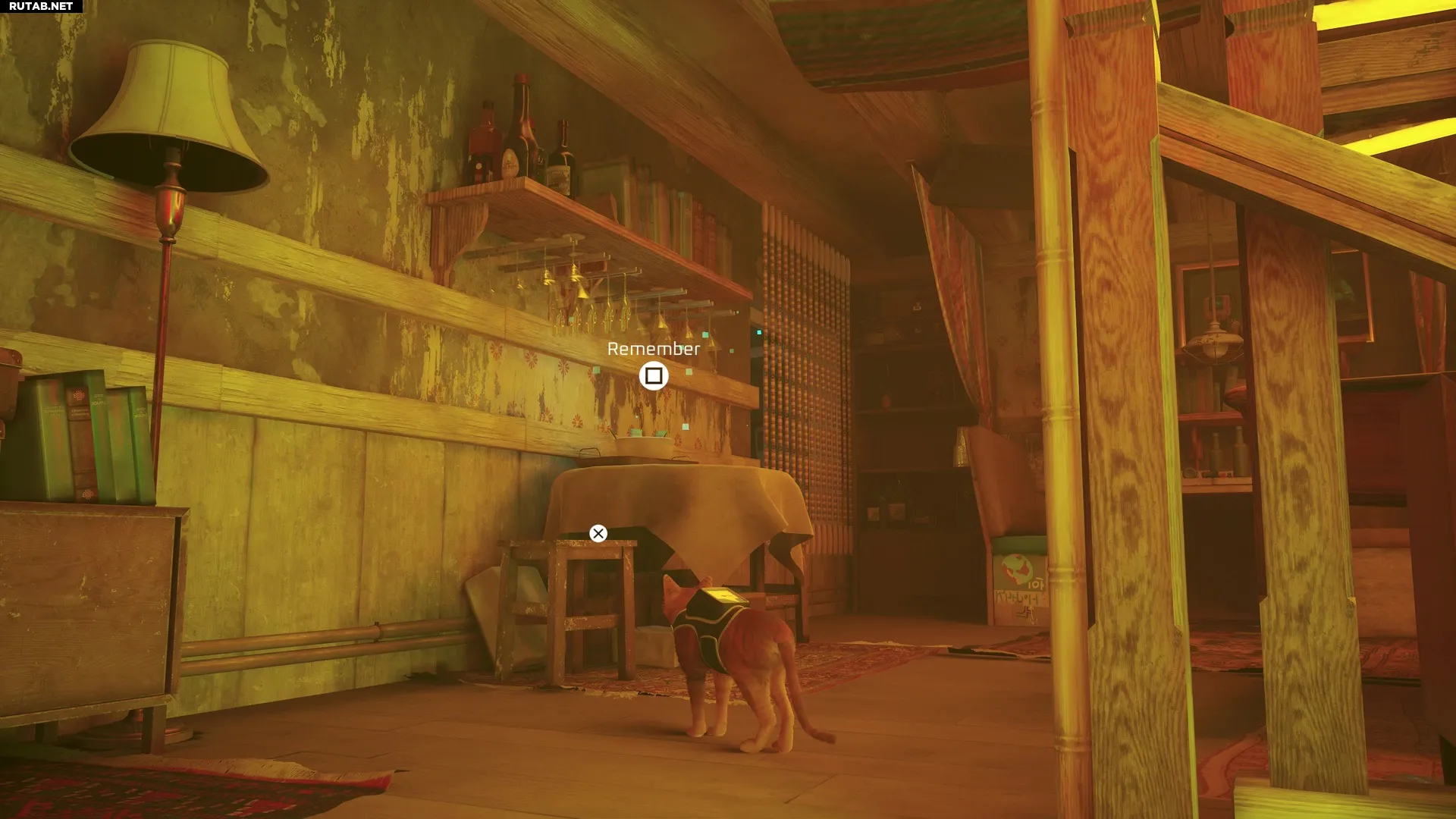 Трущобы (4/27): На верхнем уровне бара осмотрите миску с едой на круглом столе под полкой с висящими бокалами.