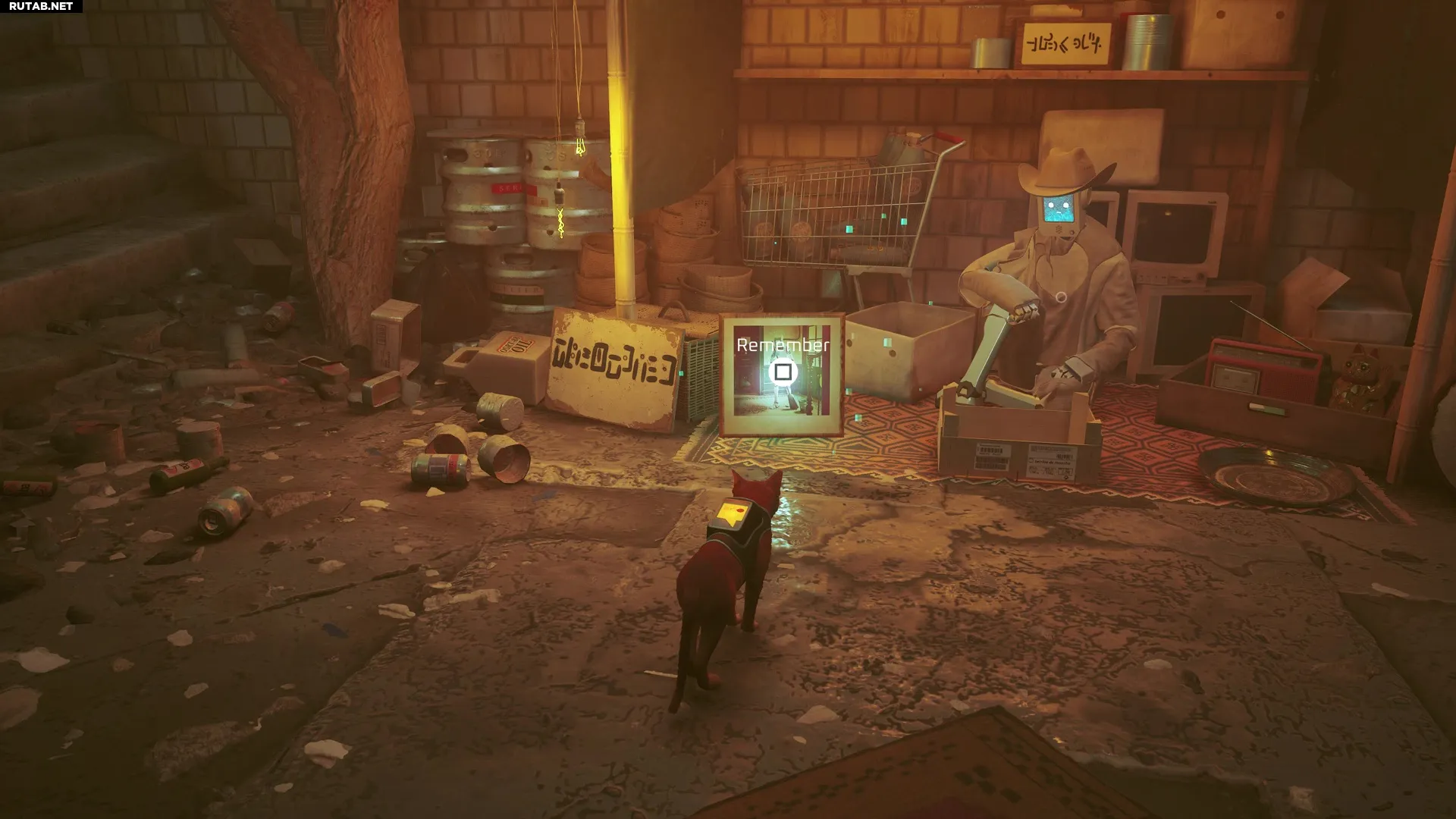 Собрав три банки напитка, вернитесь к загадочному предмету у торговца Азуза и покажите ему любую из банок для совершения сделки. После этого вы сможете отсканировать картину. Если у вас осталась четвёртая банка, вы можете купить у Азуза одну из нотных тетрадей для Stray, а также не забудьте взять электрический кабель — он понадобится для получения пончо.