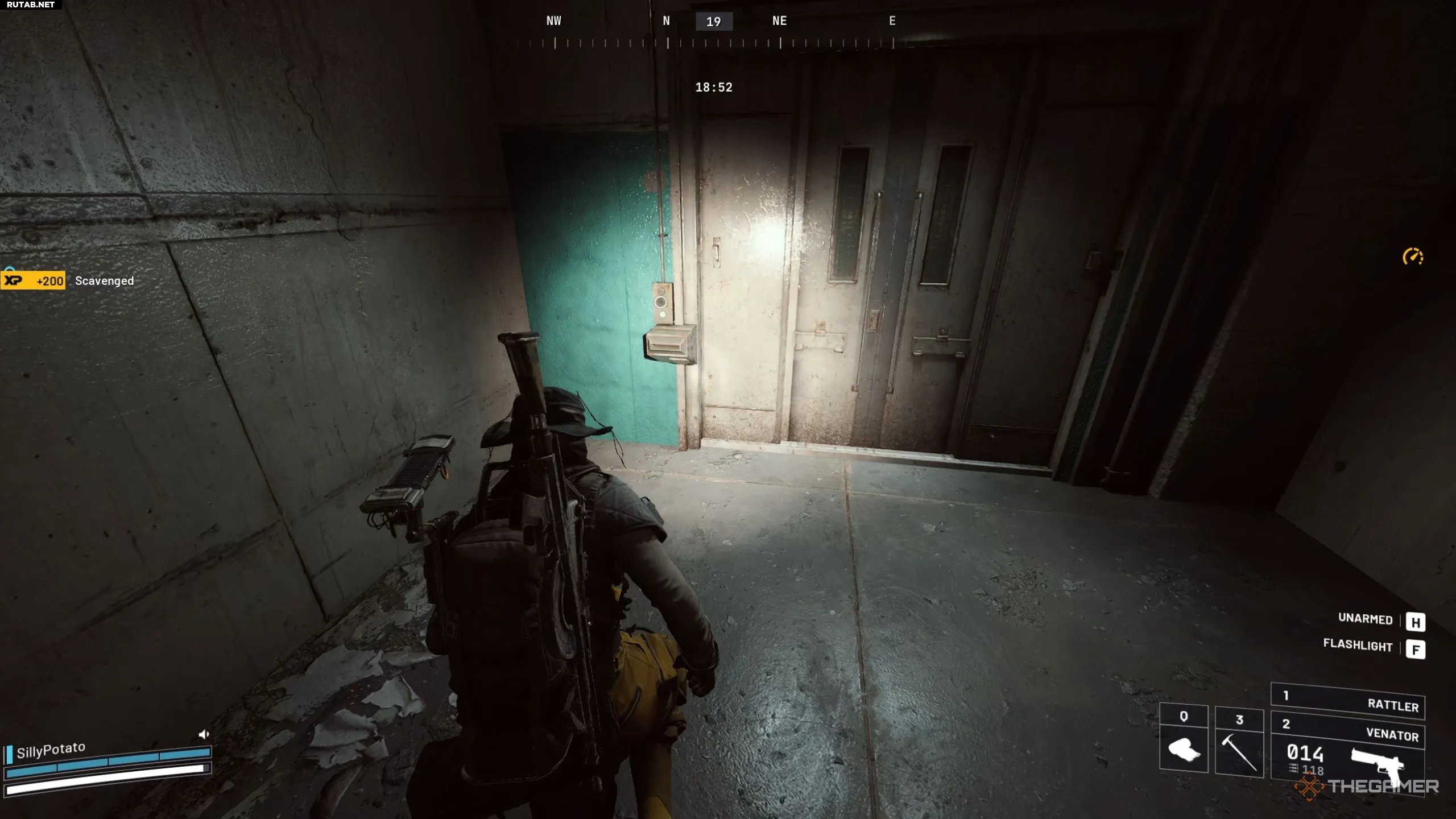 Подойдите к южному краю здания, где увидите лестницу, ведущую на верхний этаж через чёрный вход. Поднимитесь и войдите в первую комнату, затем поверните направо.