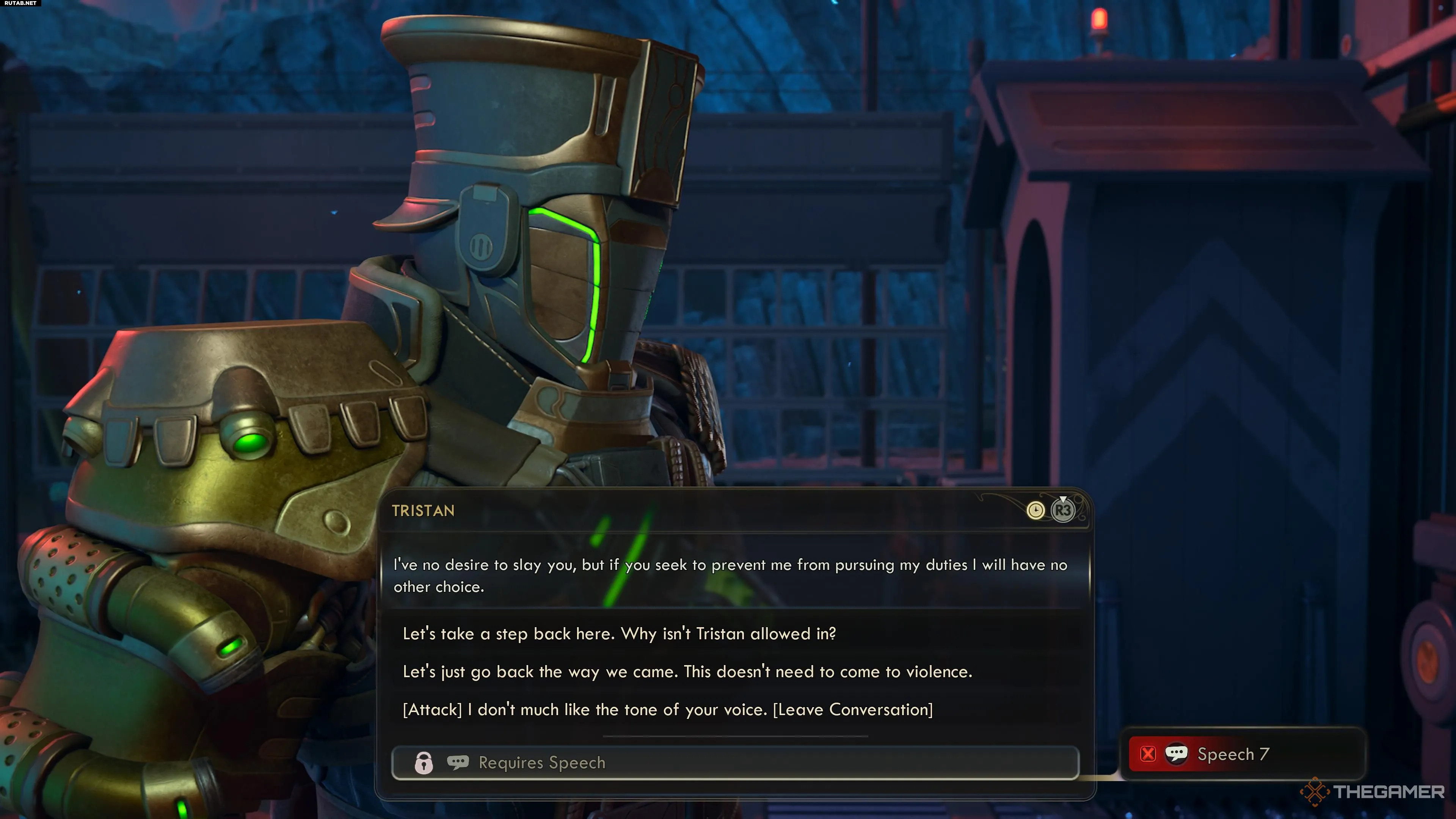 Для этого потребуется как минимум 5 очков Красноречия, чтобы заставить его отступить. Это позволит пощадить Вергилия и заставит Тристана усомниться в методах Протектората. Не настолько, чтобы перейти на другую сторону, но достаточно, чтобы начать стремиться к его улучшению. Если проверка не удастся, вам придётся сразиться с Вергилием и силами Протектората, которых он привёл с собой. Независимо от вашего выбора, вы получите Продвинутый набор модификаций Тристана в качестве награды.