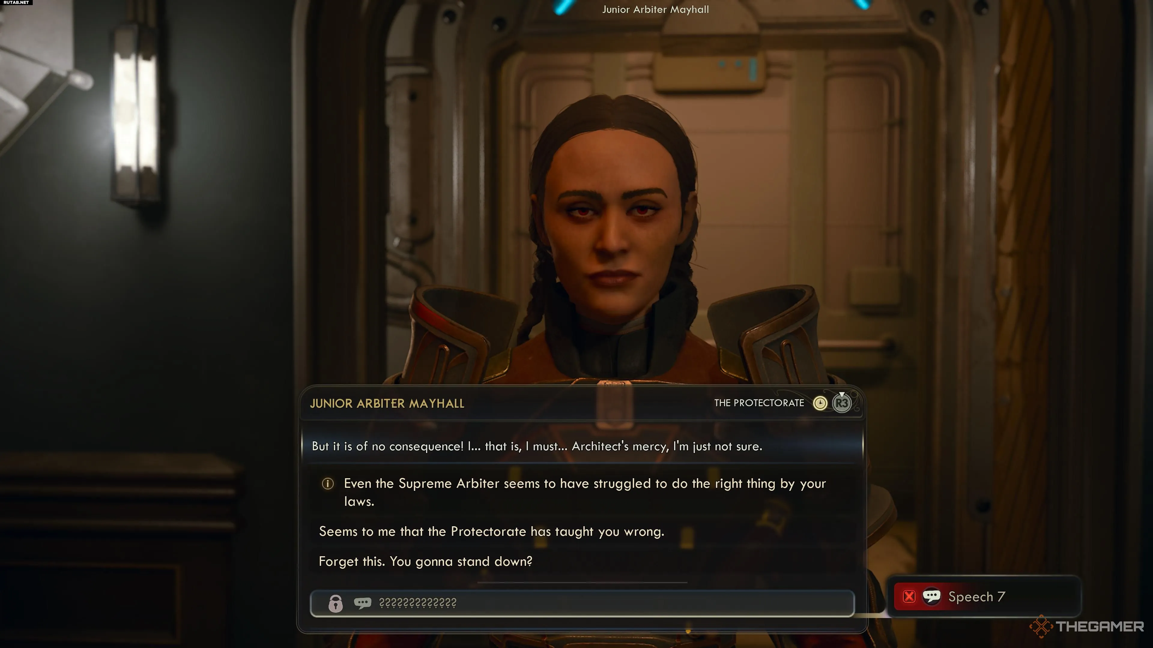 Однако у вас нет времени осмыслить это открытие, поскольку из лифта появляется другой человек — младший арбитр Мэйхолл. Тристан узнаёт её, и она его тоже. Как и Перро до неё, Мэйхолл знает о присутствии Тристана и намерена задержать его за умышленное игнорирование вызова Консула и явное нарушение законов Протектората, по возможности — мирным путём.