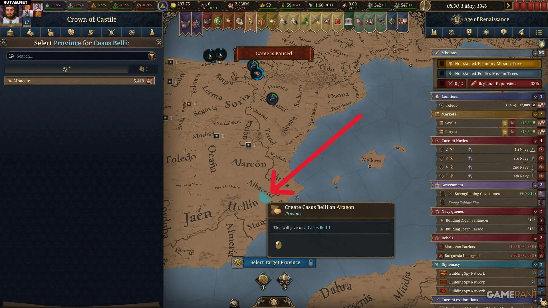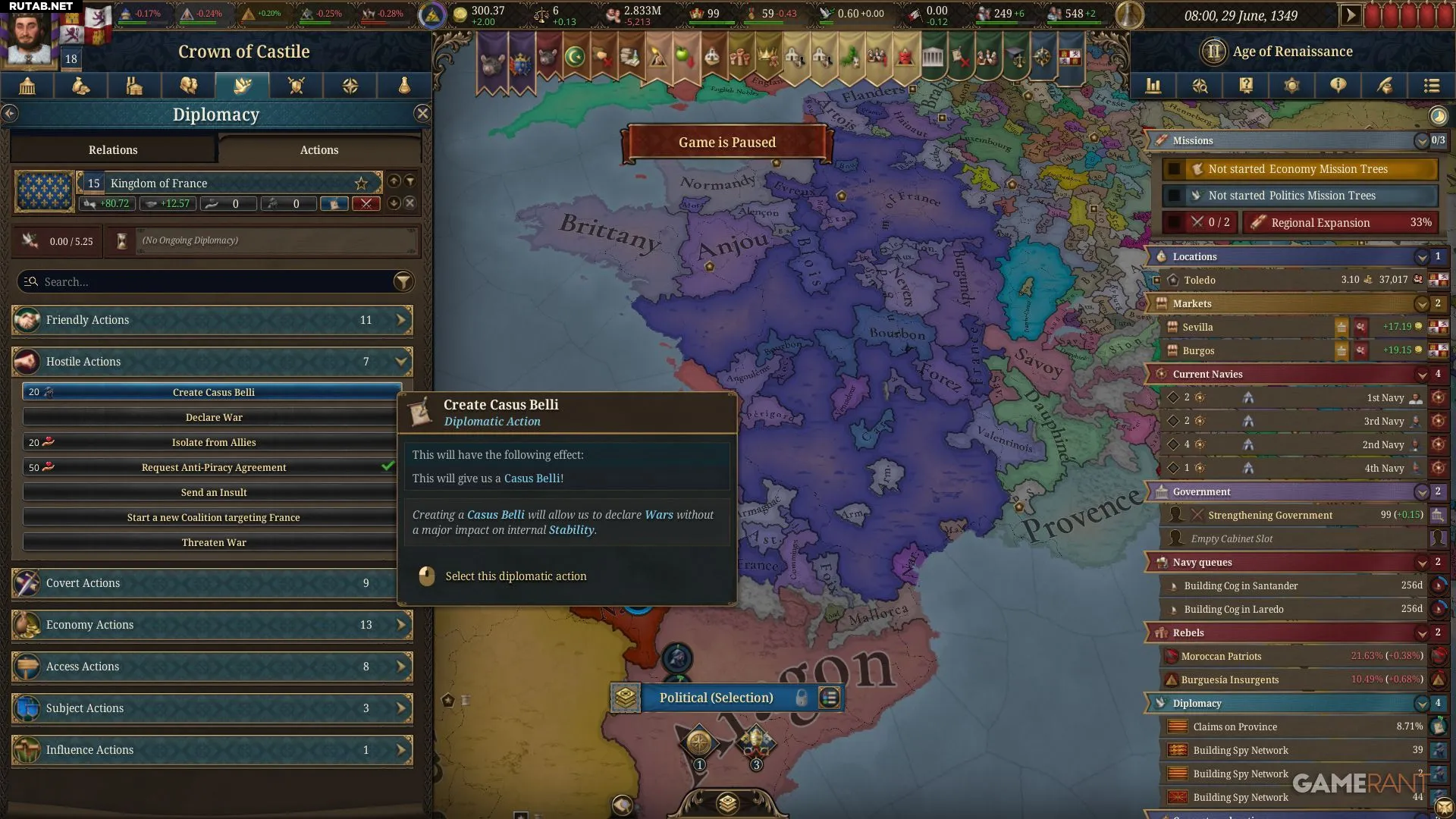 Как только набрано 20 шпионов, можно начинать создание претензии. Вернитесь в меню, кликнув на нацию и выбрав «Создать казус белли» из списка «Враждебные действия».