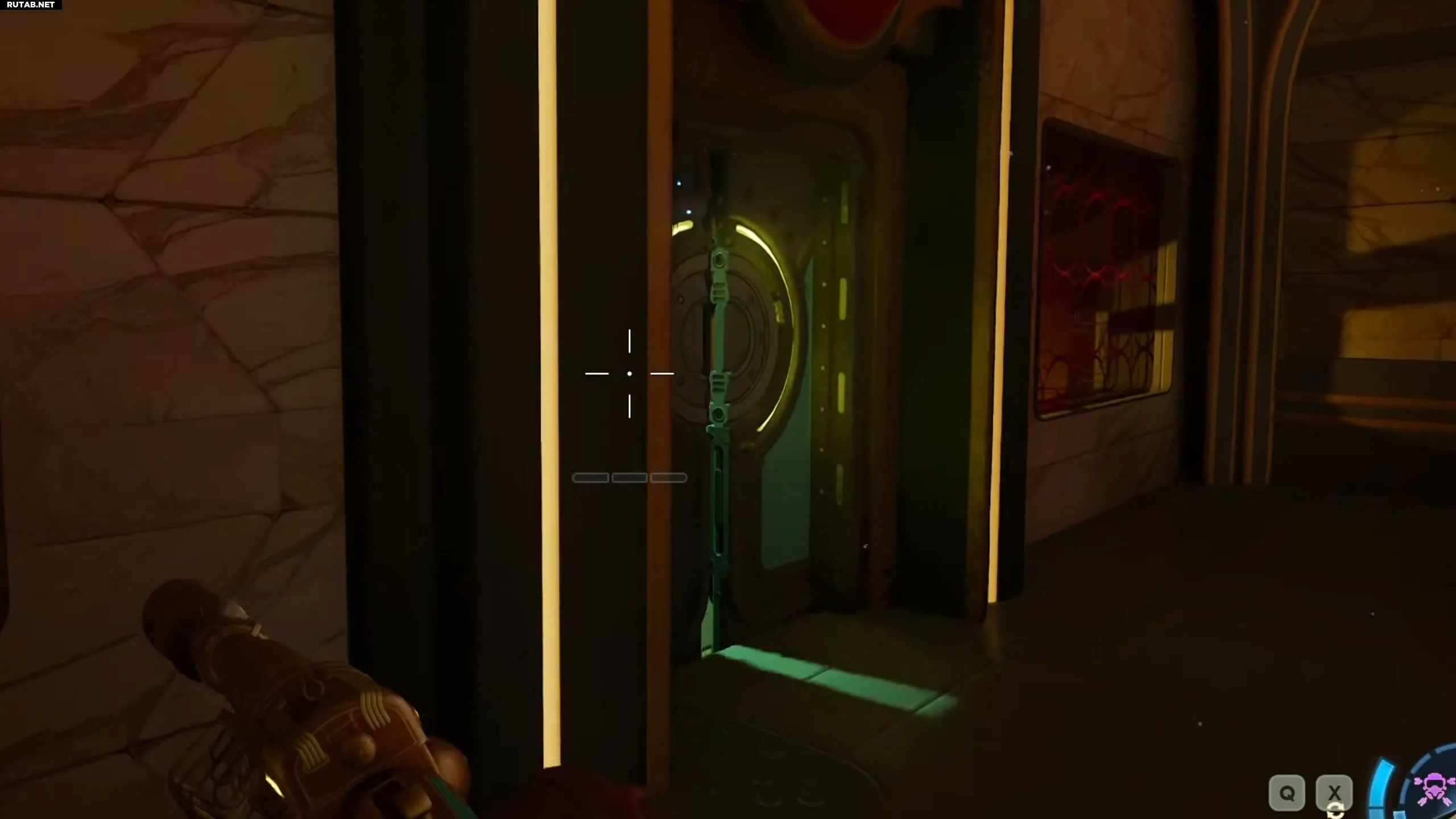 Поднимитесь по лестнице и окажетесь в большом зале. Устраните врагов и найдите выделенные жёлтым цветом уступы и полки слева от входа, по которым можно забраться на верхний этаж. На скриншоте ниже я отметил маршрут.