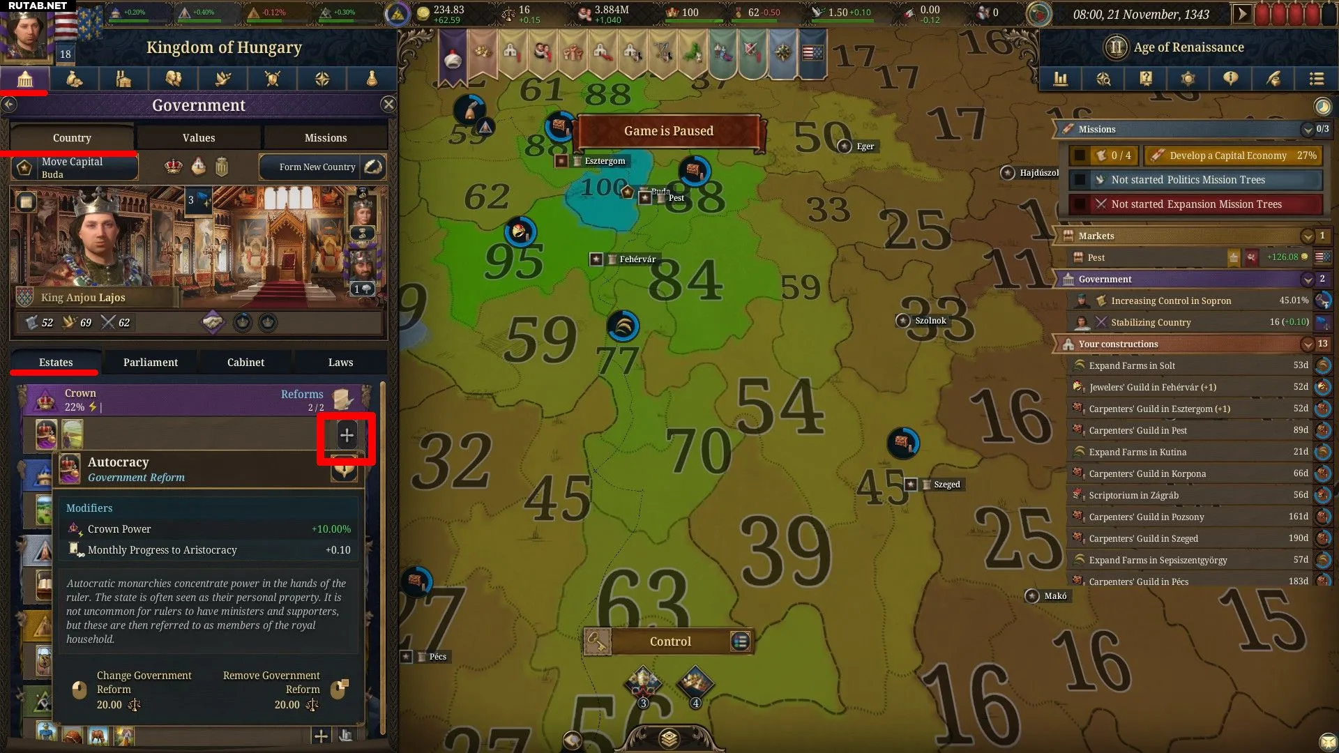 Некоторые правительственные реформы, такие как «Автократия» и «Королевский указ», дают +10% к коронной власти и обеспечивают мгновенное усиление. Чтобы установить реформу, перейдите на вкладку «Правительство», откройте меню «Сословия», нажмите на плюс под короной и выберите нужную реформу.