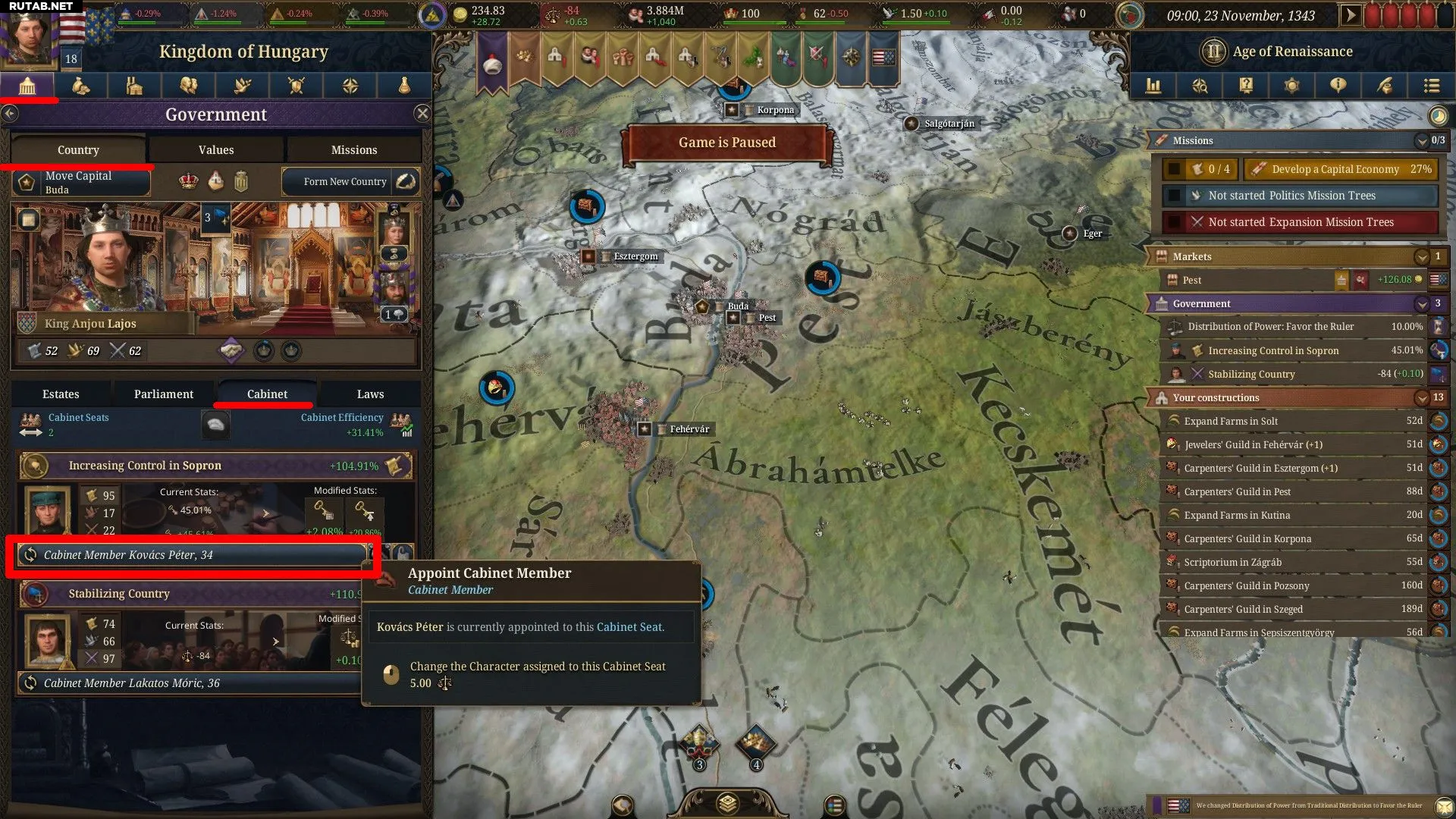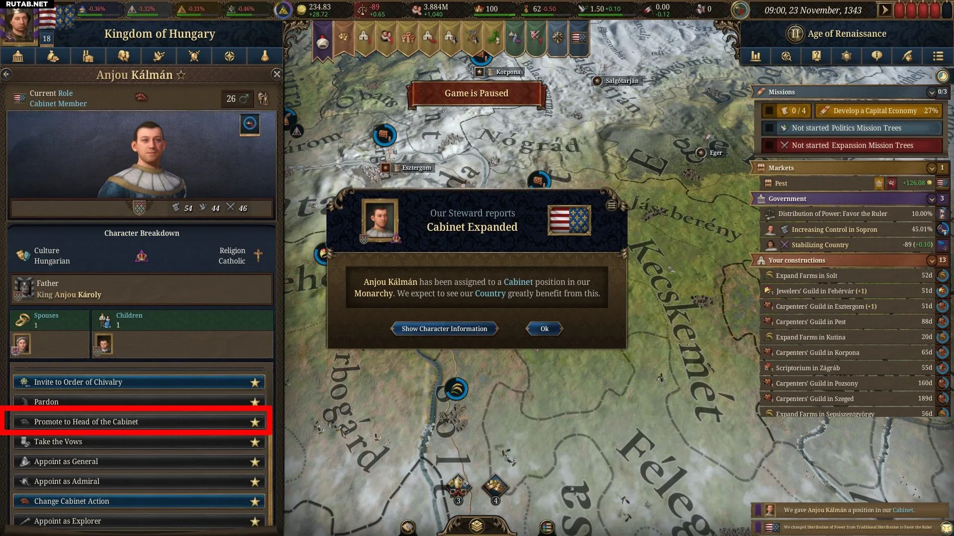 Наличие члена кабинета из королевского владения даёт +12.50% к коронной власти, а его назначение на должность главы кабинета добавляет ещё +25%. Чтобы назначить такого советника, откройте вкладку «Правительство», перейдите в меню «Кабинет», нажмите на поле под портретом и выберите персонажа из королевского владения. Затем можно повысить его до главы кабинета, нажав на его портрет и выбрав соответствующую опцию.