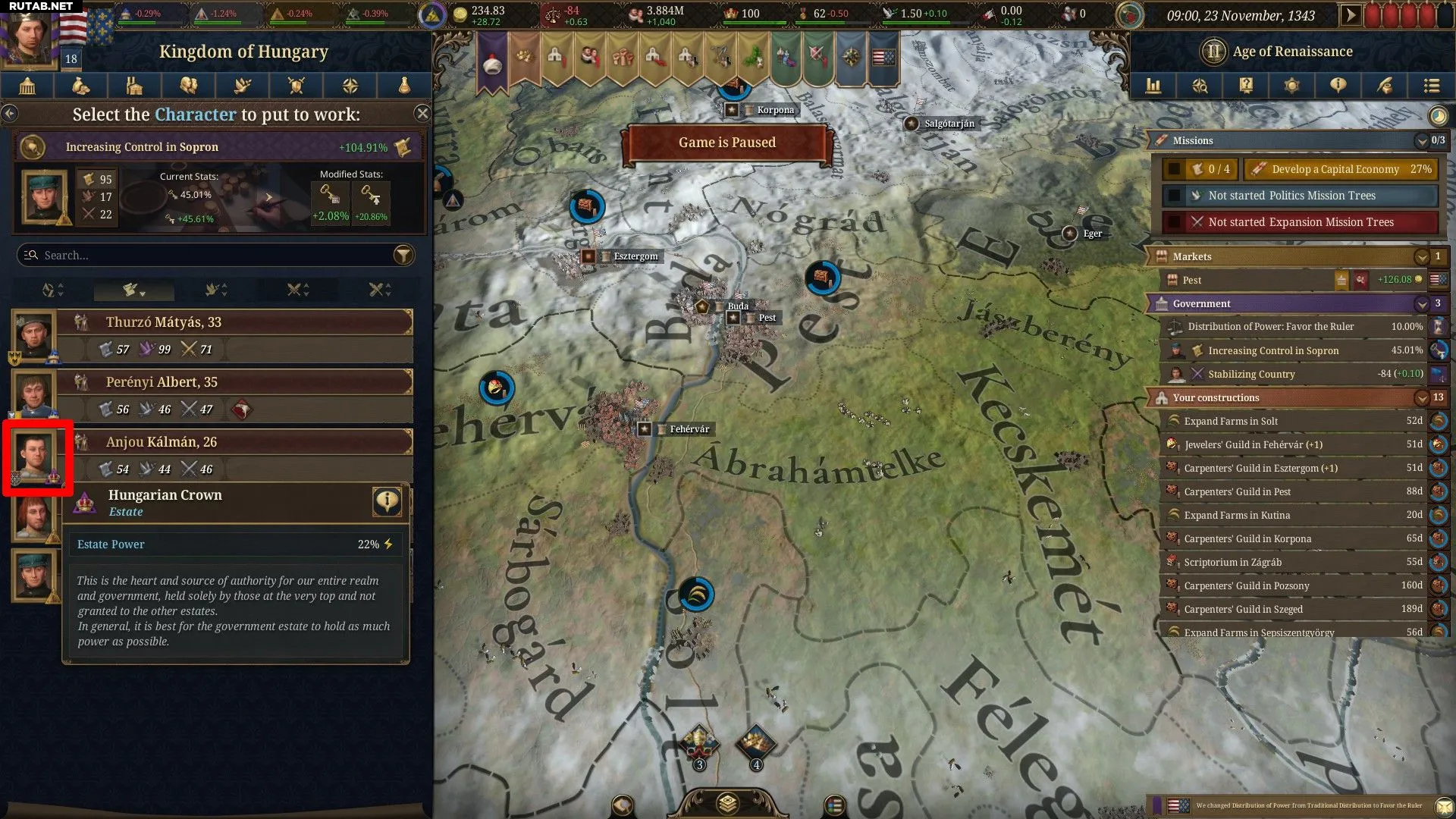 Коронная власть также влияет на эффективность кабинета и расходы на содержание зданий. Все эффекты текущего уровня коронной власти можно увидеть, выбрав вкладку «Правительство», открыв меню «Сословия» и наведя курсор на процентное значение под короной.