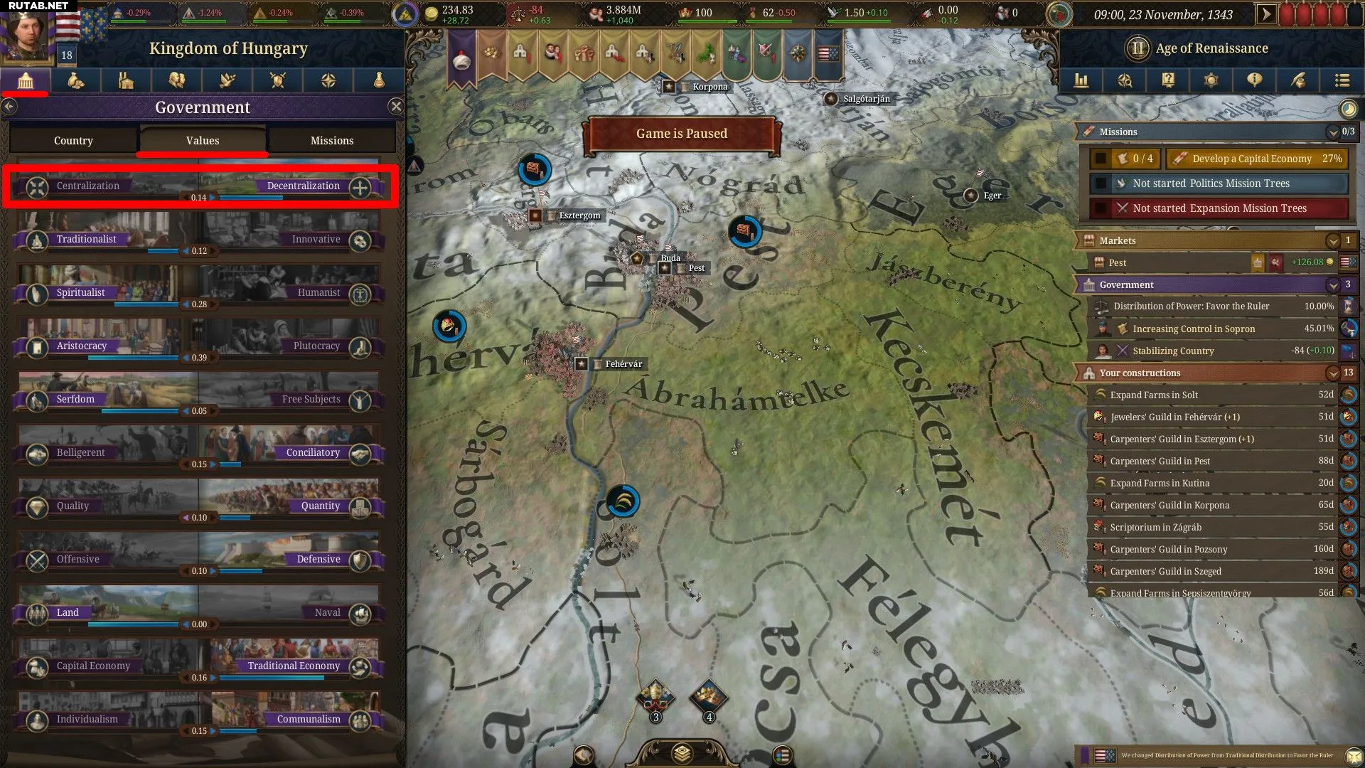 Общественная ценность «Централизация» дарует +50% к коронной власти — это колоссальный бонус. Хотя переход от децентрализации к централизации может занять много времени, игрокам стоит постоянно искать возможности для увеличения ежемесячного прогресса в сторону централизации и блокировать прогресс децентрализации. Эти возможности разнообразны: от предоставления и отзыва привилегий в меню «Сословия» на вкладке «Страна» до других событий. Отслеживать прогресс по централизации можно в меню «Ценности» на вкладке «Правительство».