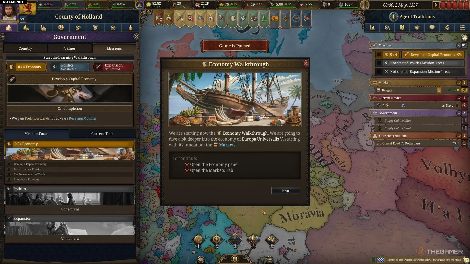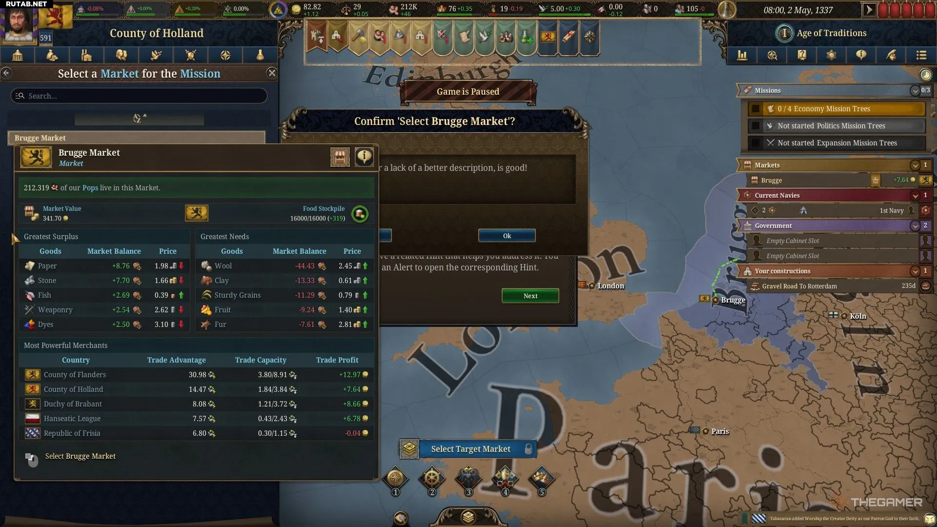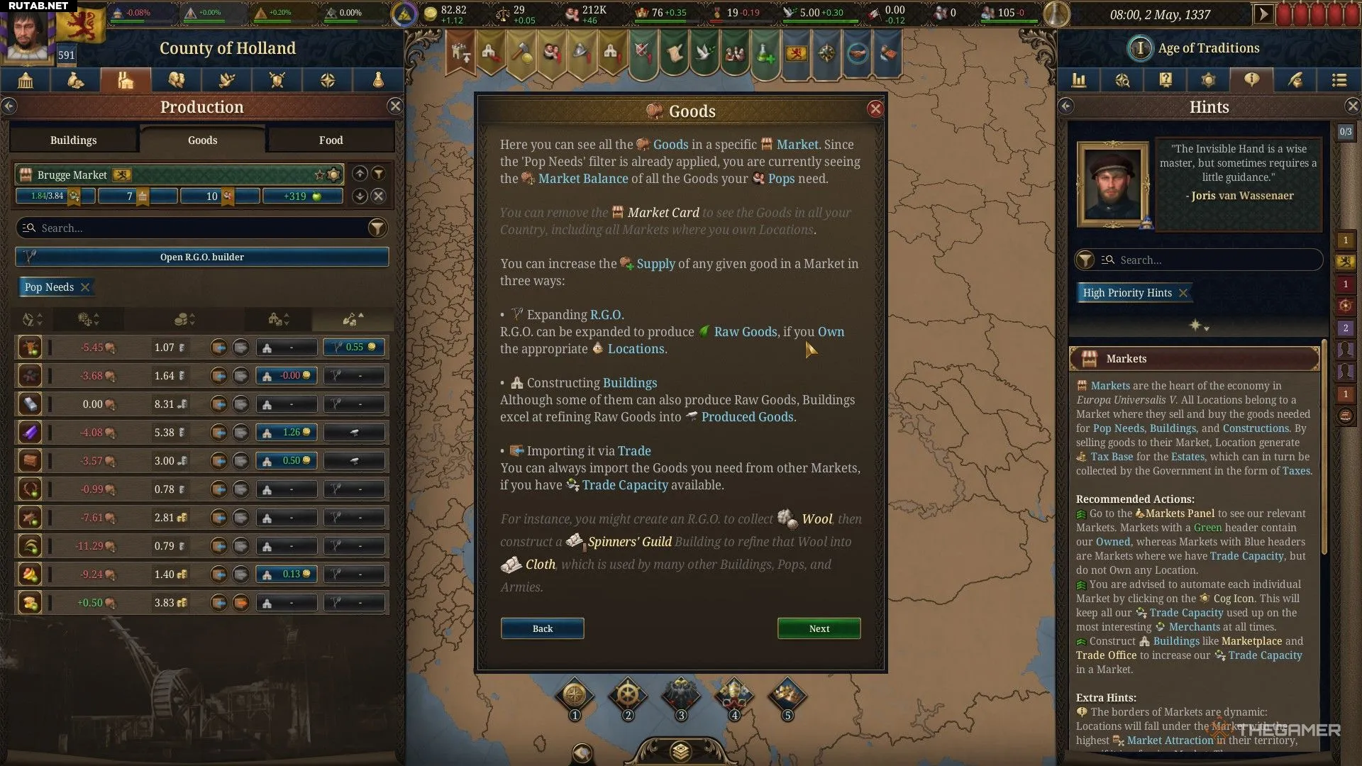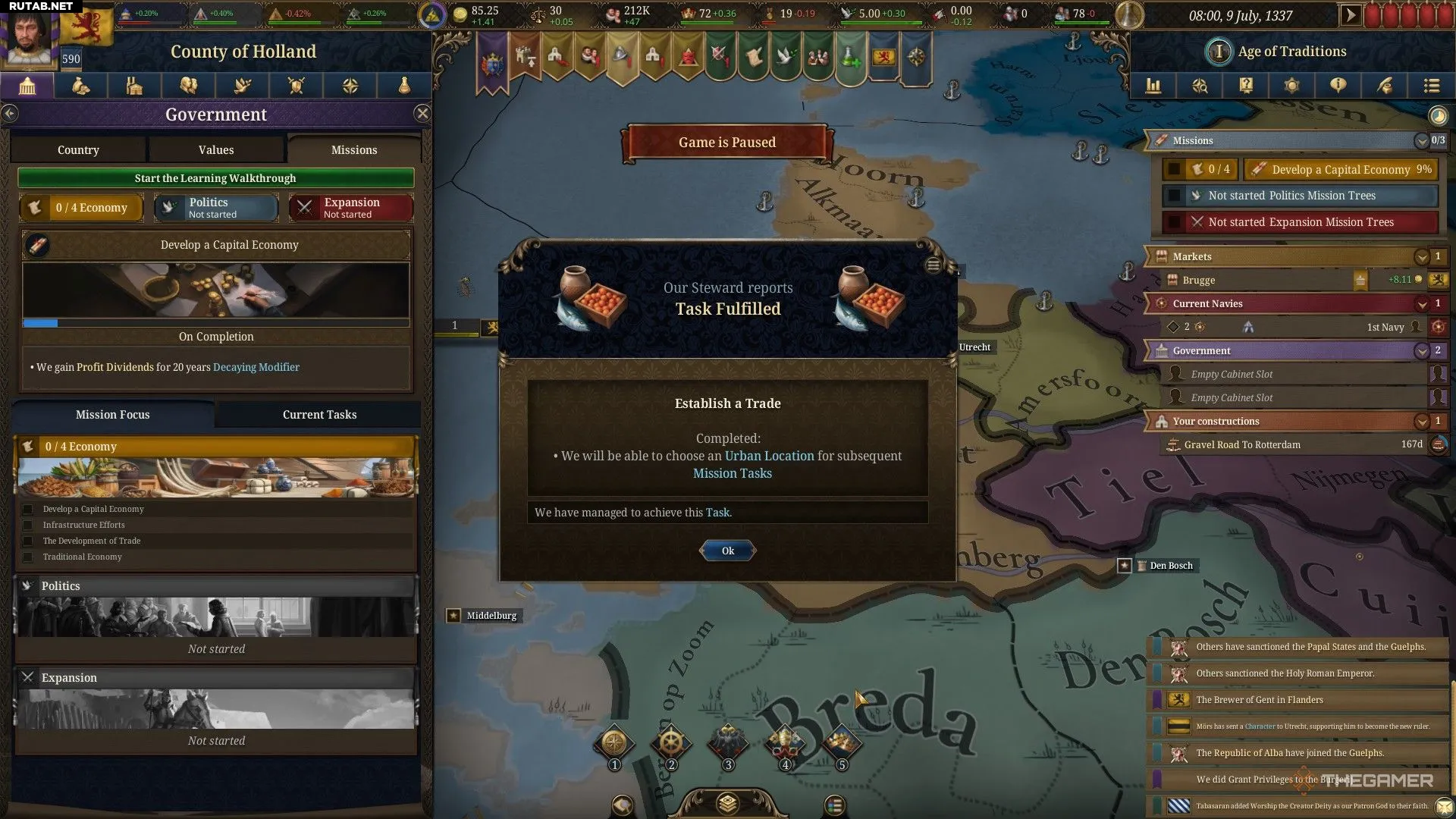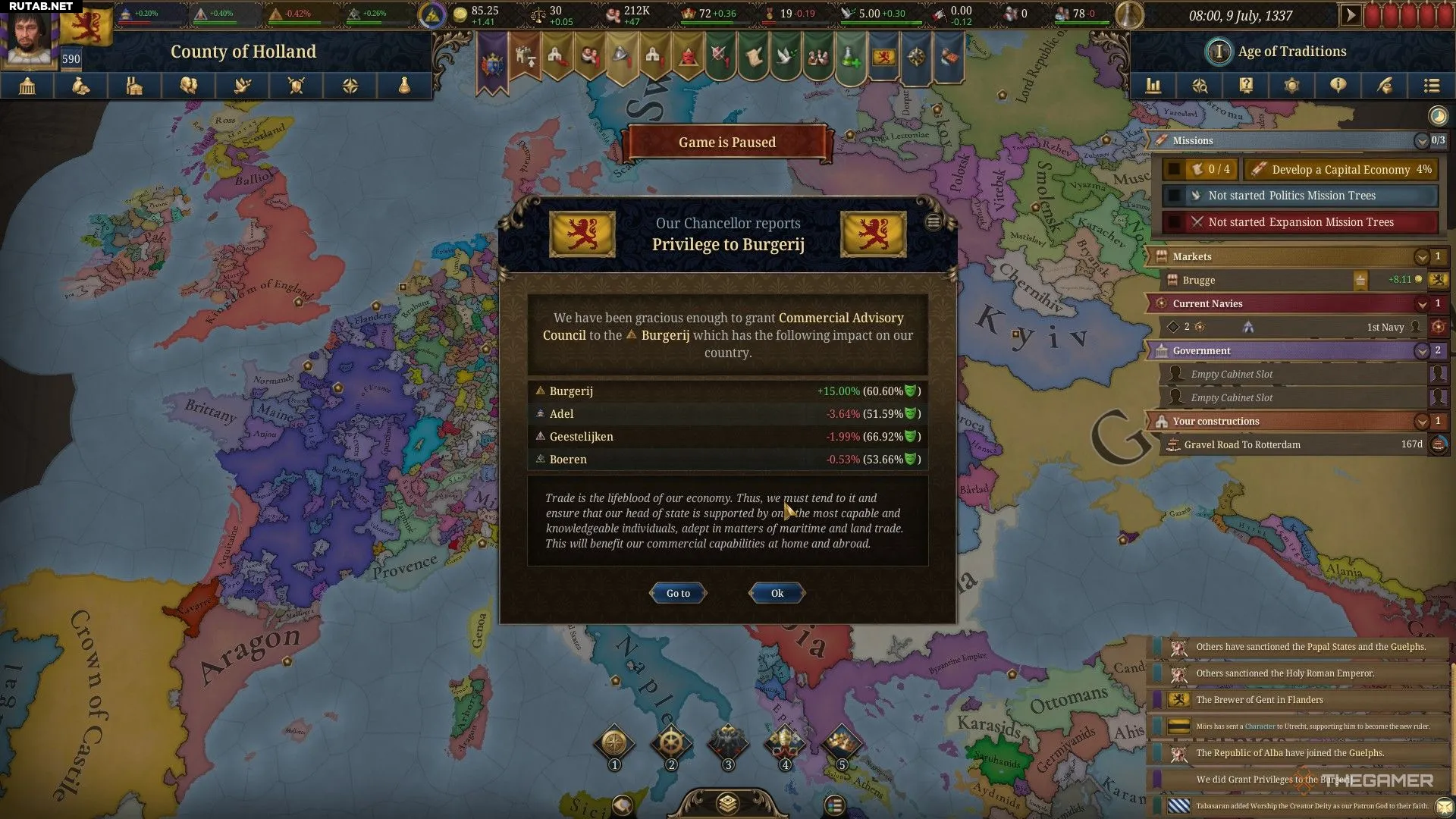 Вашей первой задачей будет предоставить привилегии буржуазии — ремесленникам и торговцам вашей страны, чтобы повысить их удовлетворённость до 60%. Вам также потребуется наладить торговлю, изучив вкладку «Рынки» для начала процесса импорта и экспорта. Обе эти задачи выполняются мгновенно.