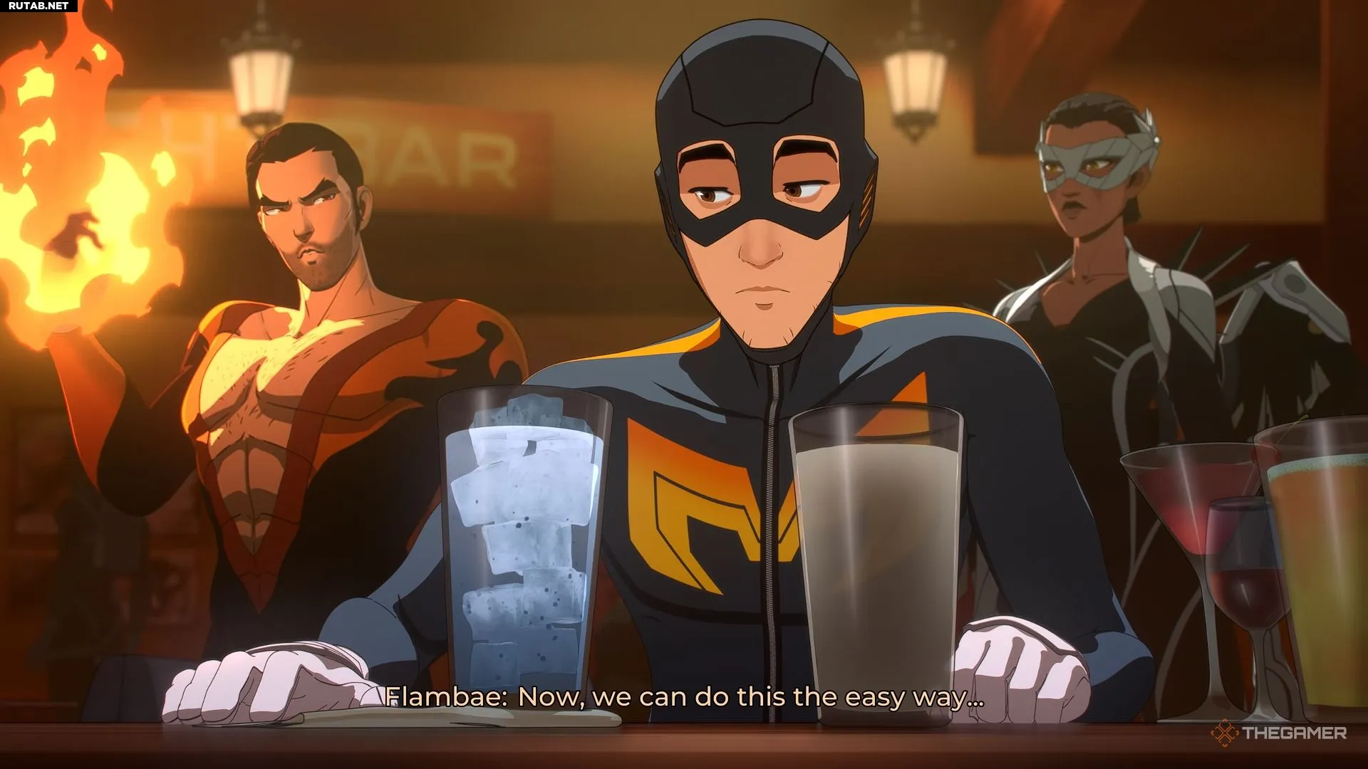 Поскольку Флэмбэ — горячая голова с огненными способностями, бросок воды в него — лучший способ деэскалации ситуации. Однако он поскальзывается и падает, врезаясь в стойку бара и теряя при этом зубы. Купе и Панч-Ап убегают, чтобы оказать ему медицинскую помощь, а бармен просит Роберта уйти.