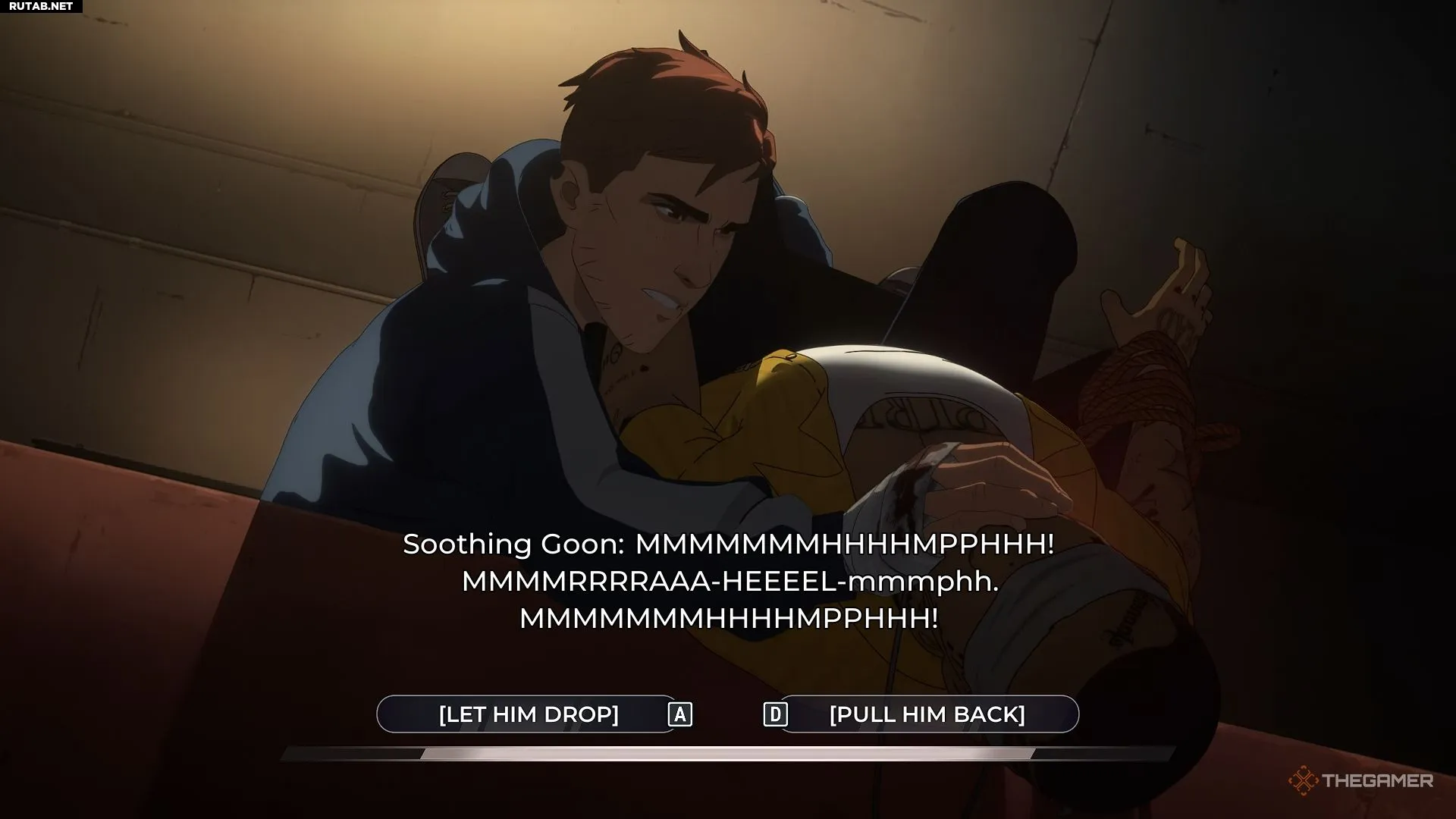 Если вы позволите ему упасть, громила приземлится в мусорный контейнер. Он выживет, но только благодаря матрасу Роберта, оказавшемуся в нужном месте. Хотя прямых последствий у этого выбора пока нет, он демонстрирует безжалостность и расчётливость Роберта. Однако продолжение этой линии поведения может испортить ваши отношения с другими персонажами и подорвать репутацию среди горожан.
