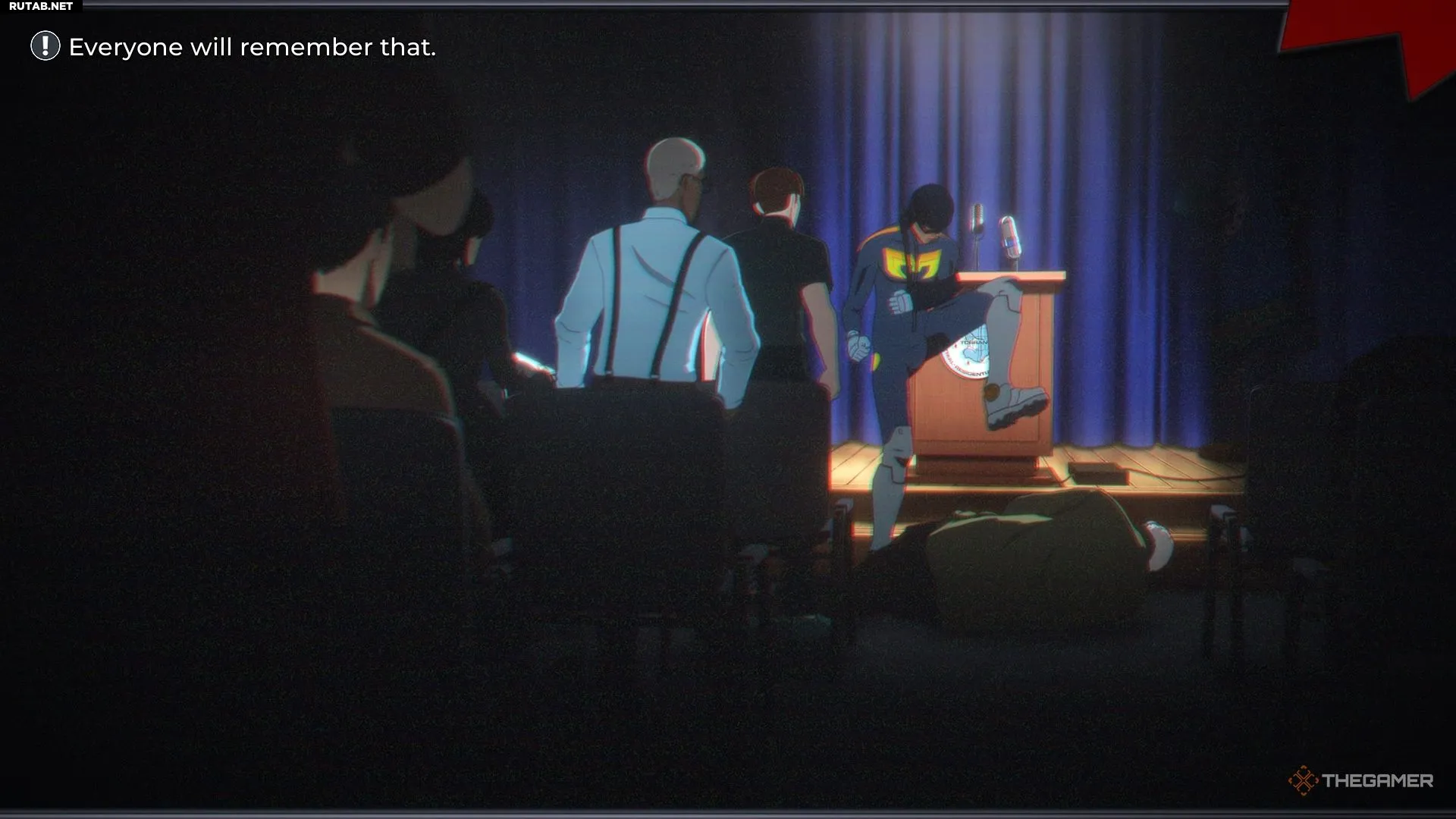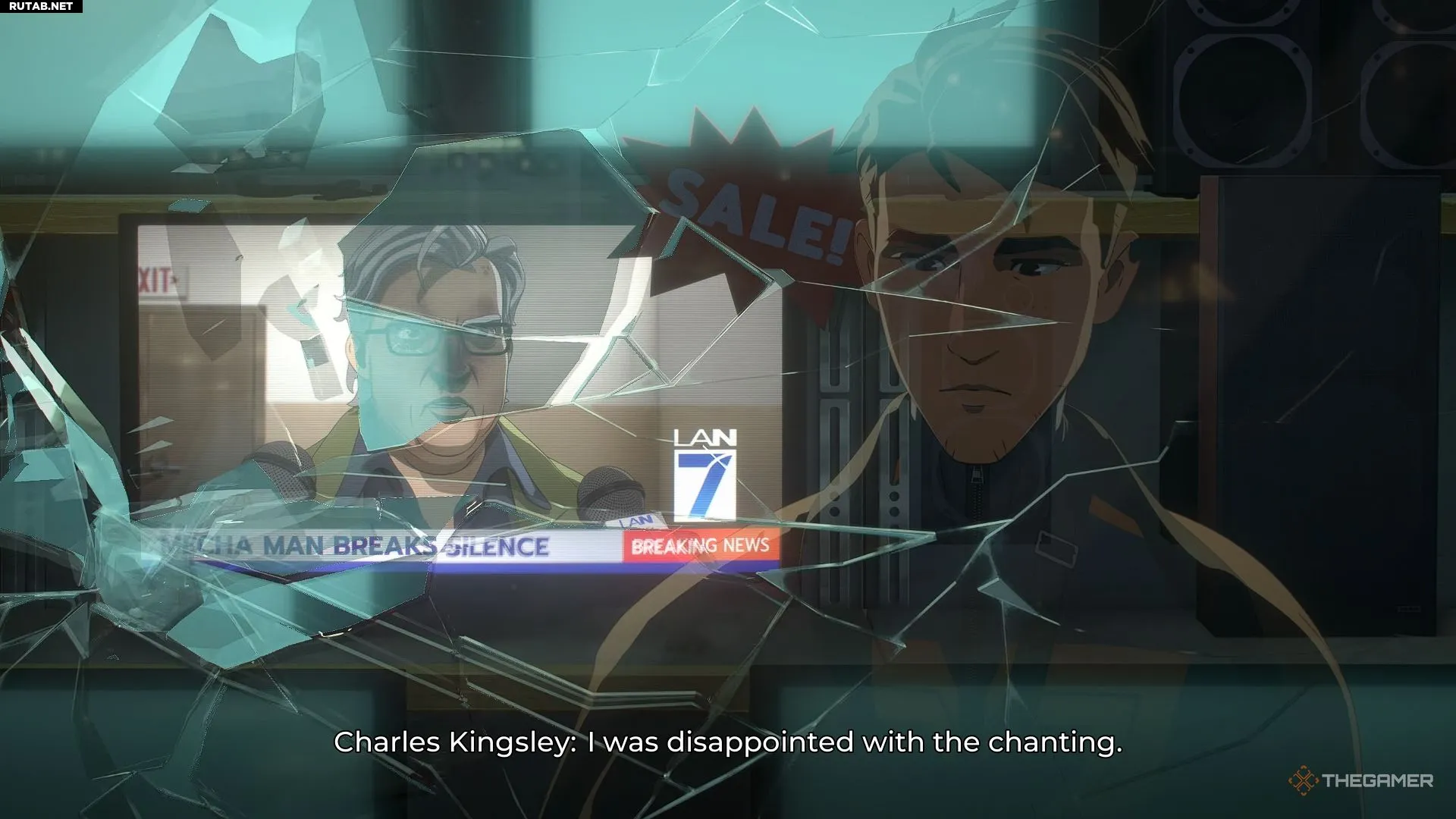 Когда Роберт надевает костюм Мехамена, вас ждут несколько событий с быстрыми нажатиями во время проникновения на склад, где обосновался Шрауд. Здесь вы встретитесь лицом к лицу с человеком в кресле. Можете обмениваться колкостями как угодно, поскольку главное решение — выбрать, пнуть или растоптать этого парня в своем мех-костюме.